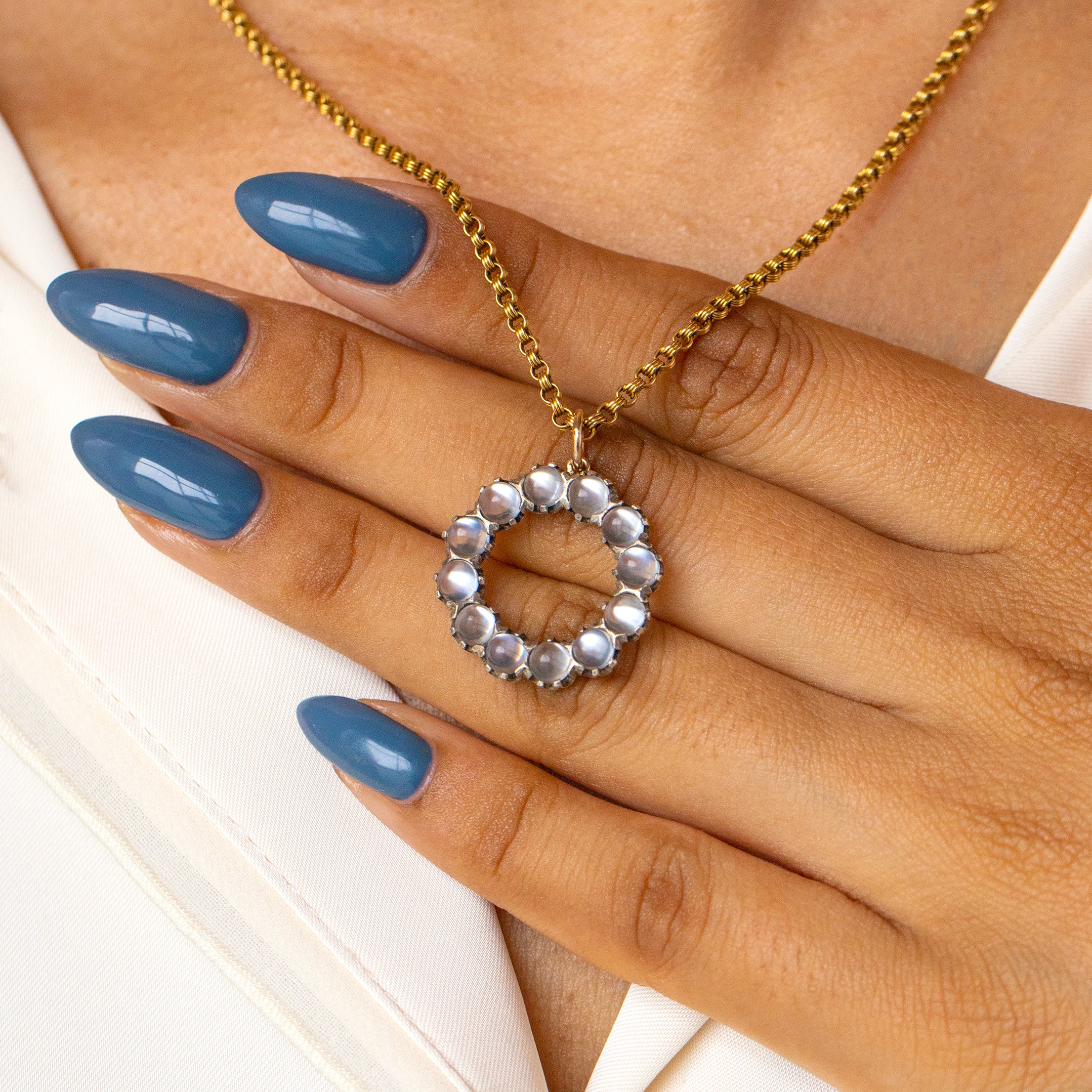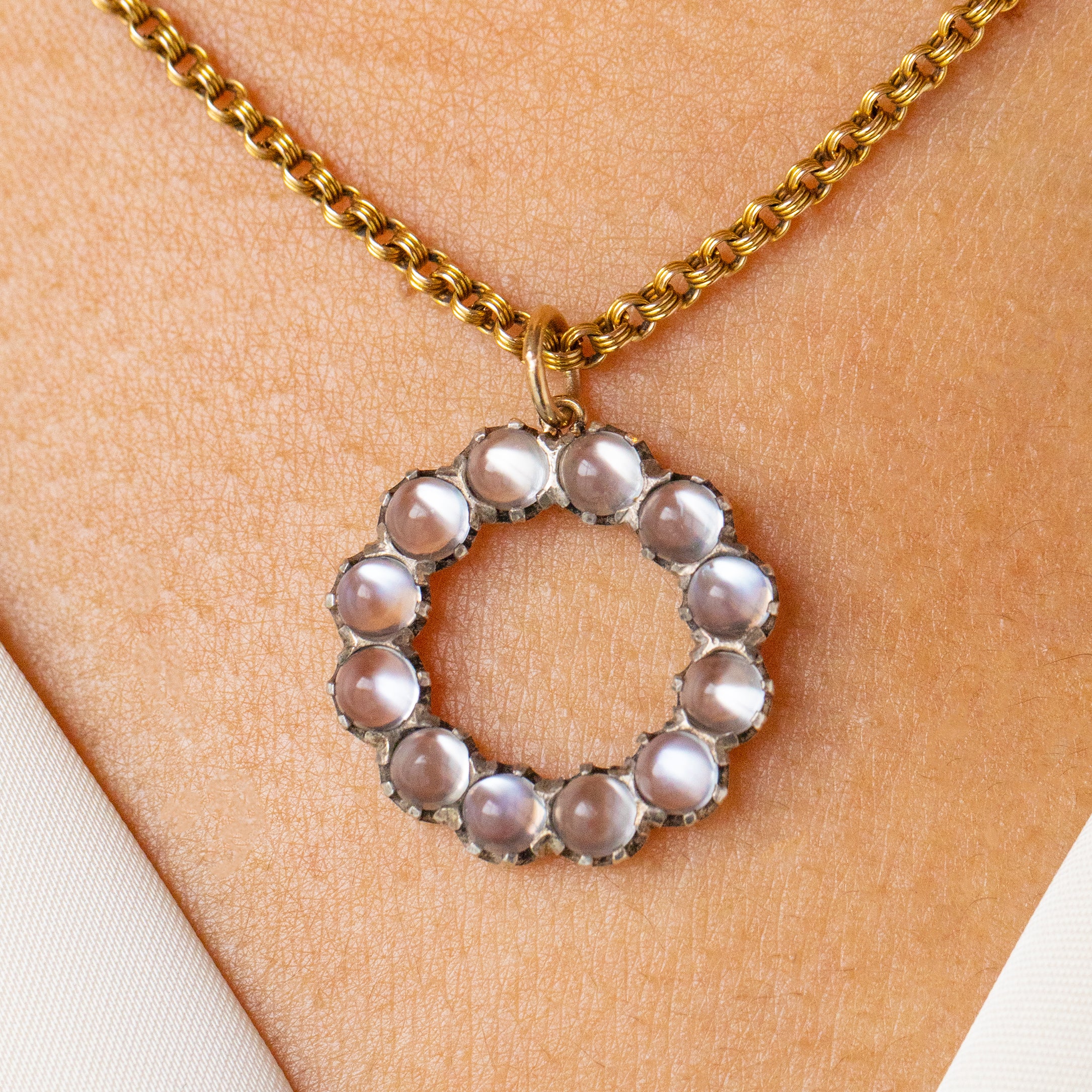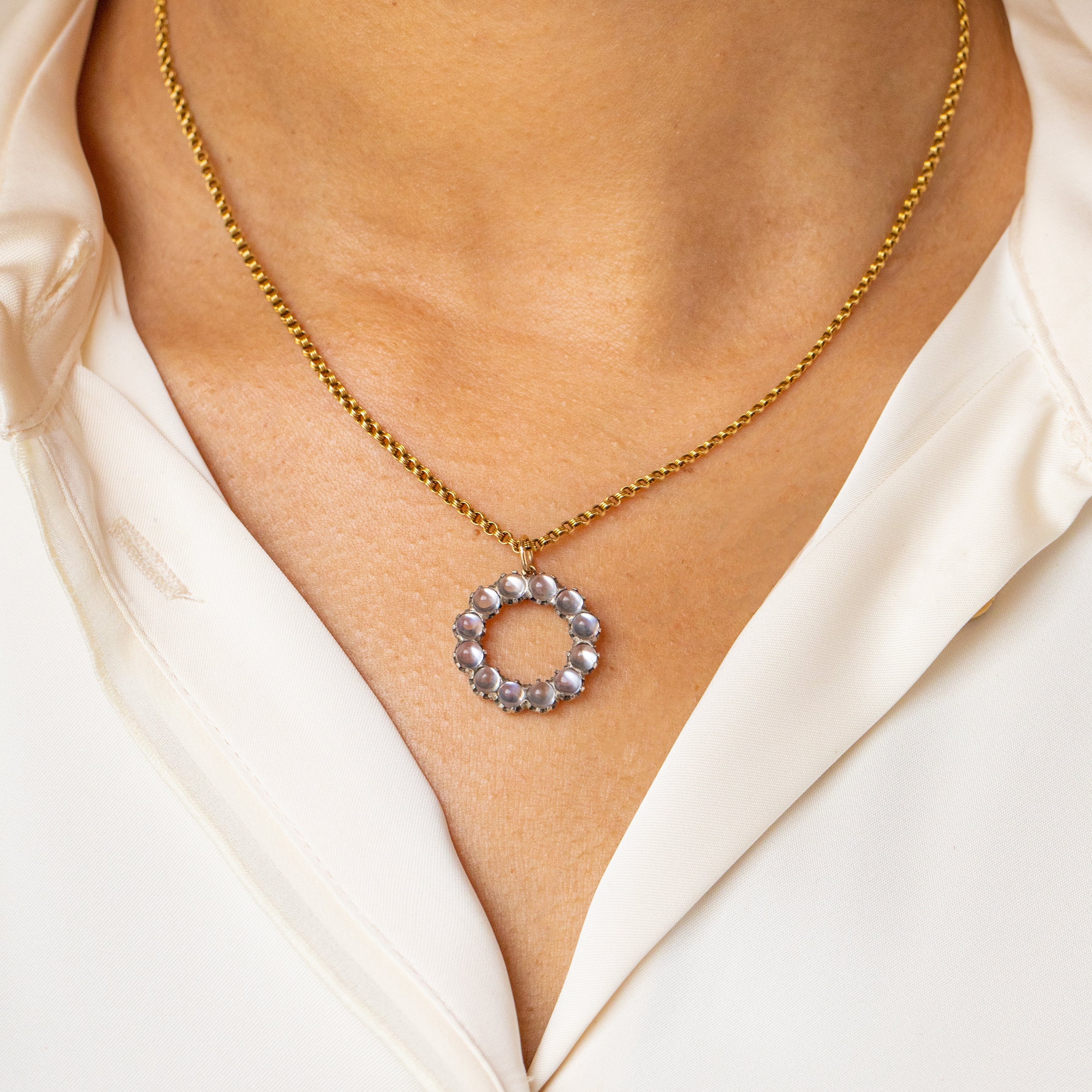 This antique Silver Moonstone roundel pendant is utterly enchanting! With a round cluster consisting of twelve plump Moonstone cabochons, with a combined carat weight of 2.40ct, you'll instantly be drawn to this piece.