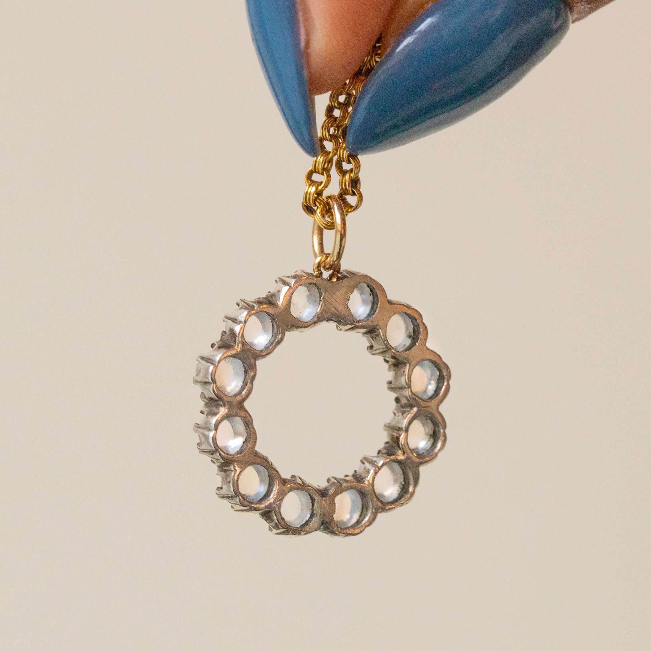 VERY GOOD. This antique Silver Moonstone cluster round pendant is in very good condition throughout. Starting life as a brooch, she has been lovingly converted into a spectacular pendant! There is some evidence of this conversion on the back of the settings, but this won't be noticeable while the pendant is worn. Her smoothy domed Moonstones are secure in their settings, and their luminosity looks magical when they catch in the light. The Silver has accrued a natural patina, adding to her antique charm. We are obsessed with this Moonstone cluster pendant, affix it to your favourite chain and cherish it for years to come!