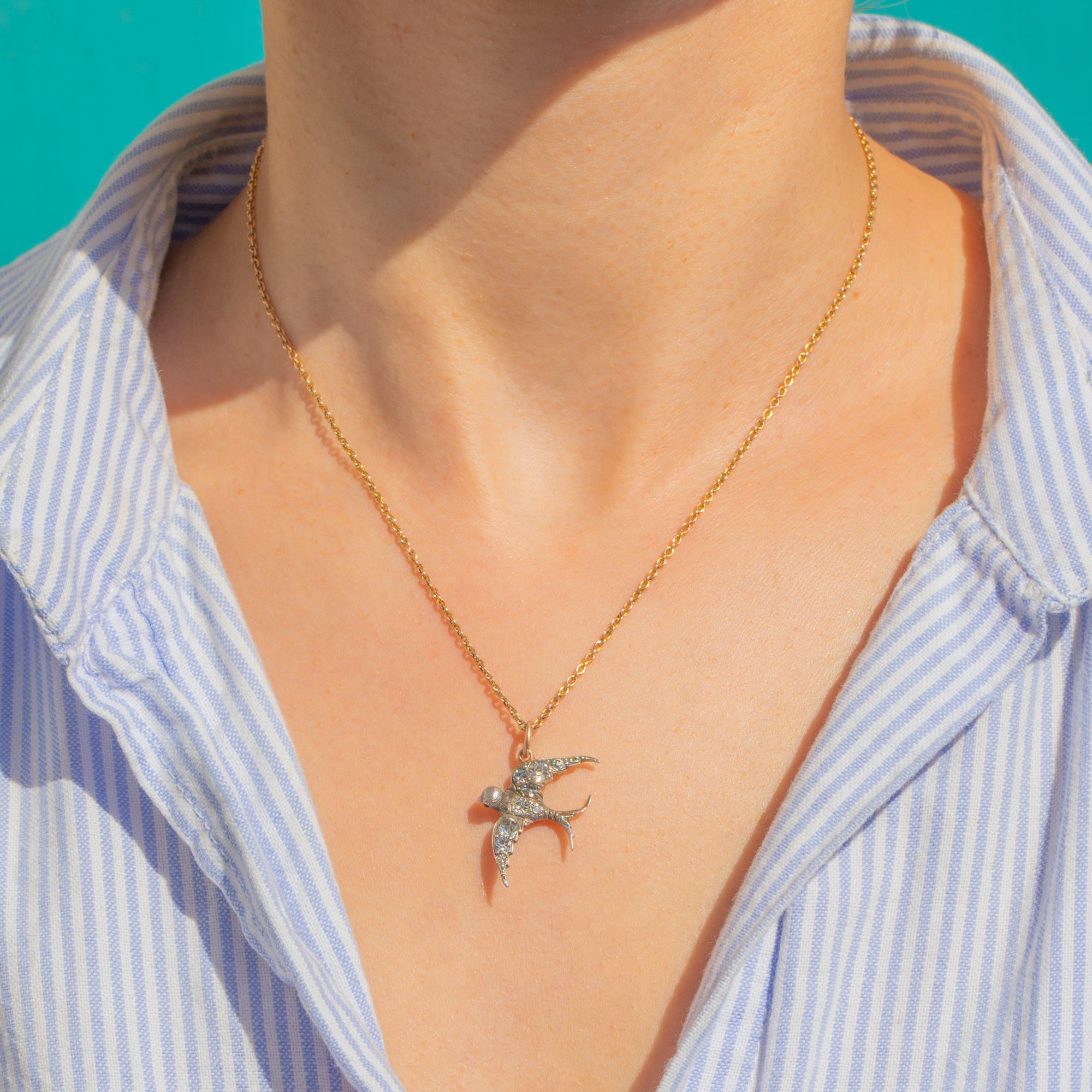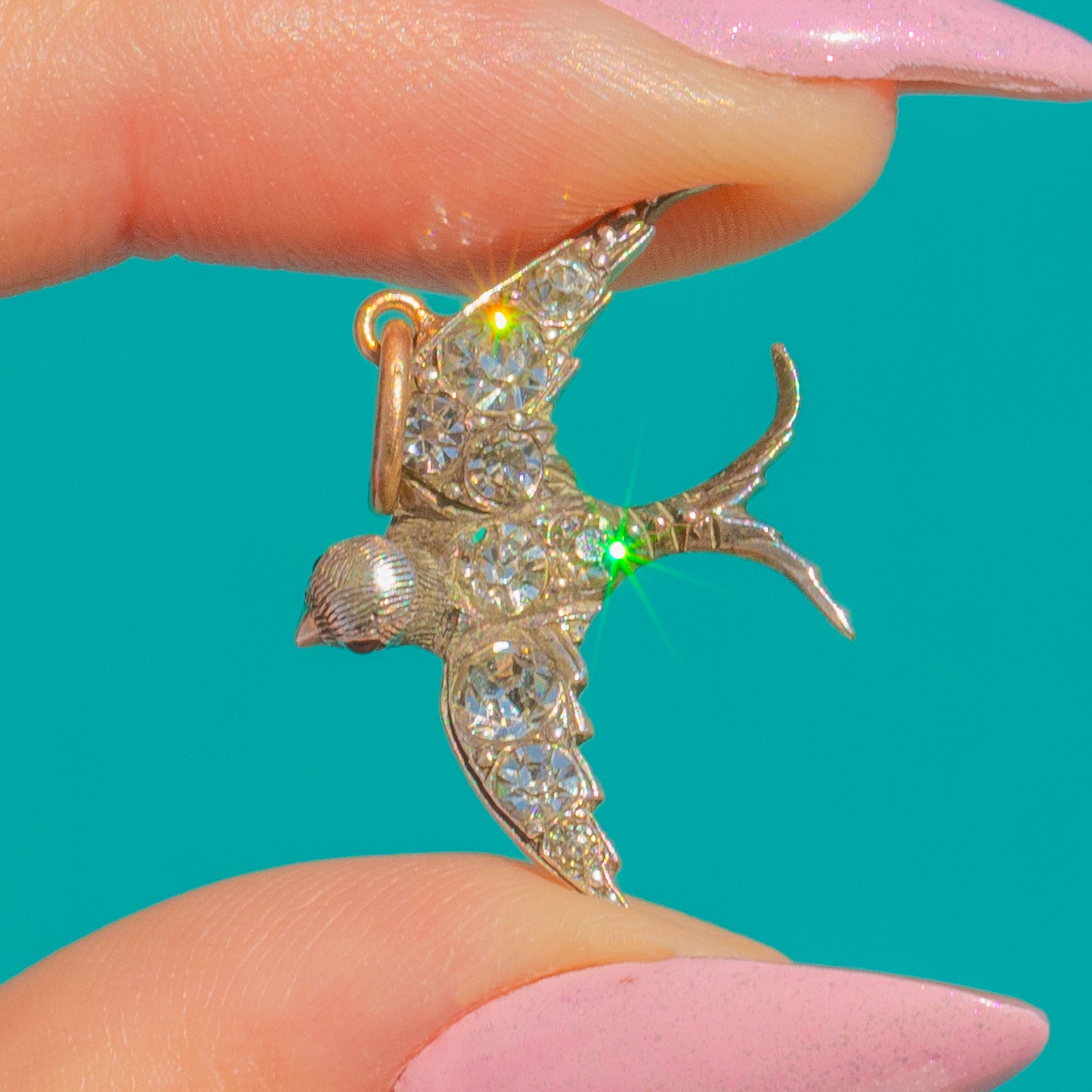 A charming Victorian Paste swallow pendant, finely crafted in bright 900 Silver with delicate pavé-set Paste that shimmer across the wings and body. The silhouette is graceful and compact, with crisp relief and subtle texturing that bring this little bird to life.