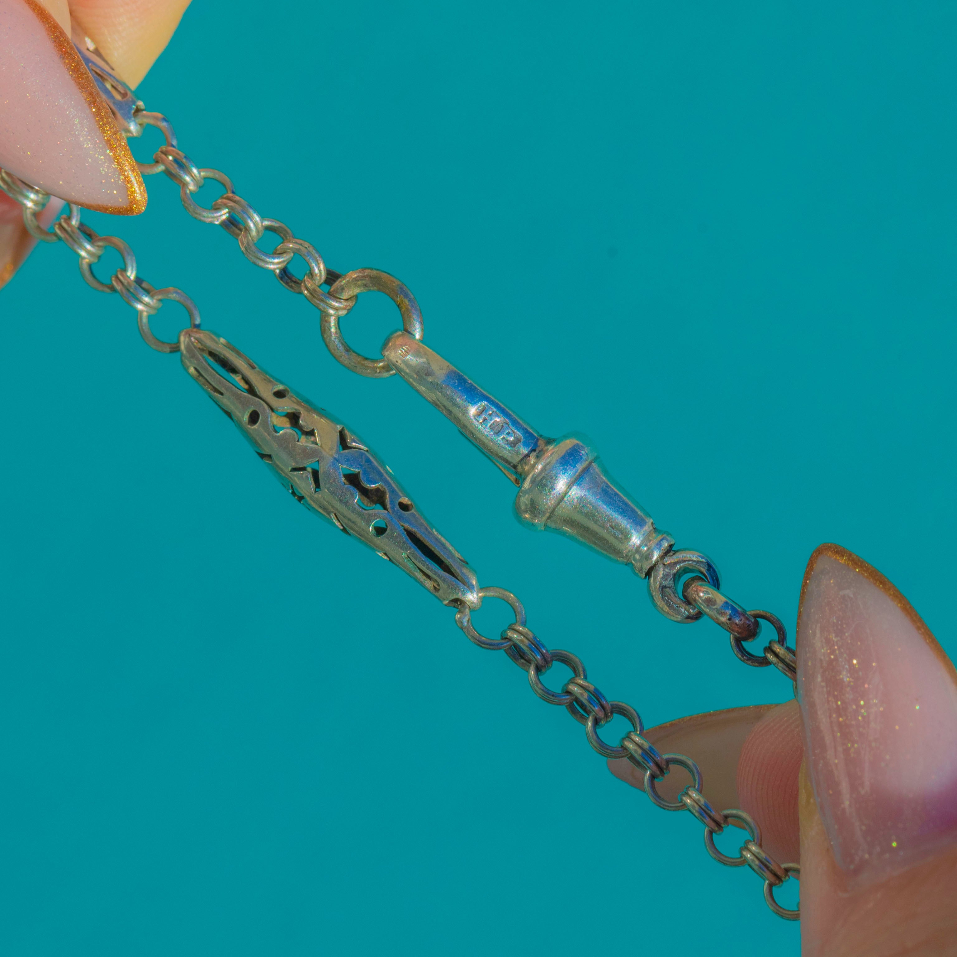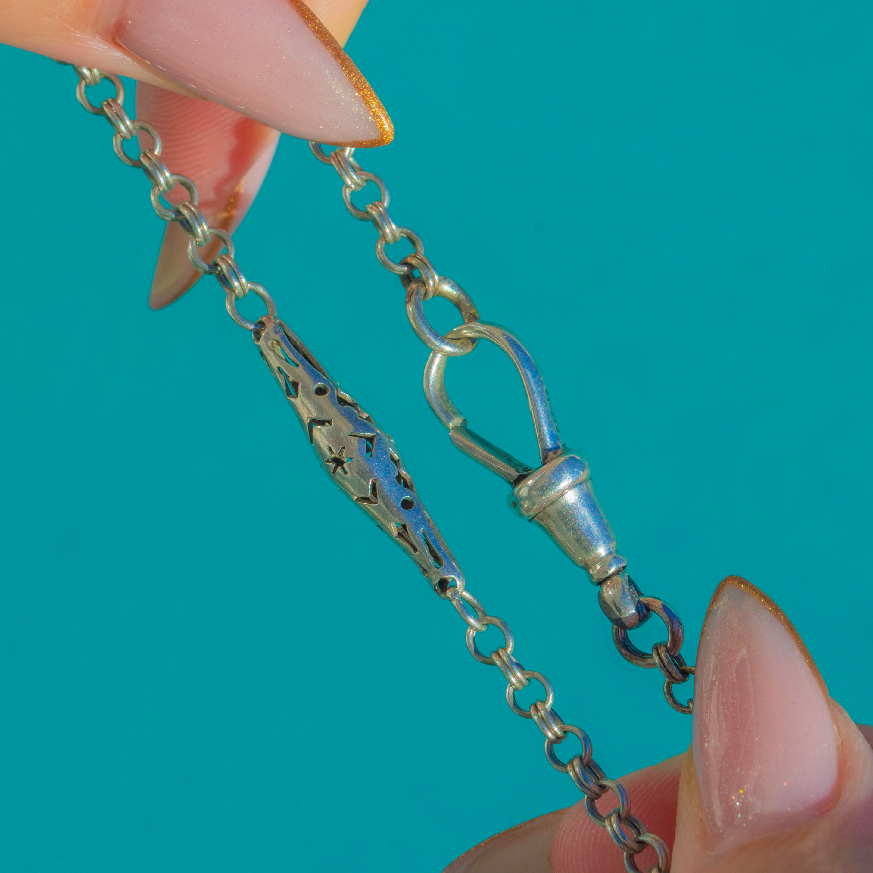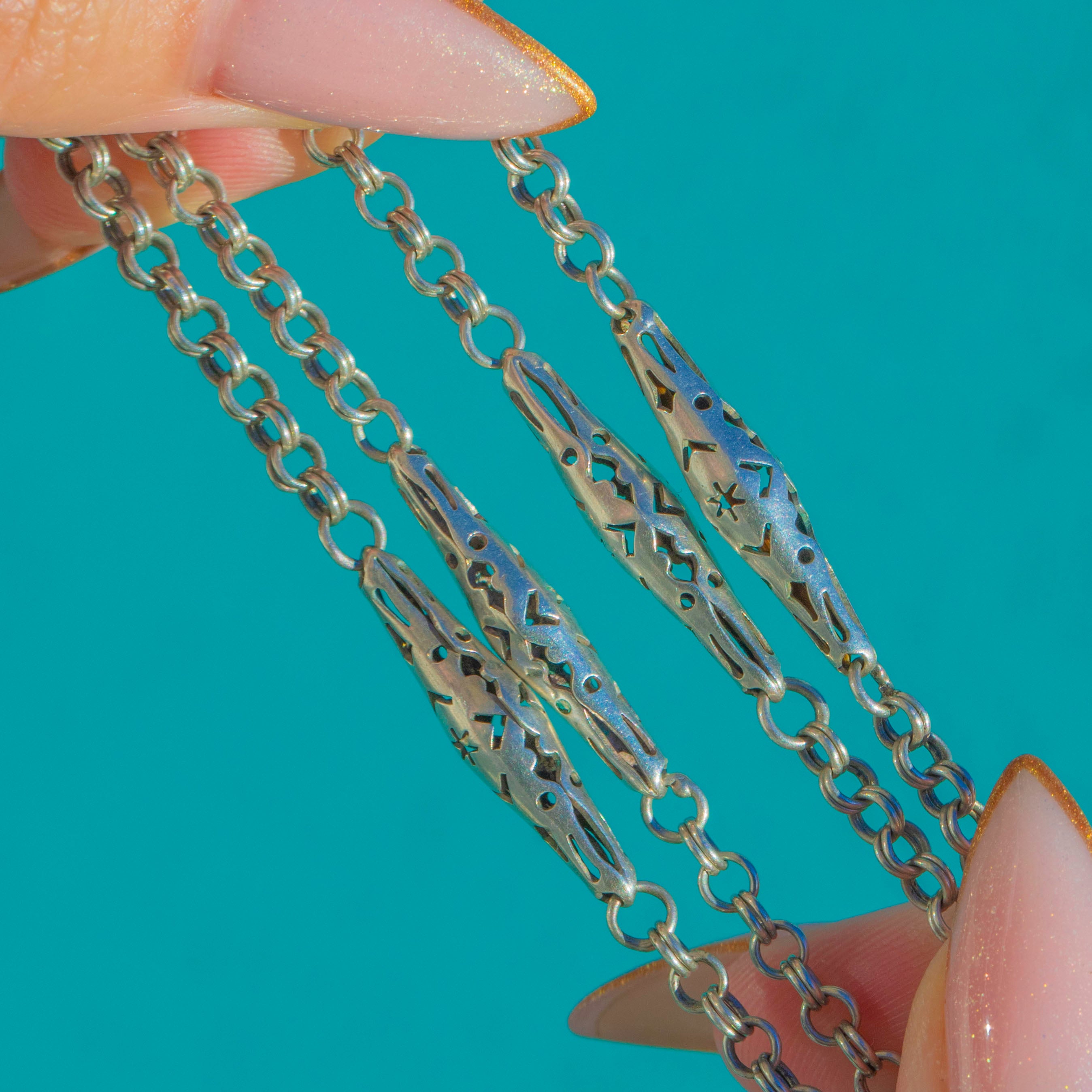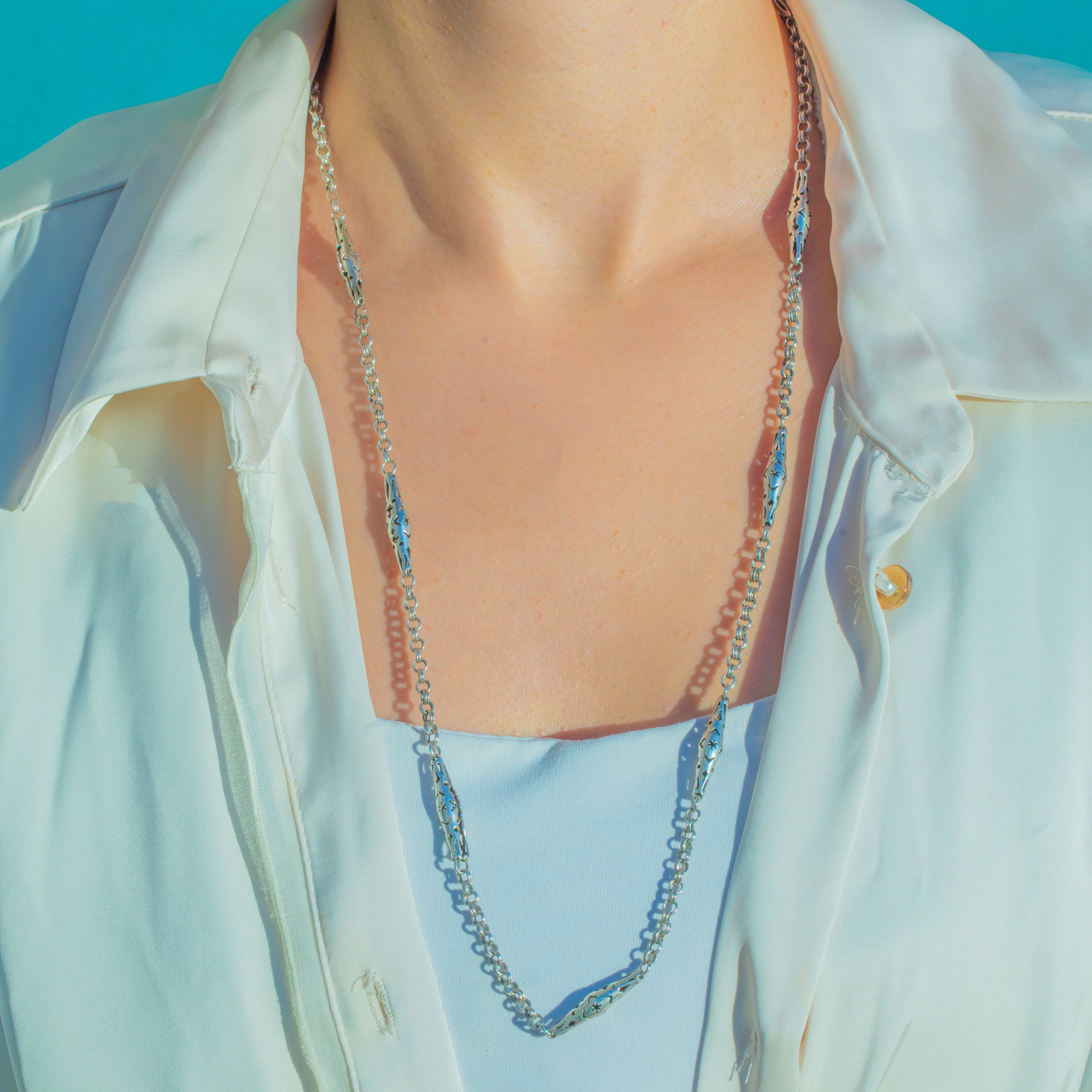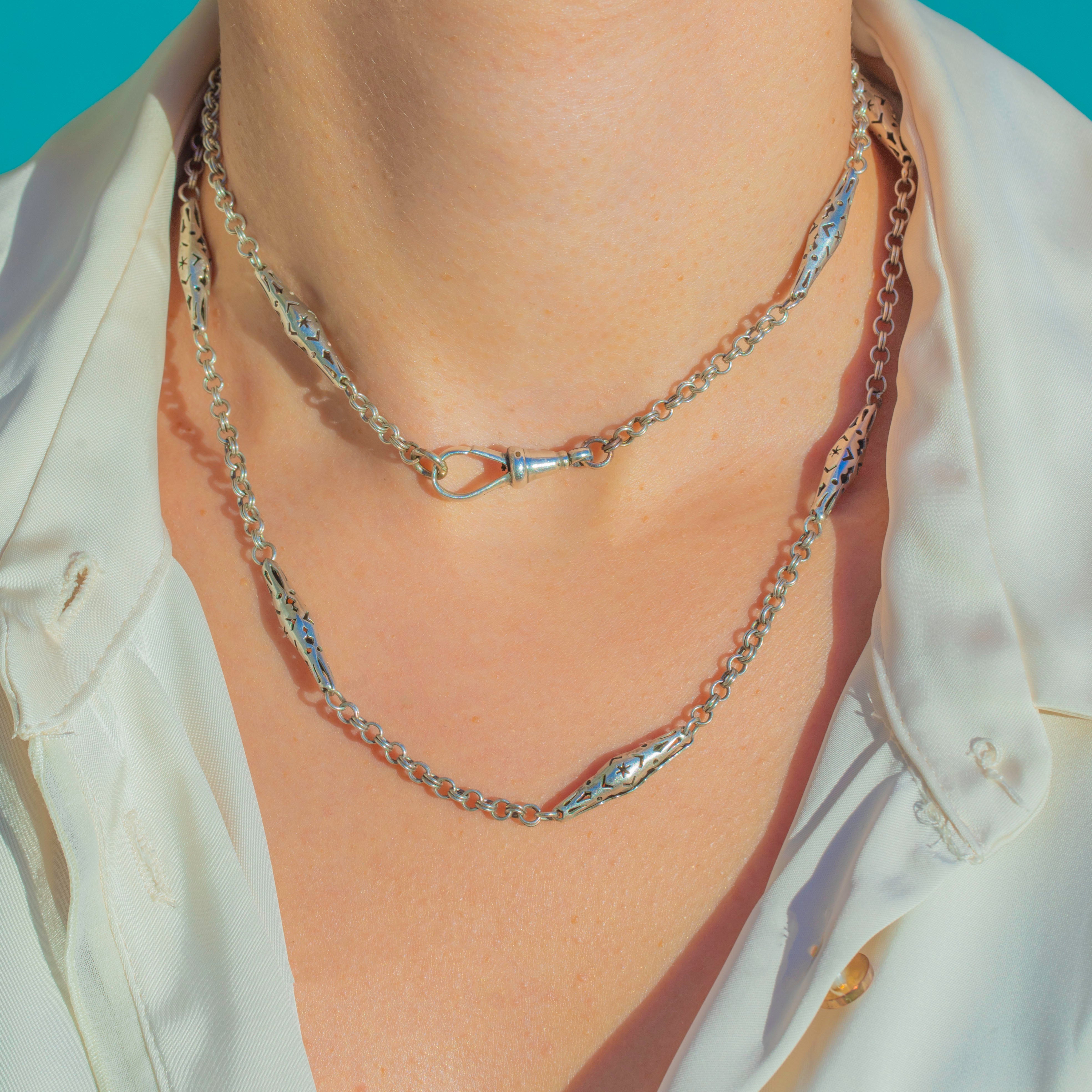 This antique Victorian Silver chain necklace is a rare and beautifully made piece, featuring elegant lozenge links with delicate pierced star motifs along the length of the chain. Each star panel is crisply cut and full of celestial charm, giving the necklace a wonderfully decorative yet wearable feel.