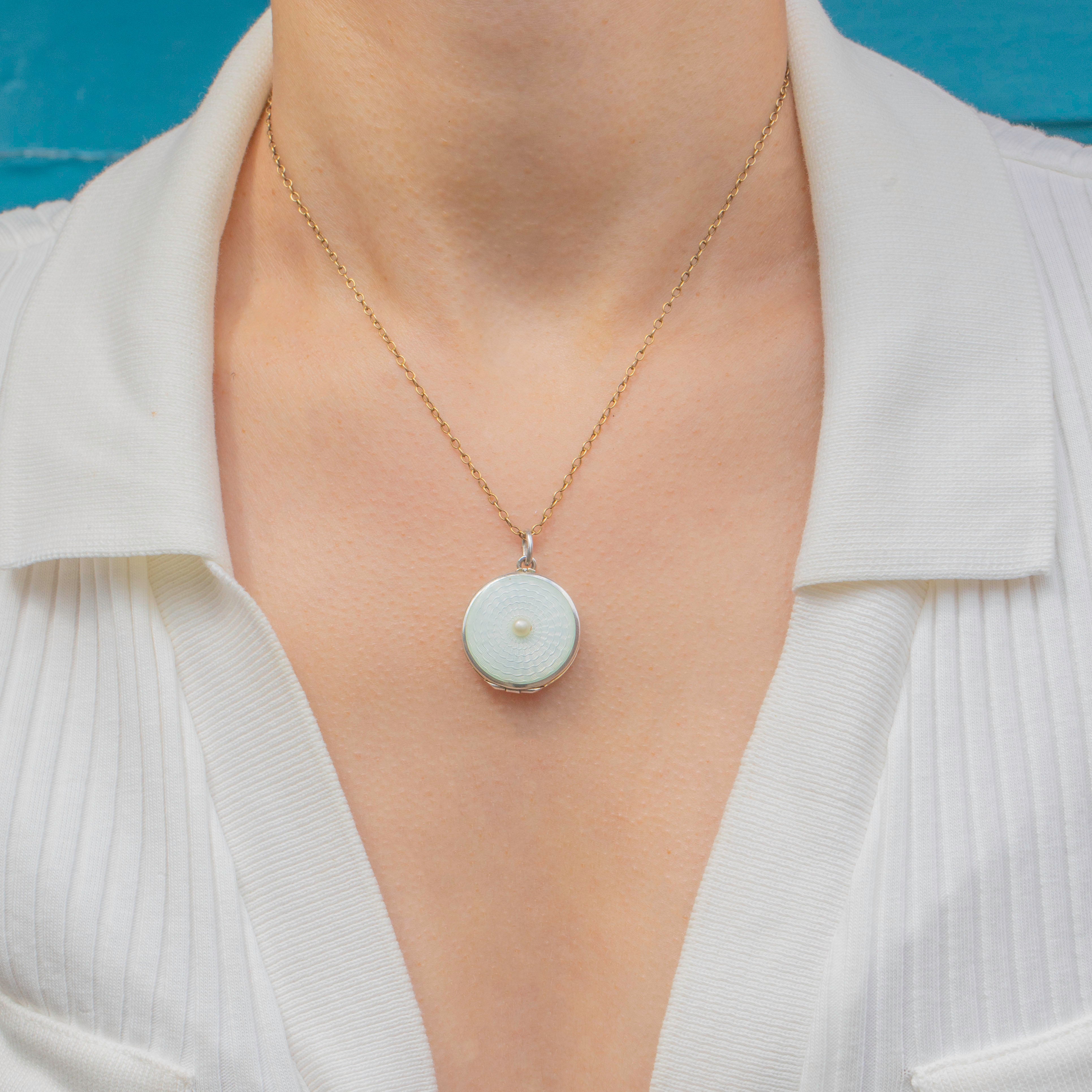 VERY GOOD: This antique Silver White Guilloché Enamel Pearl locket is in superb condition! Her Enamel is immaculate throughout, free from any damage to note. She has been kept in remarkable condition for her age. Her Pearl is securely set and has kept her lustre as well as her bright white tone. The Silver has accrued a slight patina, desirable on an authentic antique like herself! She has a few dings at the back, but nothing too impactful. Although she has no glass, she closes securely so you can place your favourite photograph inside and keep it close to your heart at all times.