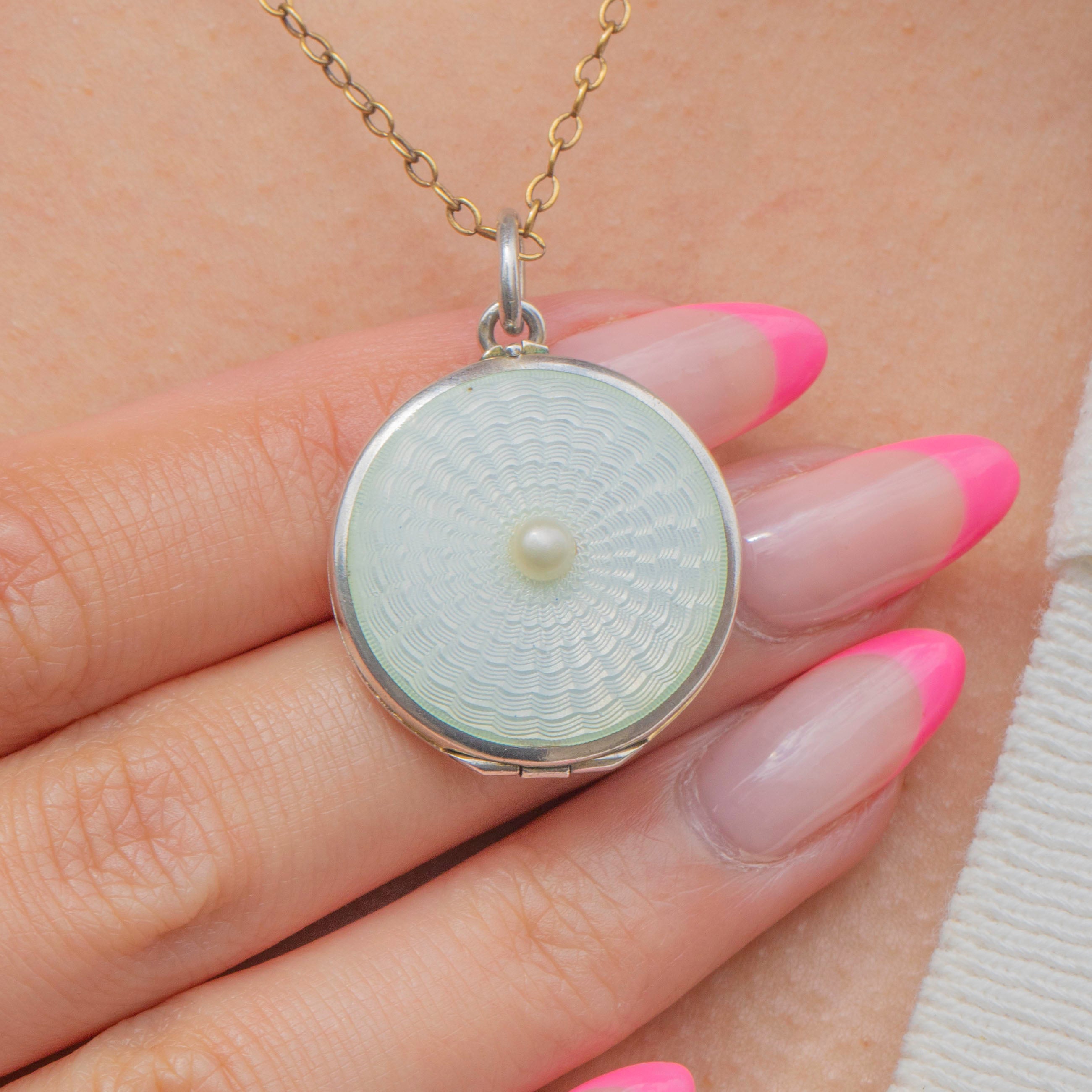 Antique Silver White Guilloché Enamel Pearl Locket