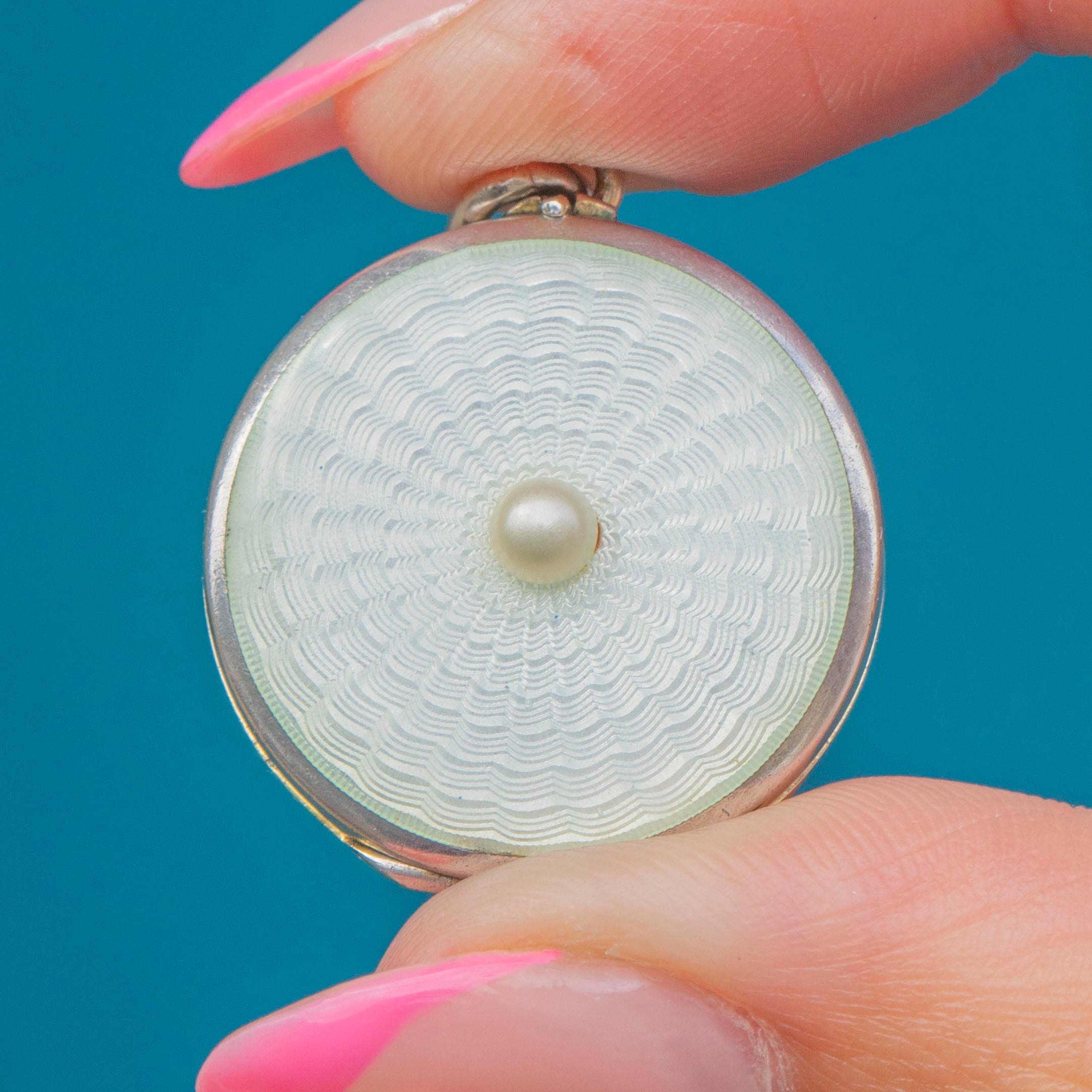 This antique Silver White Guilloché Enamel Pearl locket is incredibly charming! The shimmering powder-white patterns that radiate from her intricate Guilloché Enamel will captivate anyone who lays eyes on her.
