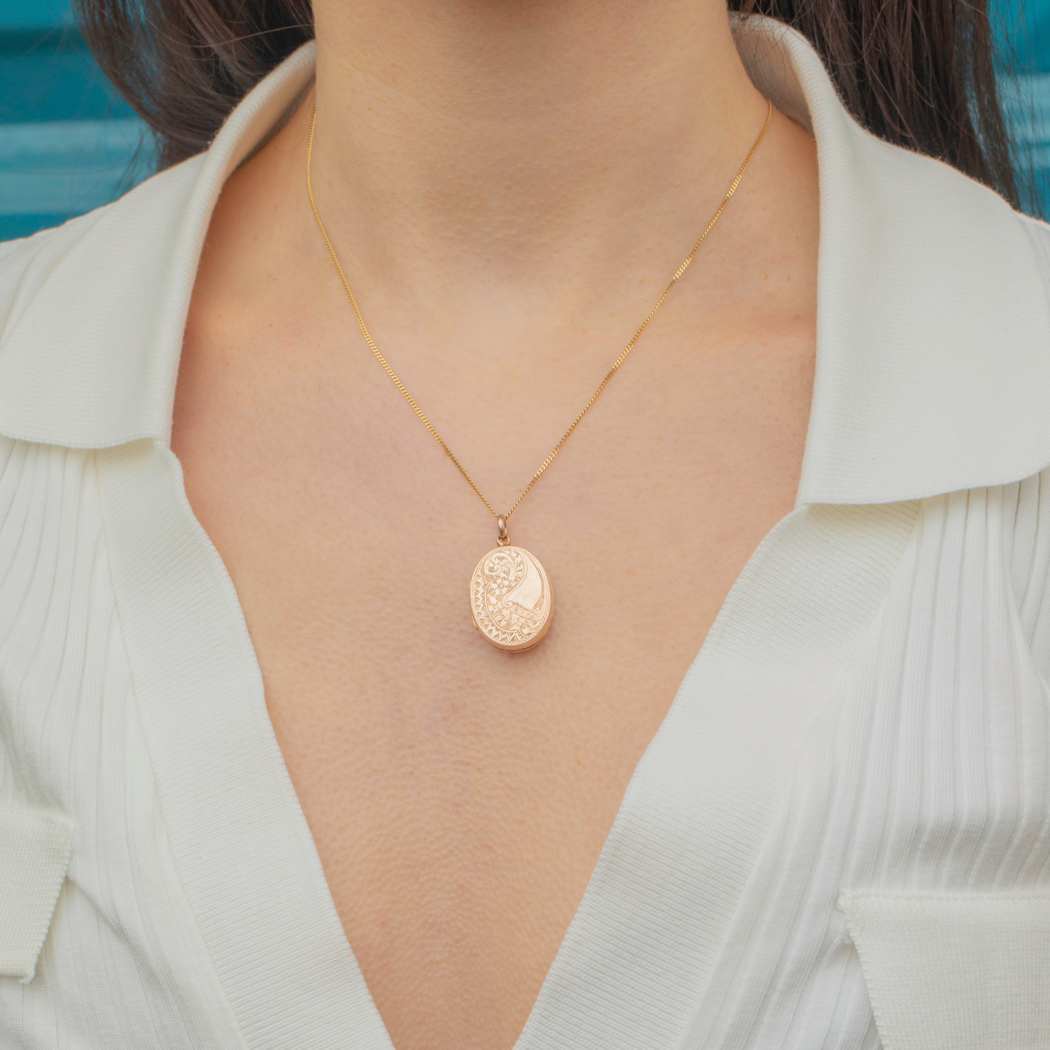 This antique solid 9ct Gold oval engraved locket is simply divine! This delightful piece is engraved on both sides and opens to reveal a frame, to which you can add a cherished photograph.