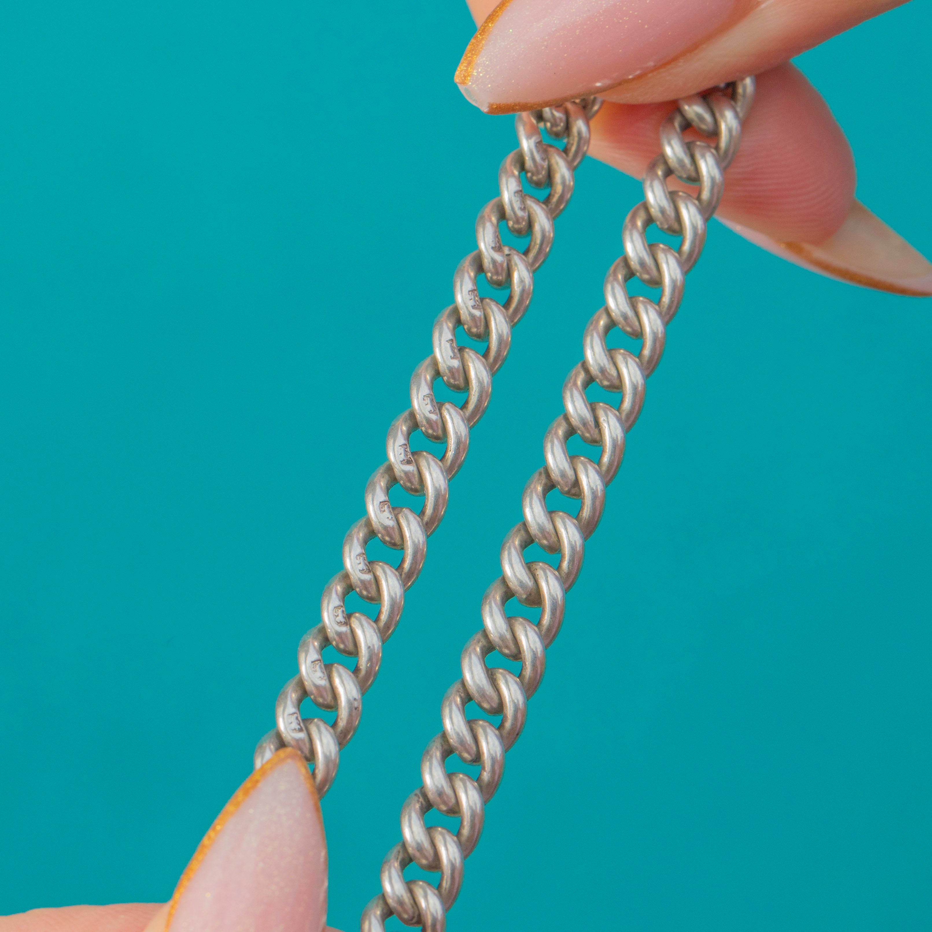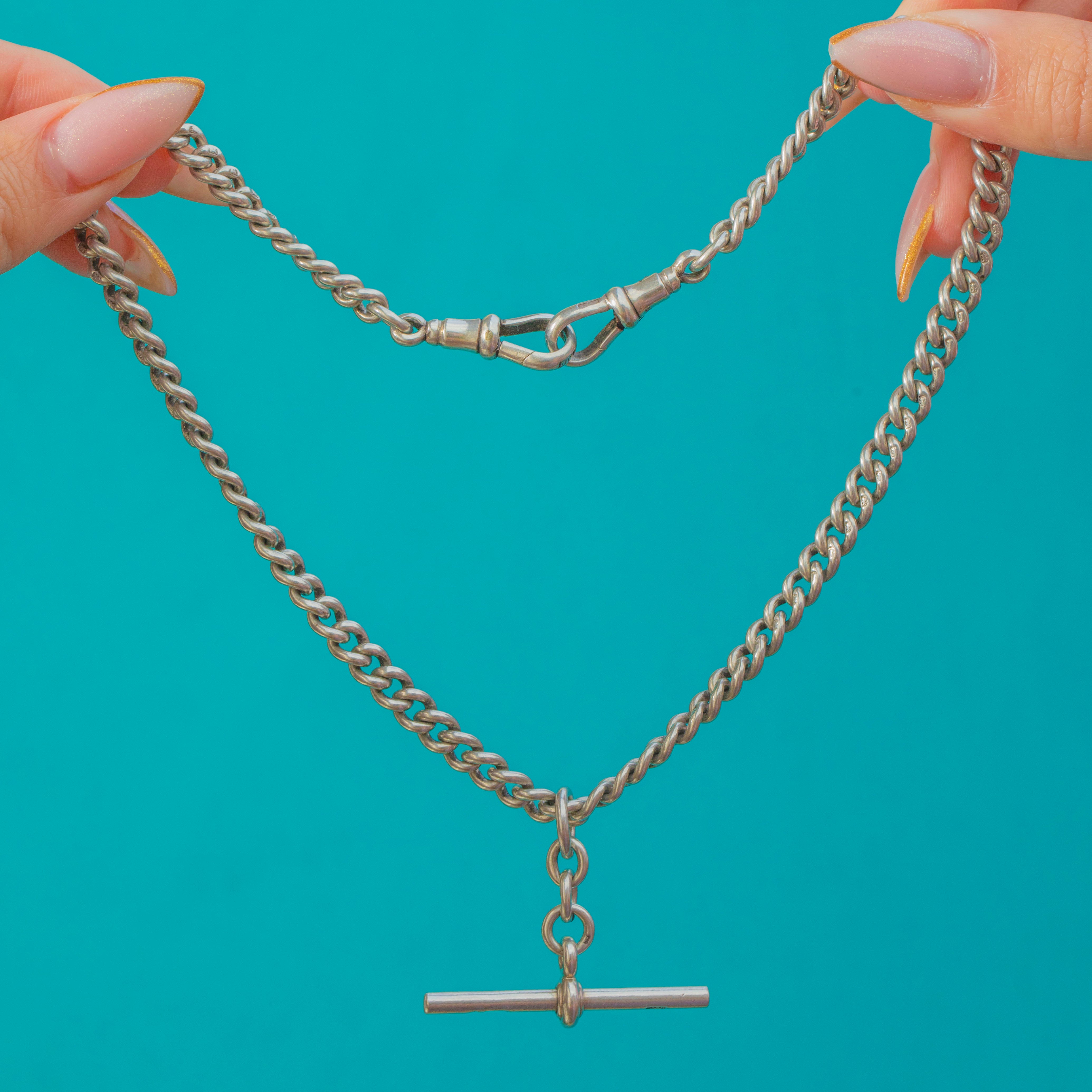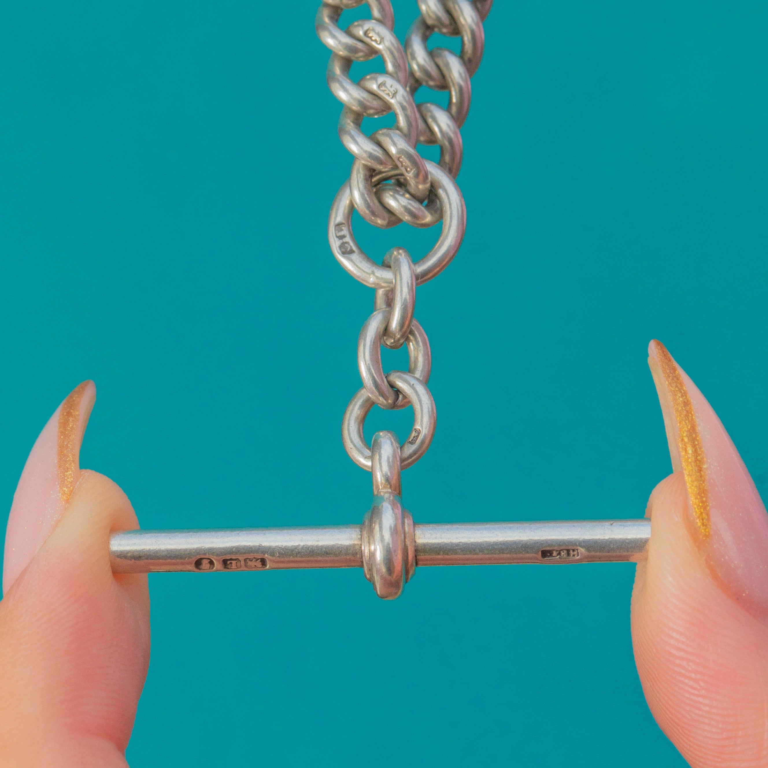 This Antique Sterling Silver Albert chain is a superb example of Victorian craftsmanship, complete with a mobile T-bar and matching dog-clips for that classic gentleman’s look. The chain is beautifully made with solid curb links, each one individually struck with the Lion Passant – a lovely detail that collectors and silver aficionados will adore.