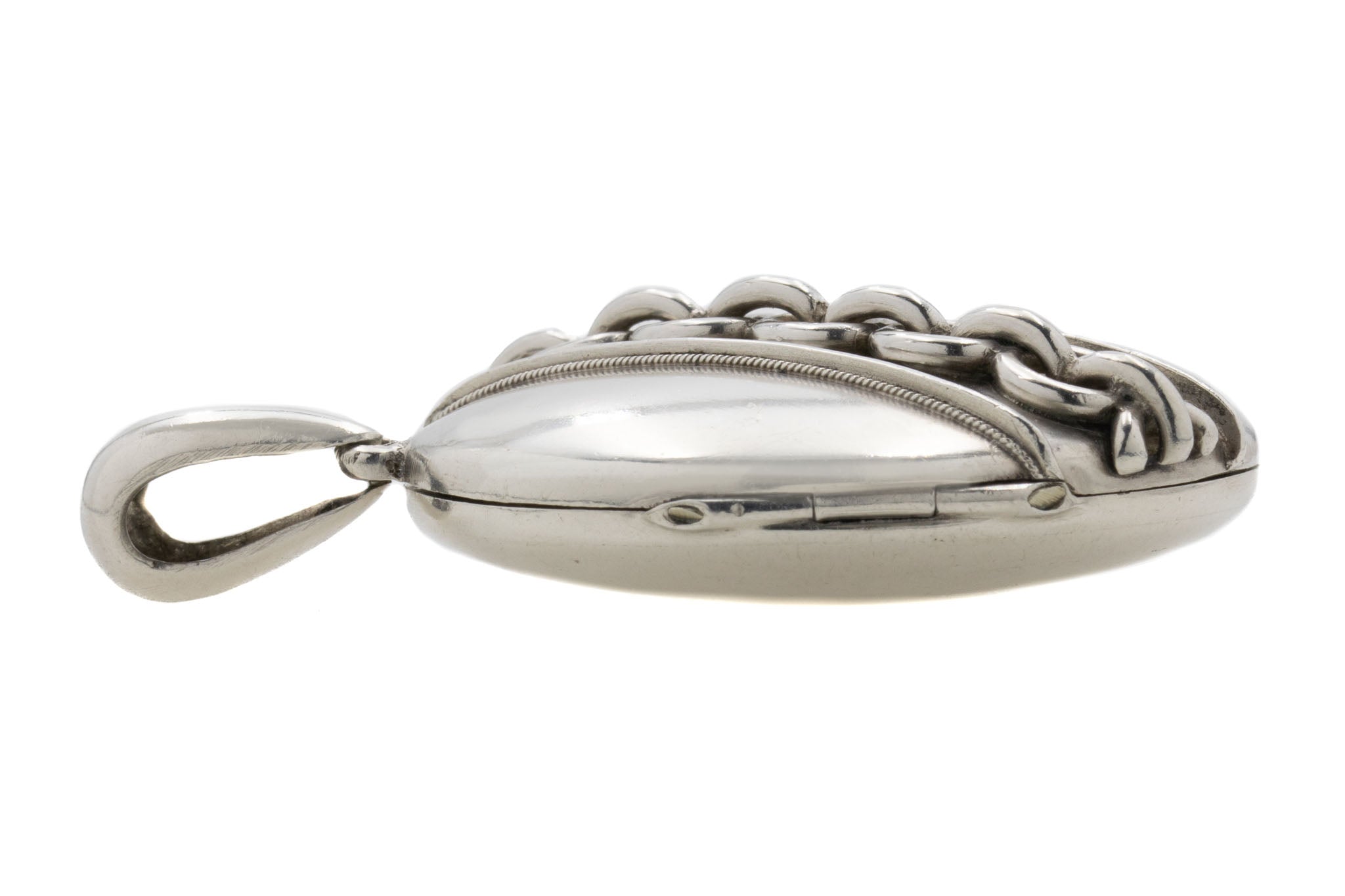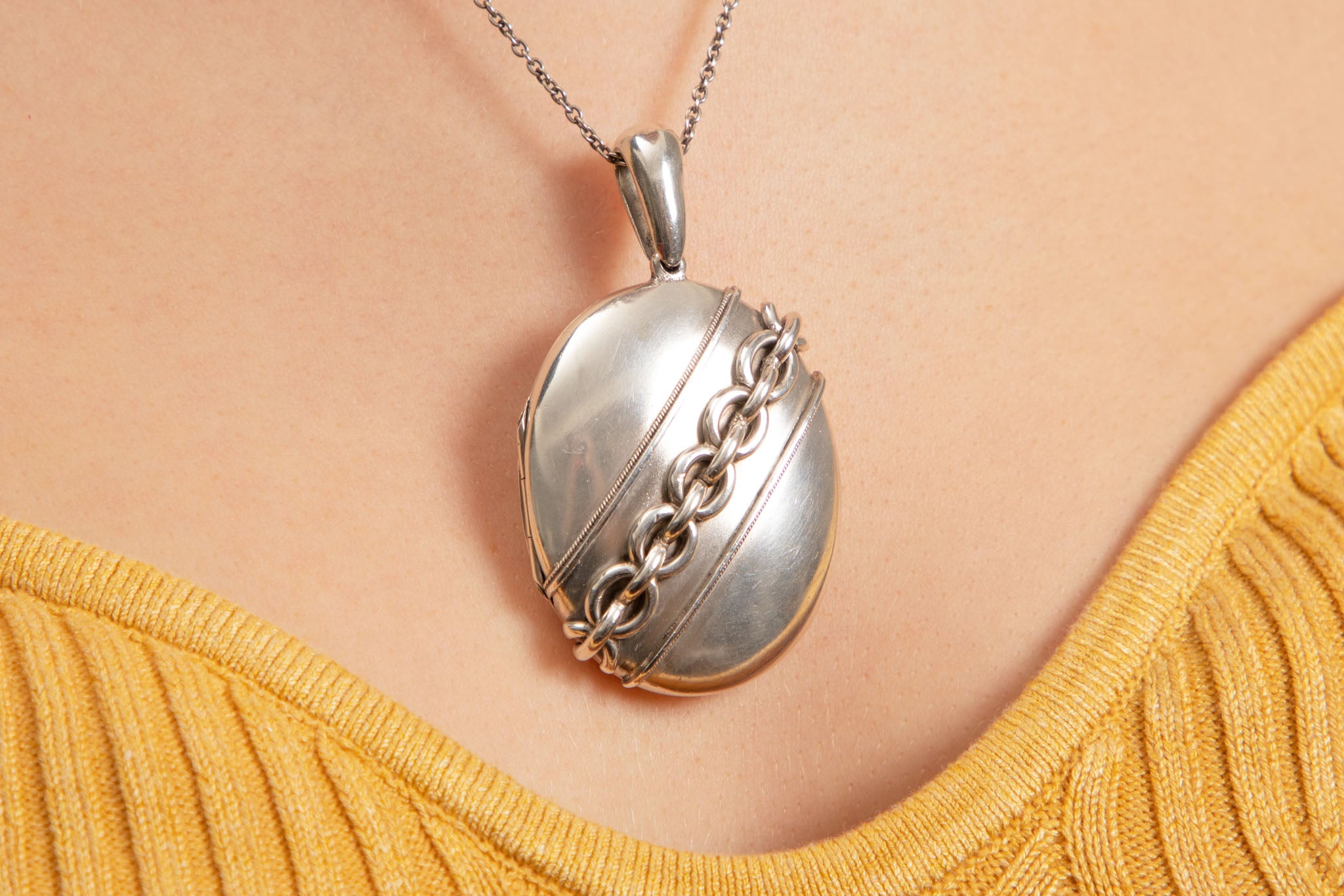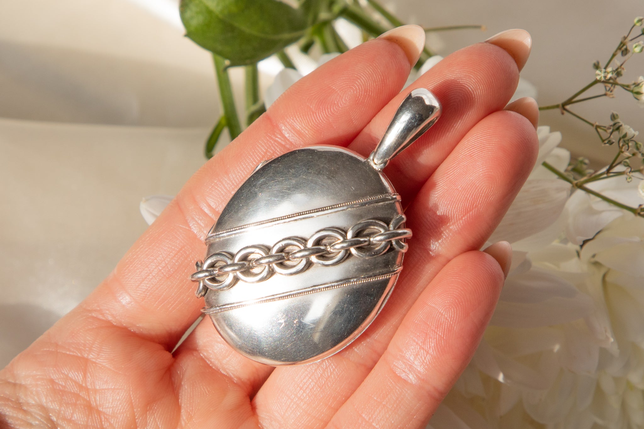 An antique Sterling Silver 'chain' motif locket to add a striking statement to your repertoire! Her unmissable belcher chain motif runs diagonally across the front of the large locket, creating depth, texture and an overall gothic feel to the piece.