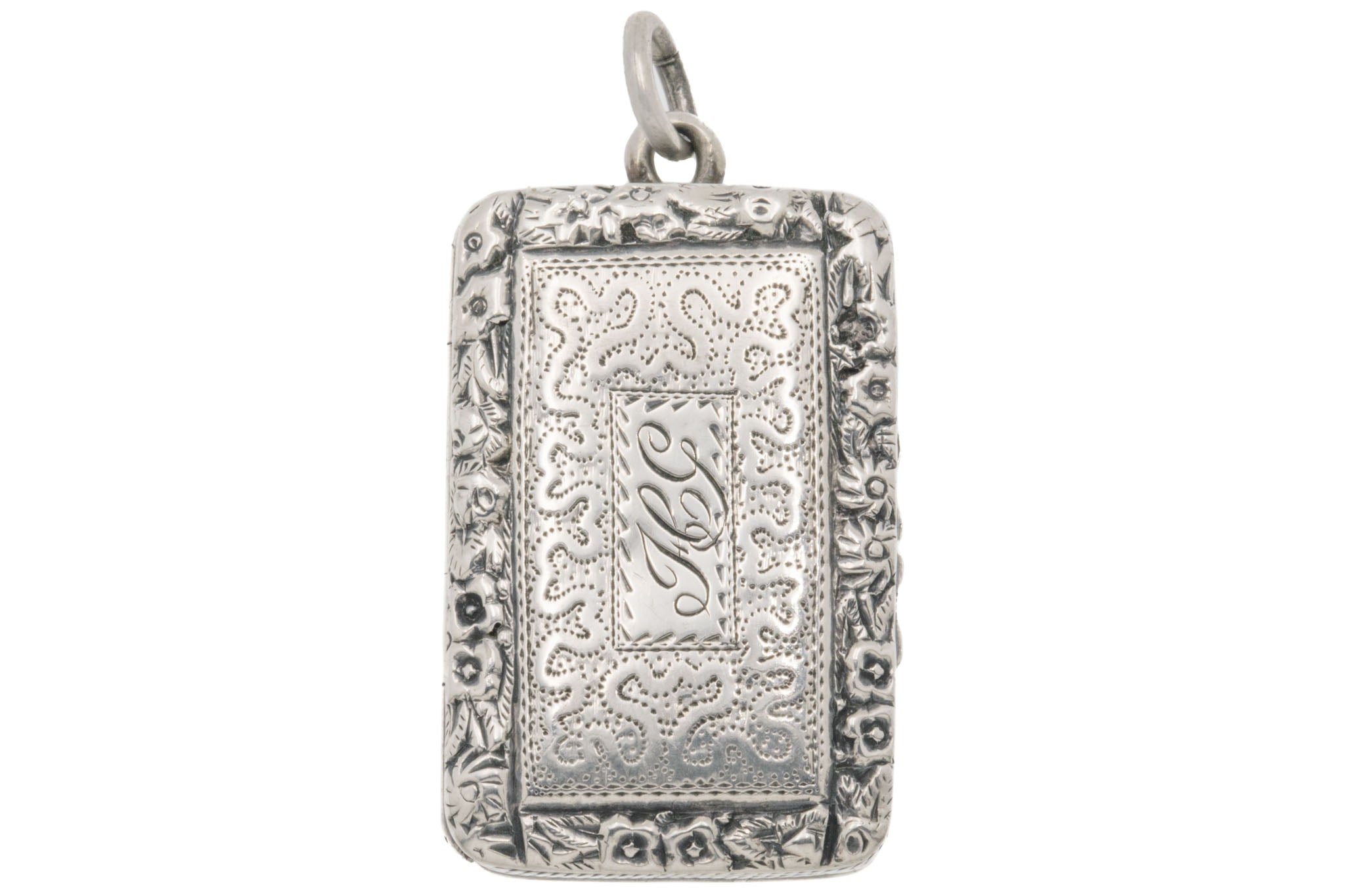 This pretty antique vinaigrette pendant is adorned with a pierced whimsical design, bordered by a bed of wildflowers.