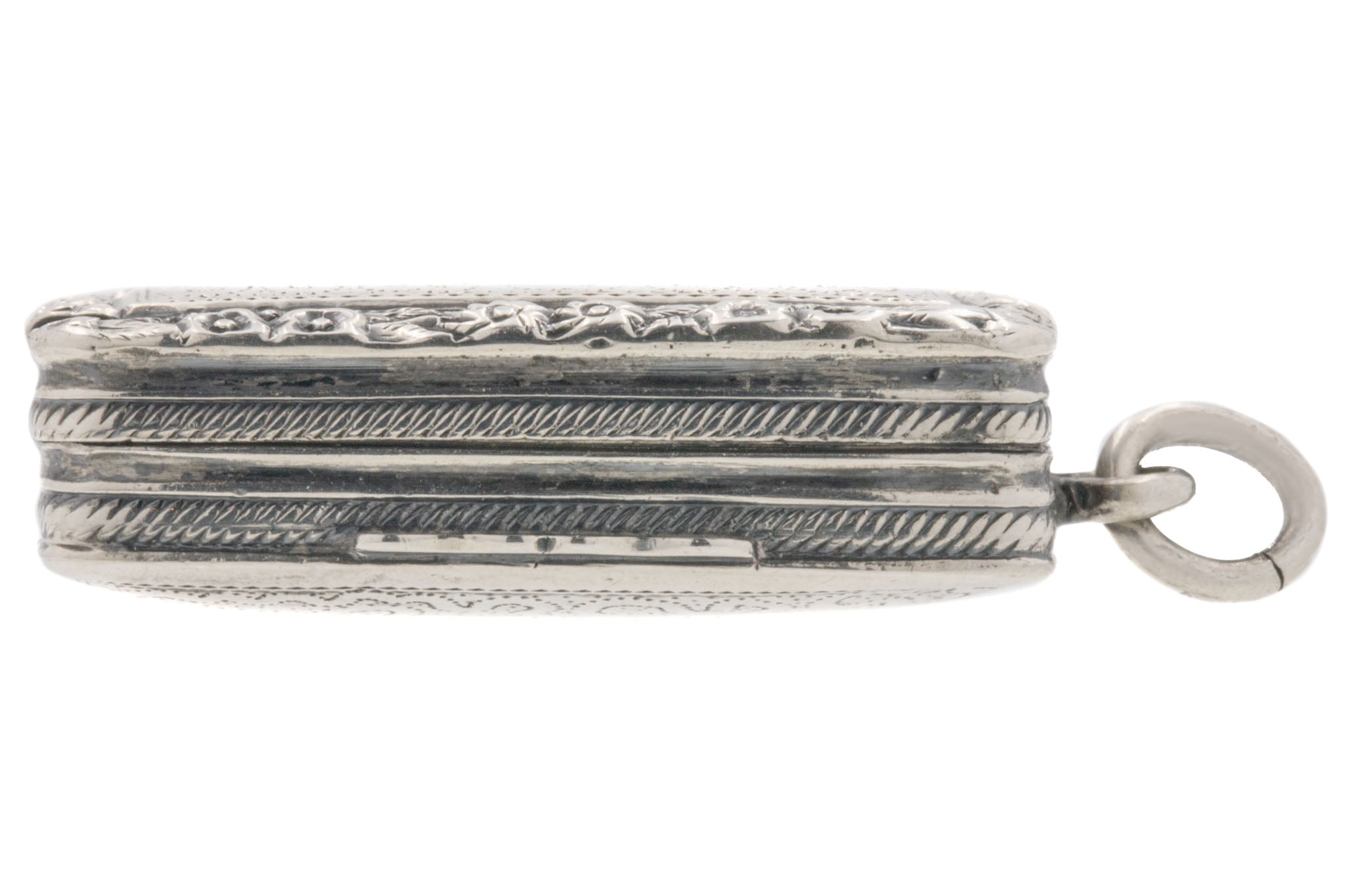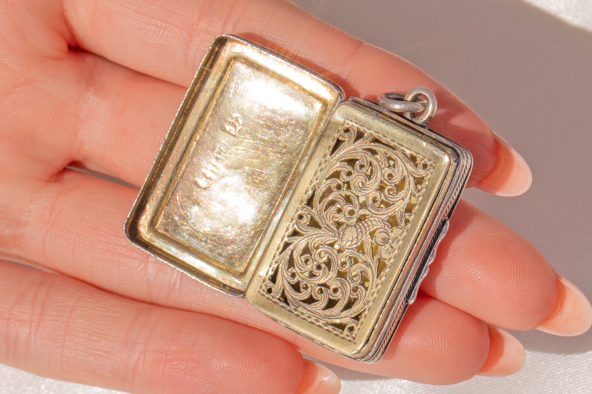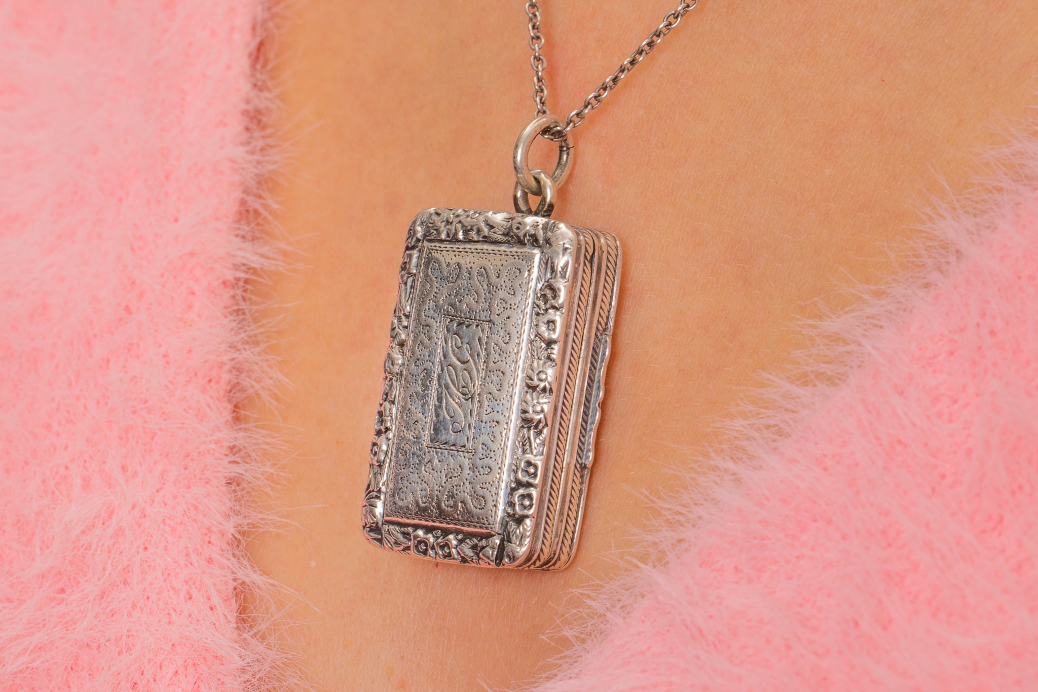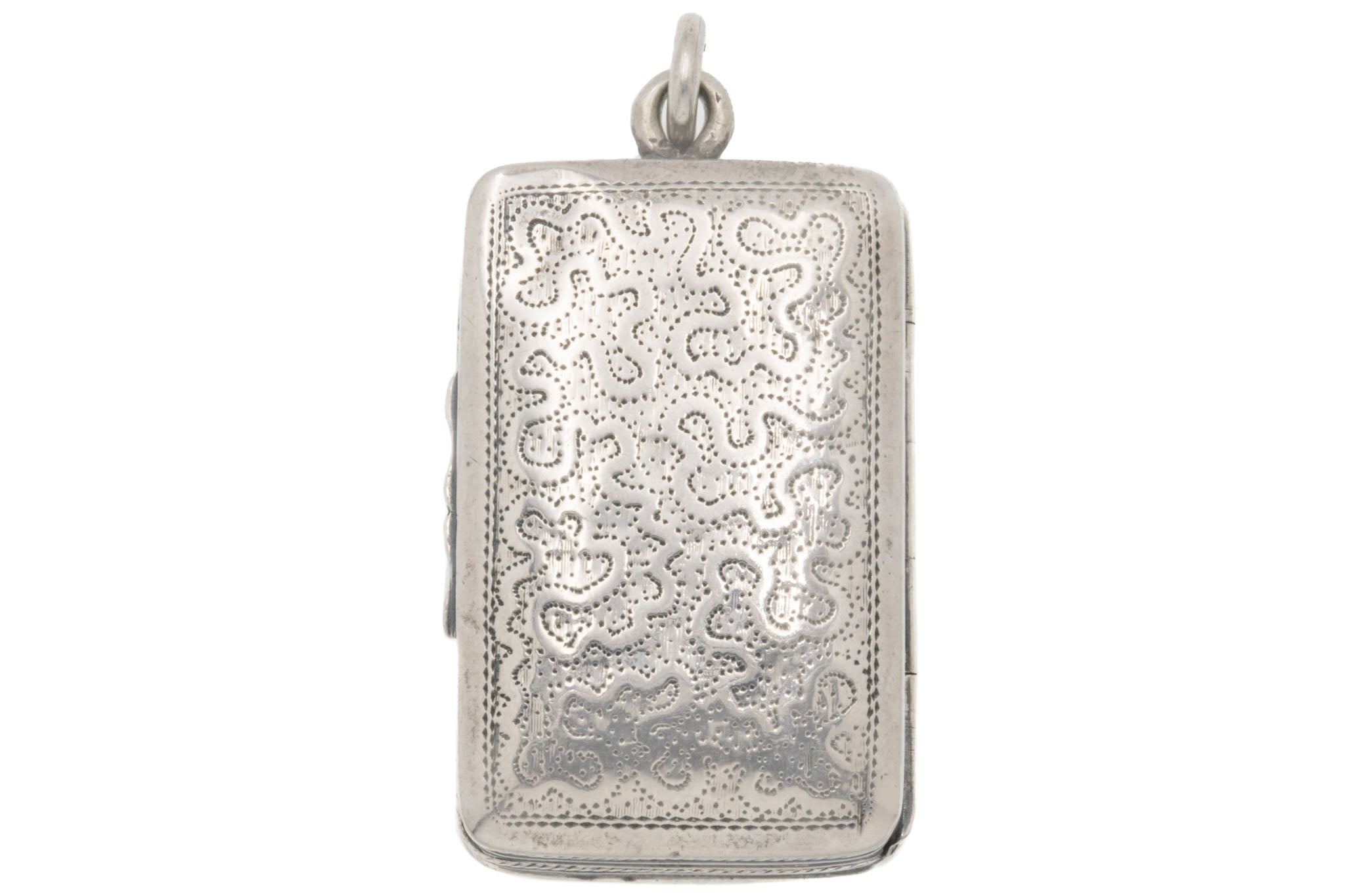 VERY GOOD. This antique Silver engraved vinaigrette pendant is in very good condition. Externally, she is in lovely condition, with both her repoussé details and engravings crisp. The Silver has a gorgeous lustre with an admirable patina to compliment. There is one small dent on the top left corner at the back, but you can't see this when she is suspended around your neck. Inside, there are a few scratches and wear, commensurate with age, to the Gold. Her English hallmarks have remained crisp allowing us to accurately date her to 1822. She's definitely a good pick to add a touch of intrigue to your repertoire!
