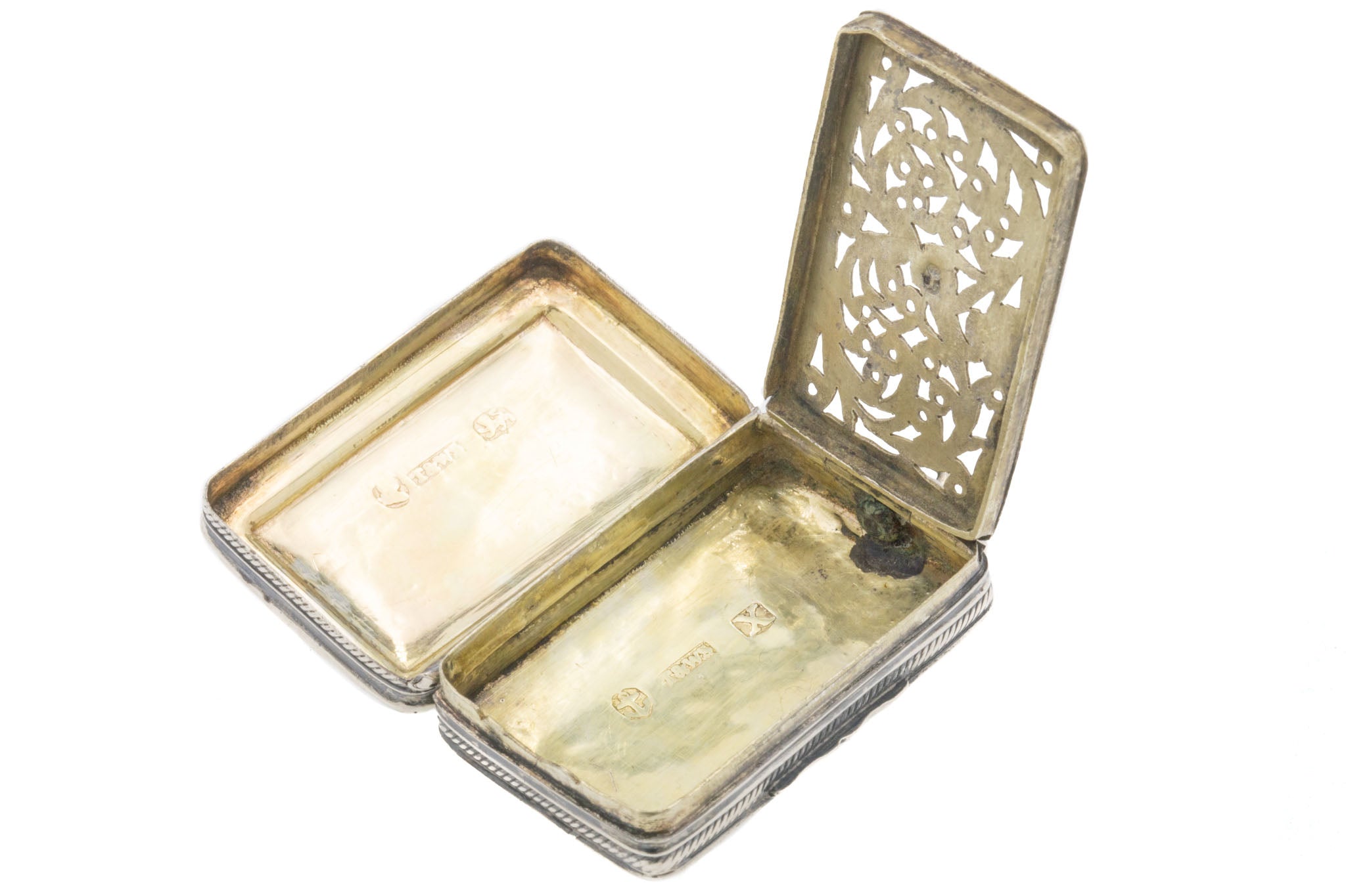 MATERIALS: Tests as Sterling Silver throughout, with layer of Gold inside lid.