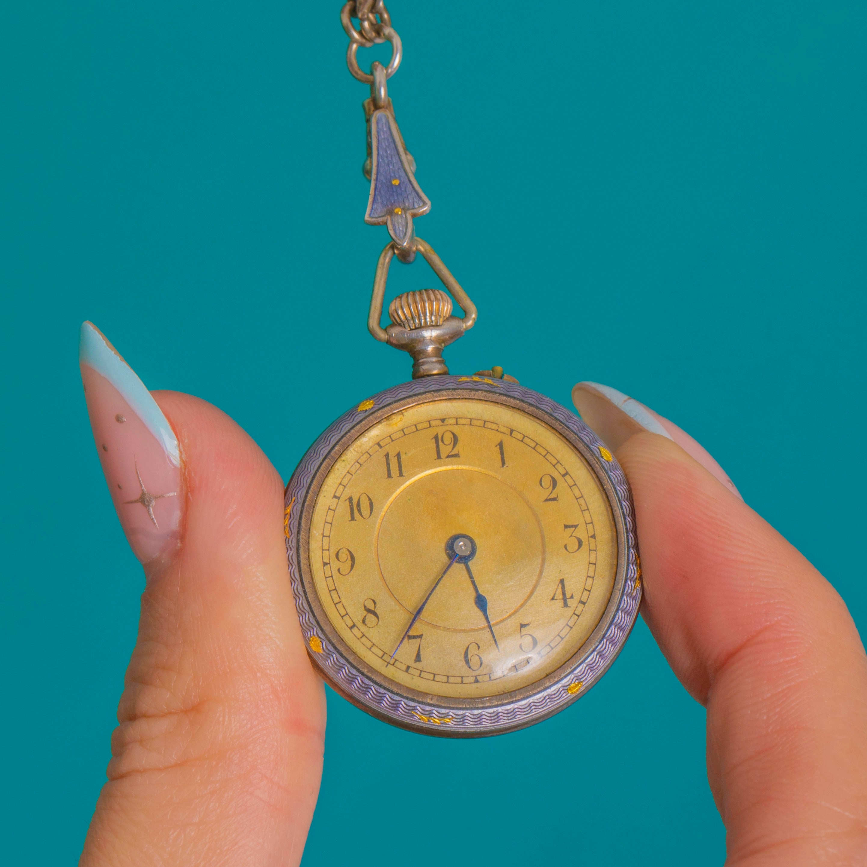 GOOD: The Enamel presents beautifully and, to our eye, appears perfect with no chips or losses. The Silver case and Enamelled chain show gentle age-related surface wear and patina; the crystal has scratches and the dial shows light marks. The movement is not ticking and only one blue hand is present.