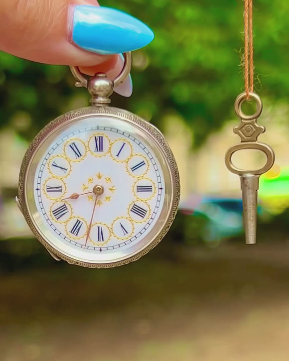 Boasting a charming clock face with Gold dial detailing, elegant Roman numerals, and an ornately engraved back, this piece simply radiates antique charm. Complete with its own watch key, with which you can hear it tick, this Victorian pocket watch will make a fine addition to any collection!