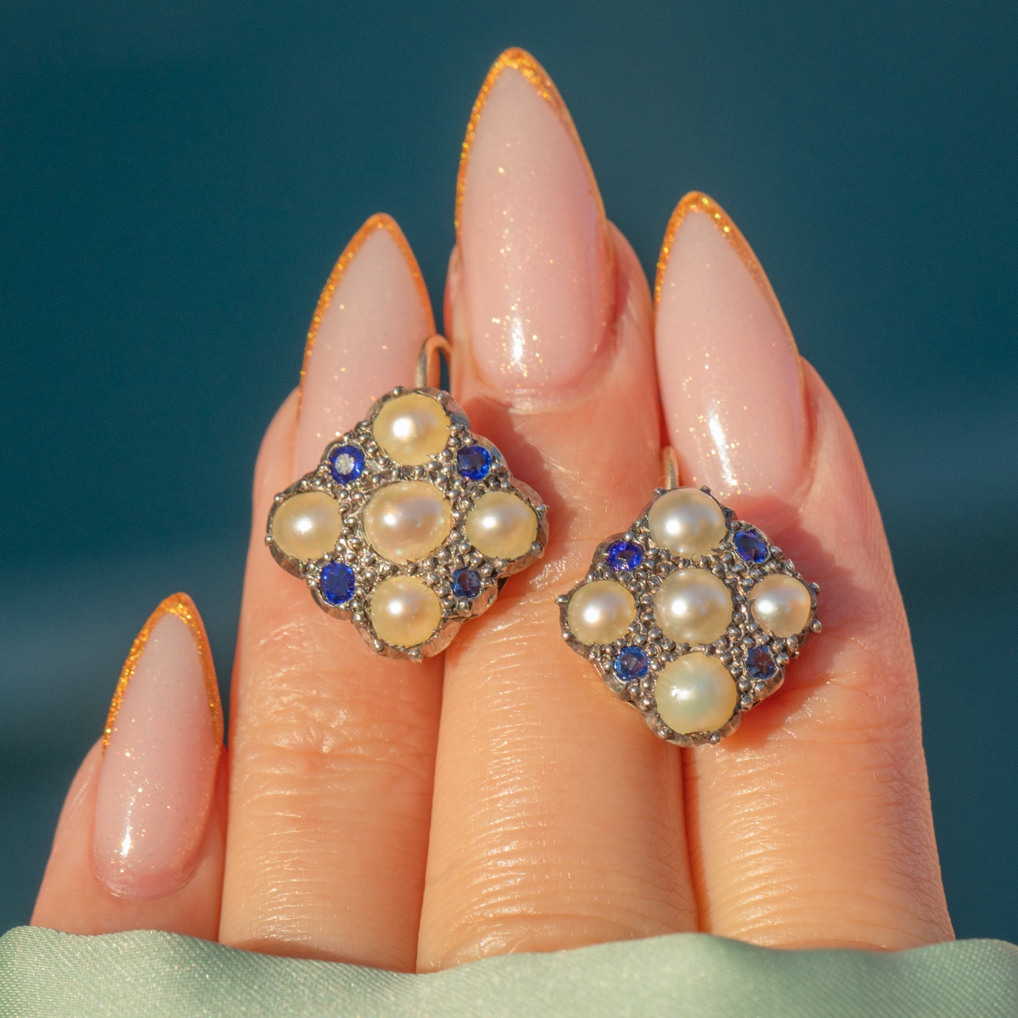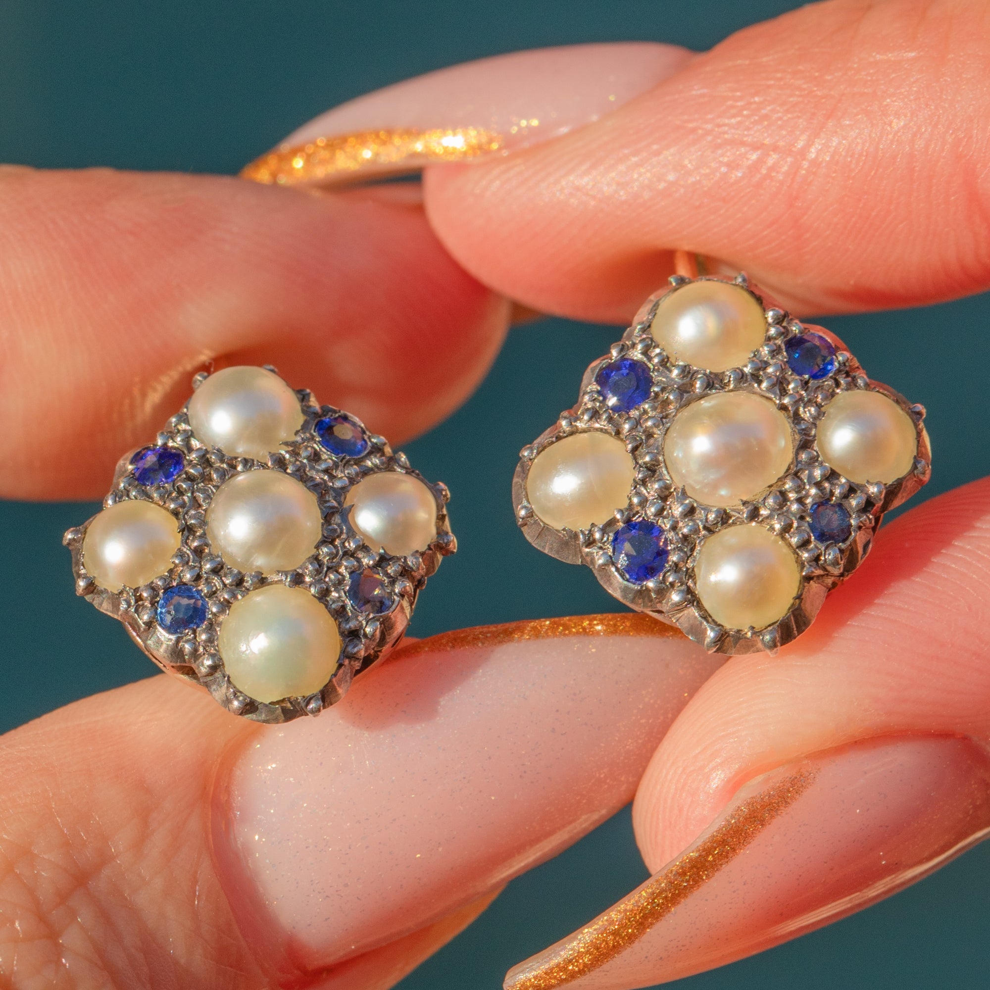 These antique Edwardian cluster earrings are beautifully luminous, full of soft colour and elegant sparkle. Each earring forms a rounded floral cluster, with dark Tanzanite stones complemented by creamy Pearls for a refined early 20th-century look.