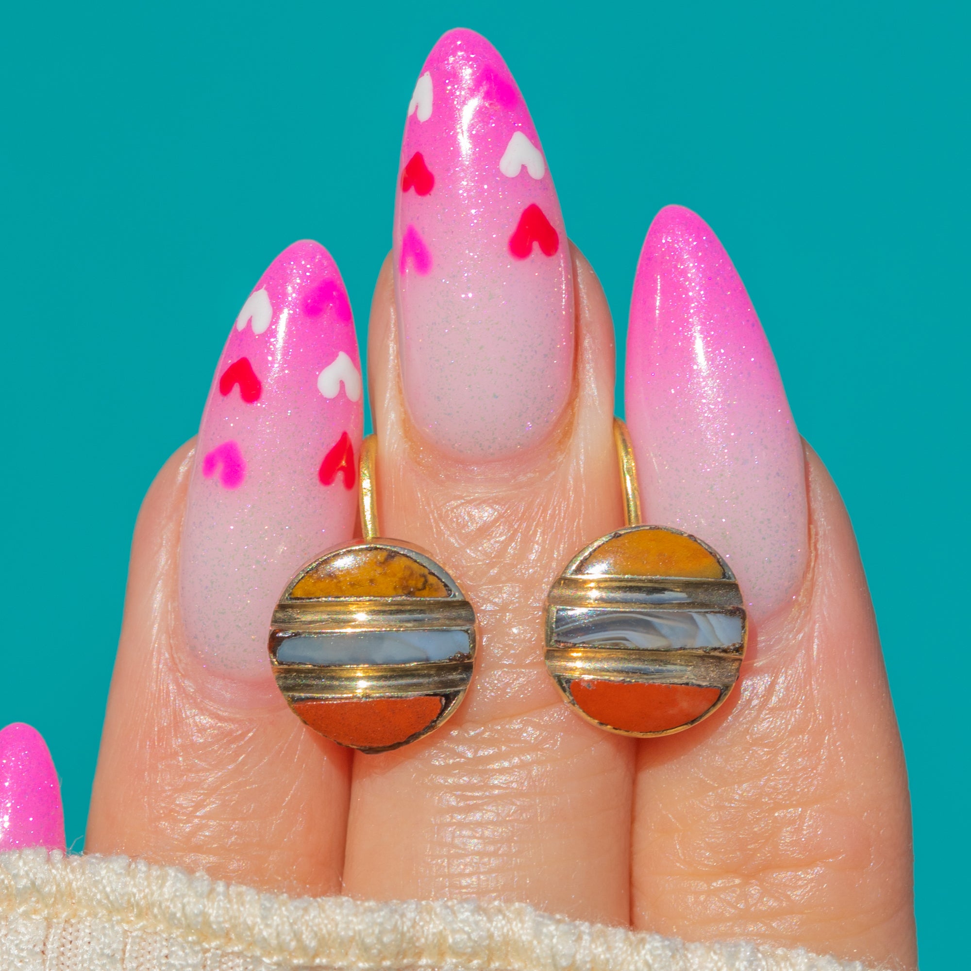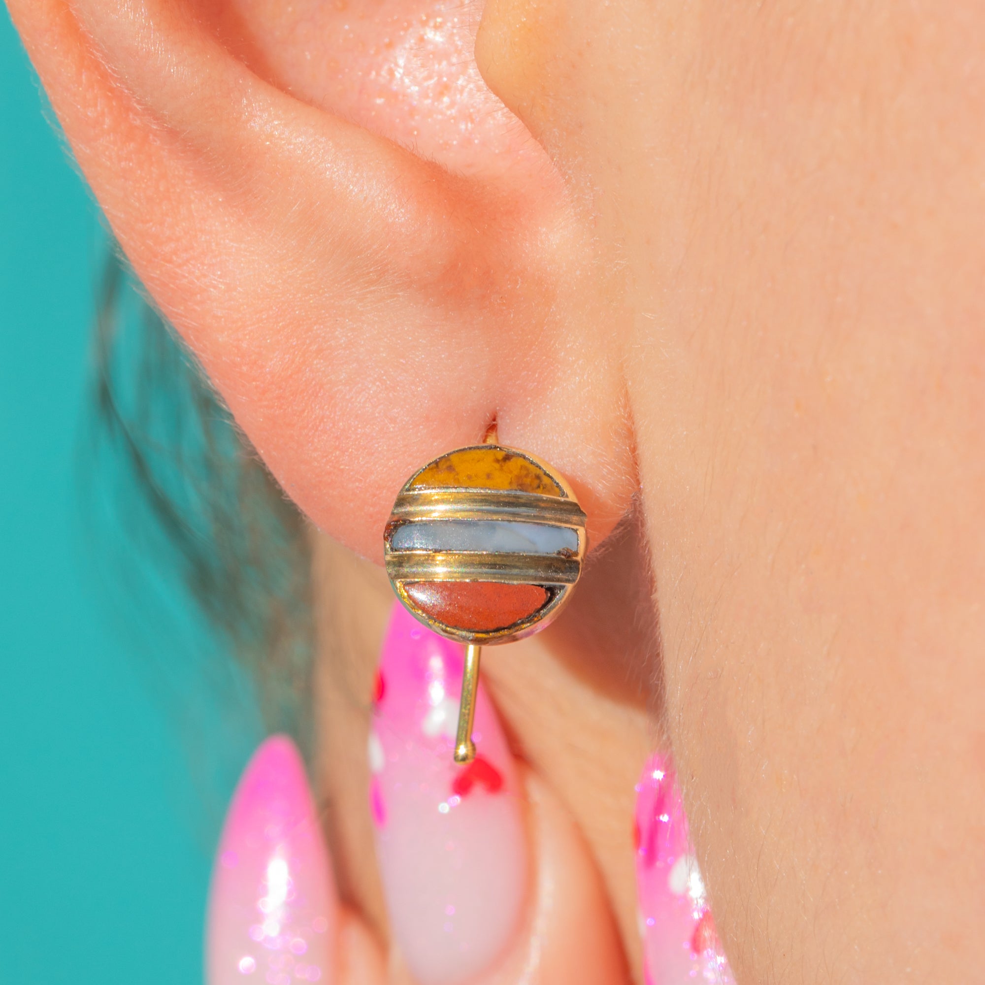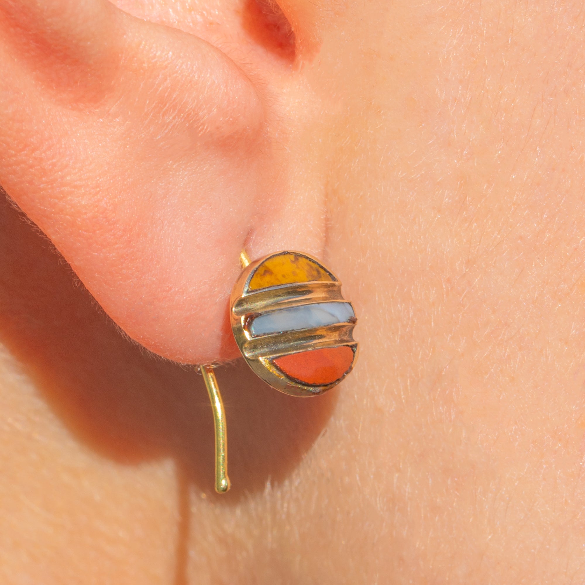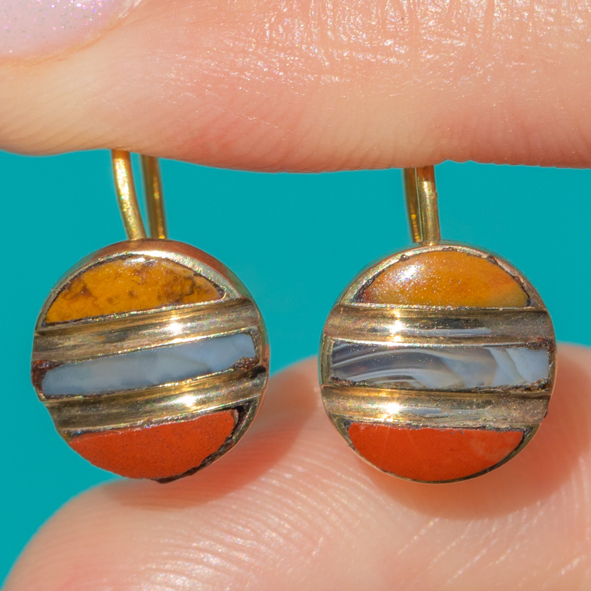 These Antique Victorian earrings are a charming study in colour and balance. Crafted in rich 18ct Gold, they showcase three coloured Agate arranged in crisp horizontal bands within compact circular drops. Each panel—two slim crescents flanking a central rectangle—sits flush within fine Gold channels, creating a refined stripe that glows with warm honey, pale cream-blue and russet tones.