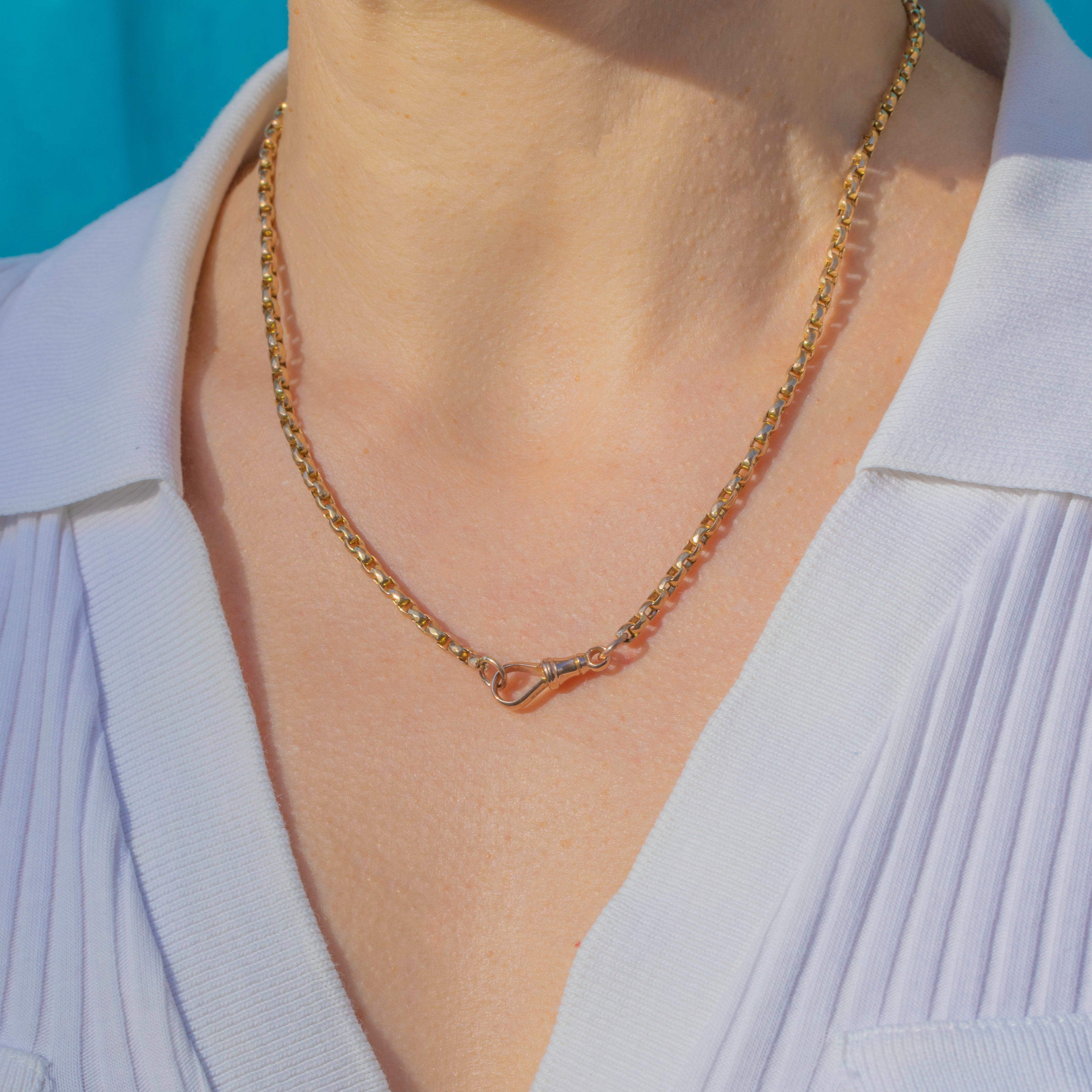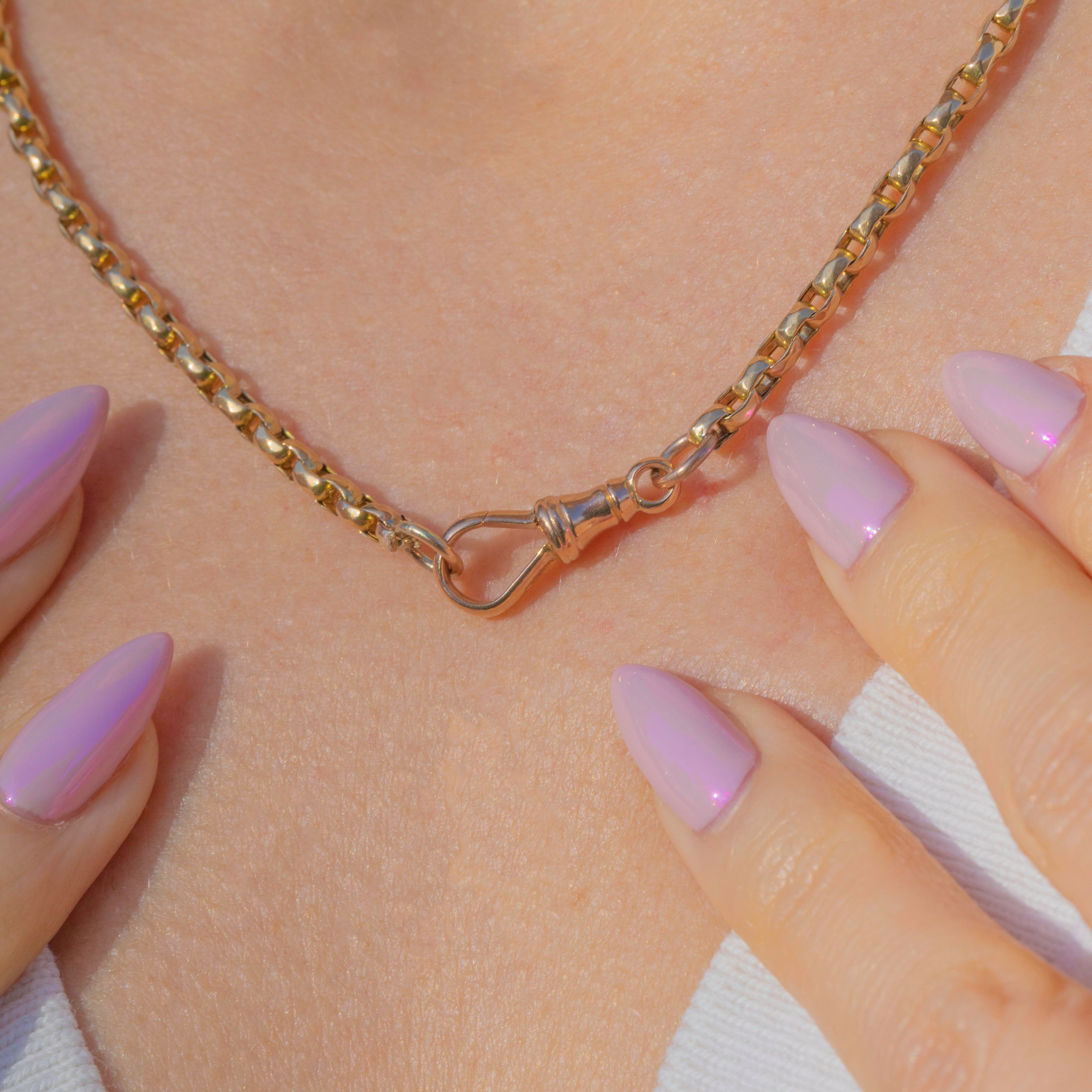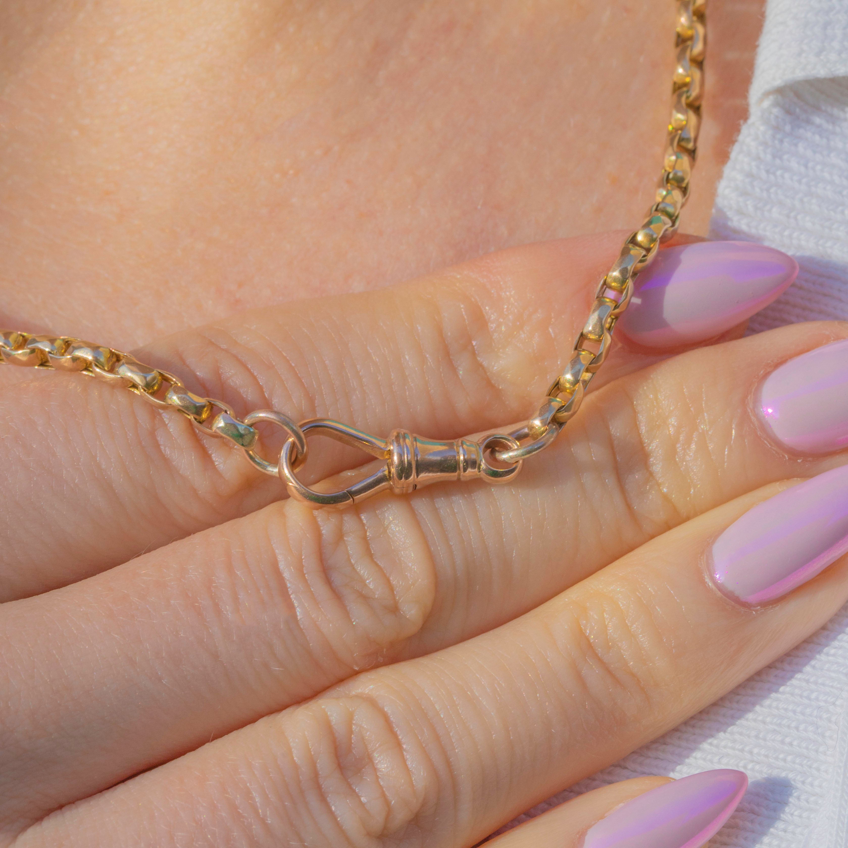 This beautiful Victorian chain is a timeless staple — a solid 9ct Gold antique with wonderful weight and craftsmanship. The faceted fancy links catch the light beautifully, alternating between soft yellow and faint rose tones typical of the era. It’s finished with a sturdy dog clip clasp, making it both decorative and practical for attaching pendants, lockets or fobs.