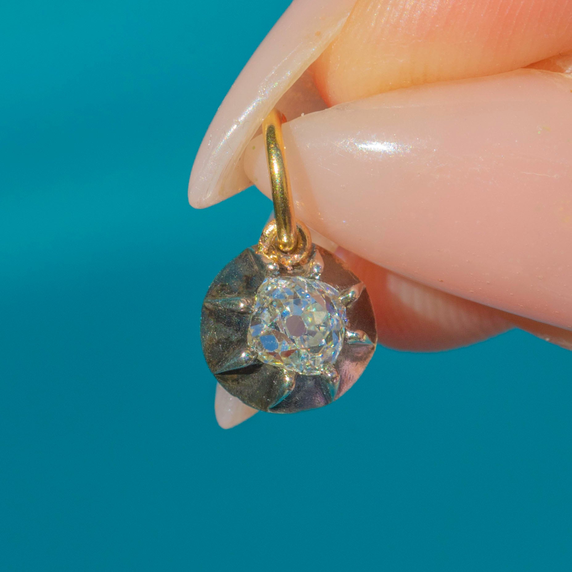 EXCELLENT: The Old Mine Cut Diamond is bright, secure, and free from chips or abrasions. The Silver collet and 18ct Gold backing are in superb condition, with minimal wear consistent with age. The Gold jump ring is sturdy and secure. A beautifully preserved Victorian charm.