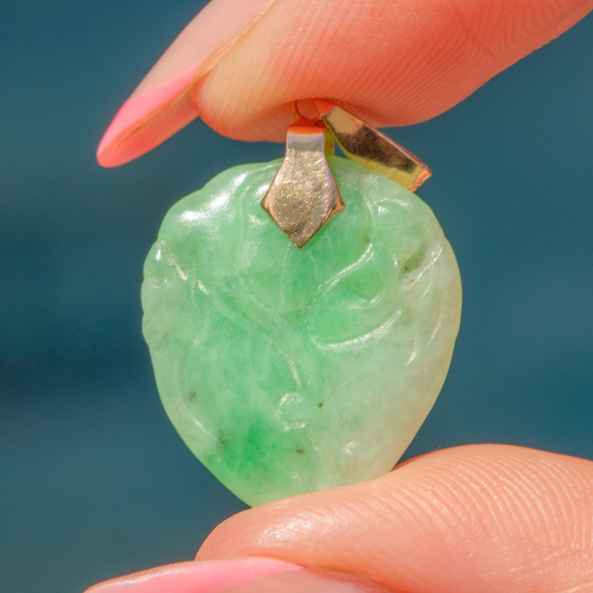 This sweet Art Deco 14ct Gold Carved Jade heart pendant will make a fabulous addition to your antique jewellery collection. This Art Deco delight displays a minty-green Jade, carved into a gorgeous heart with intricate engravings throughout, and is suspended from a 14ct Gold bale for a luxurious finishing touch!