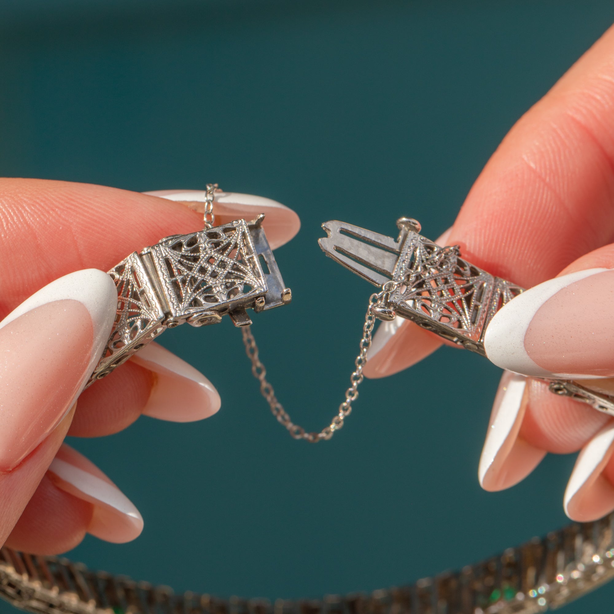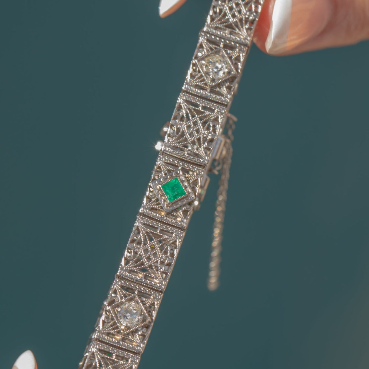 Crafted from glossy white Gold and Platinum, she features intricate filigree work throughout in quintessential Art Deco style. This antique bracelet is adorned by alternating vibrant Emeralds and twinkling old-European cut Diamonds - a piece glamorous enough to come from Gatsby himself!