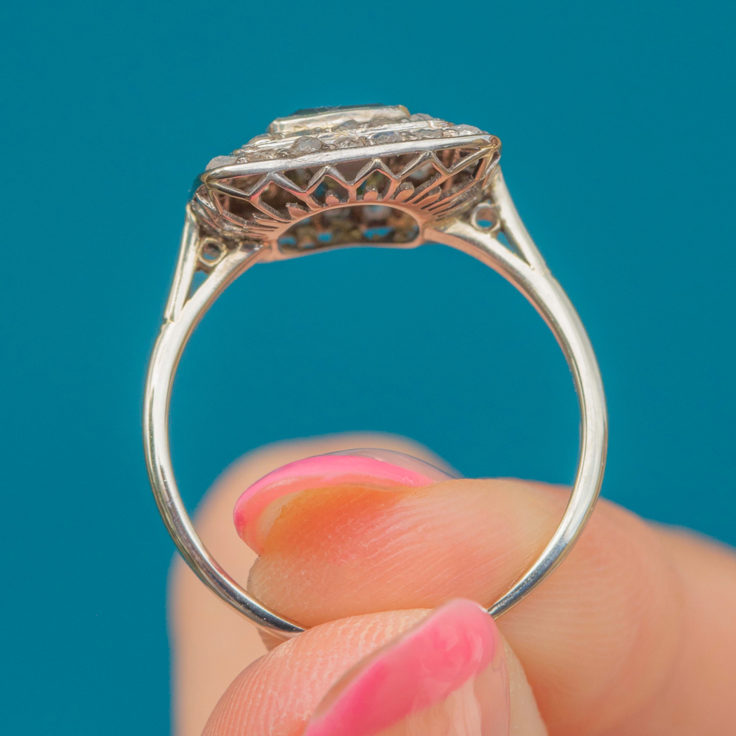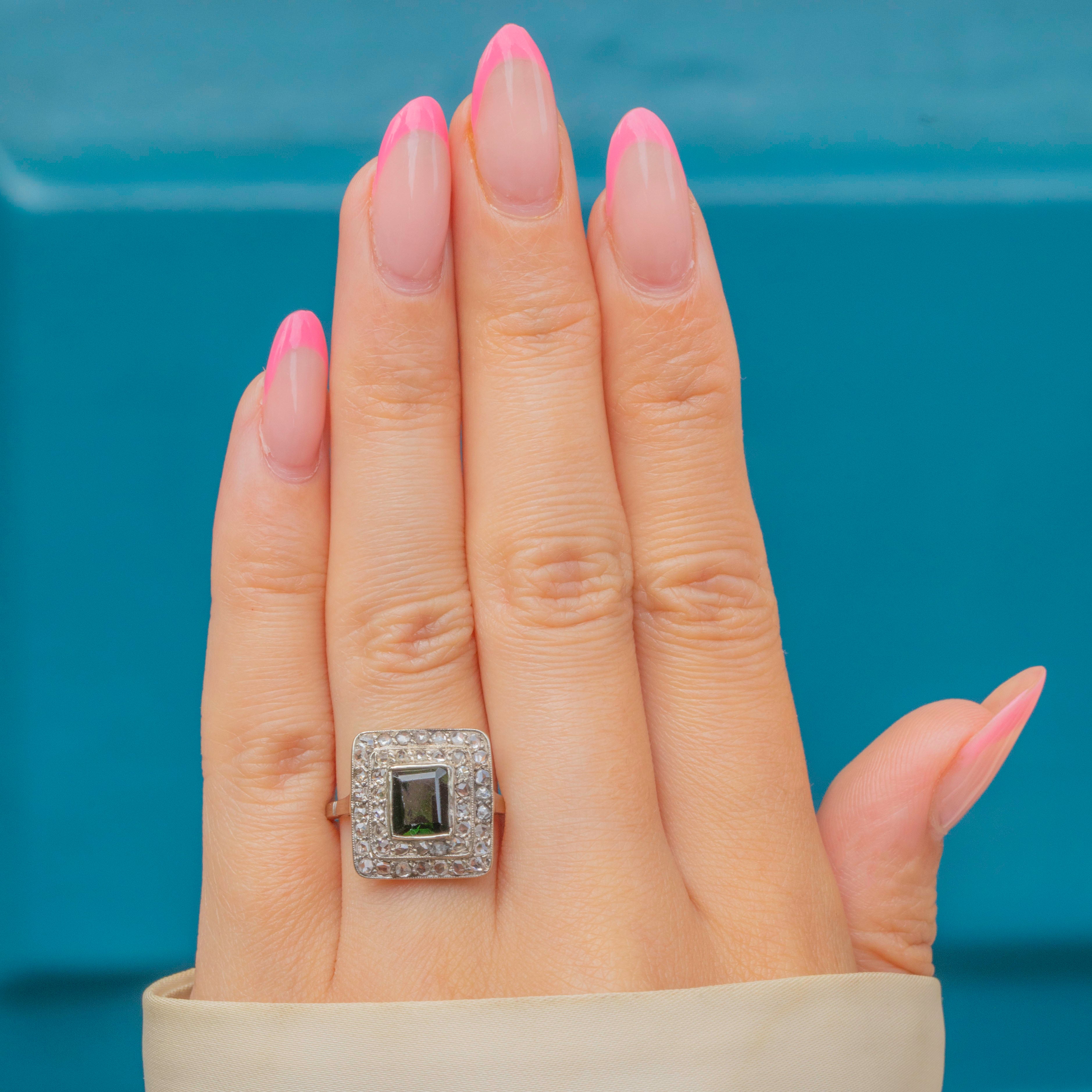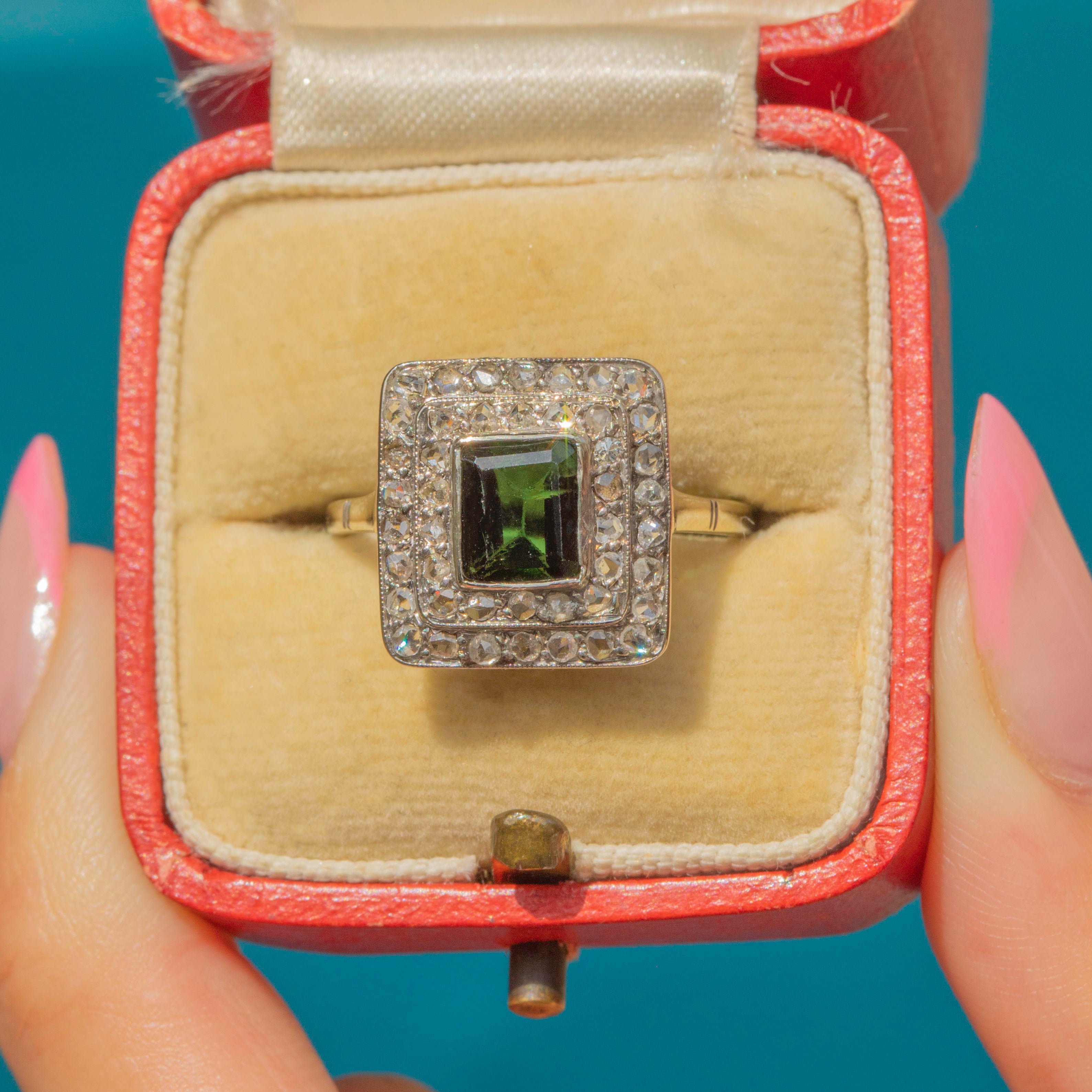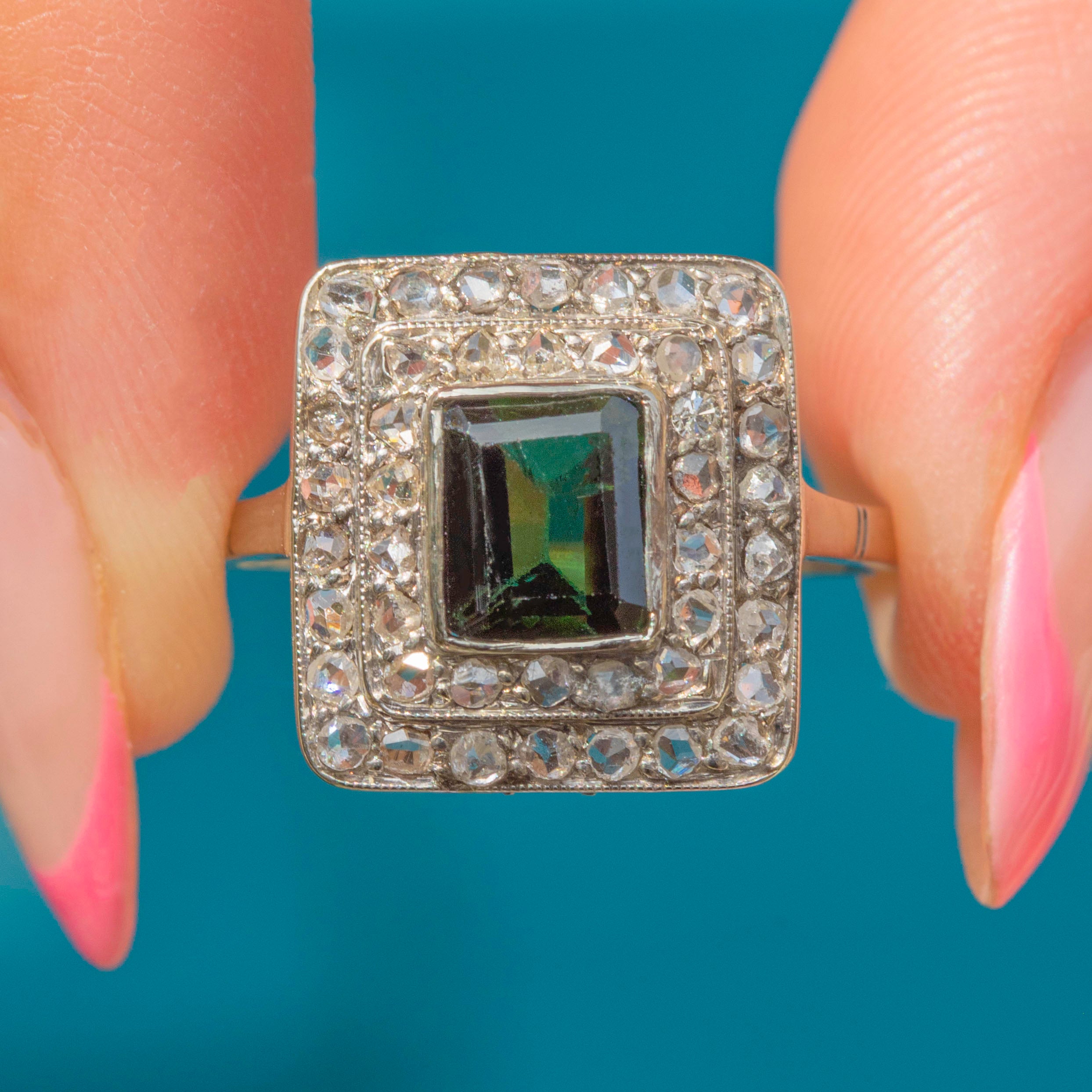 Circa 1920, this Art Deco 14ct Gold green Tourmaline Diamond cluster ring encapsulates everything we know and adore about the Art Deco period. The perfectly formed geometric face and plethora of glittering rose-cut Diamonds, providing a charismatic sparkle that's just made for dancing, cocktail and just being fabulous!!