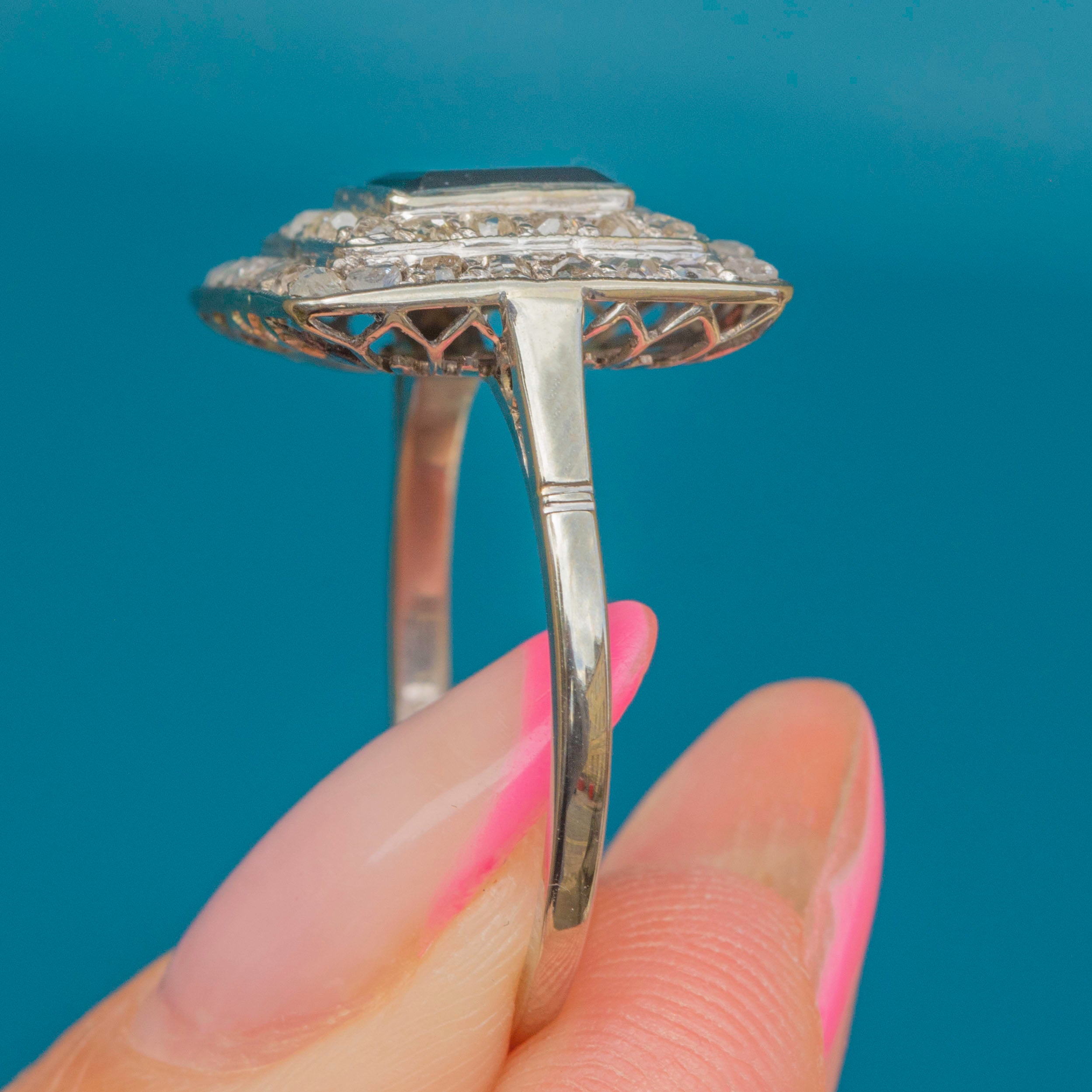 EXCELLENT. This Art Deco 14ct Gold green Tourmaline Diamond cluster ring is in excellent condition! Each gemstone is secure within its setting, with no chips or surface wear to note. The 14ct white Gold has wonderful reflective qualities and is formed with comfort in mind. The ornate Gold work on the back of the settings showcases the exceptional attention to detail throughout this Art Deco ring. We can't get enough of her and we know you won't be able to either!