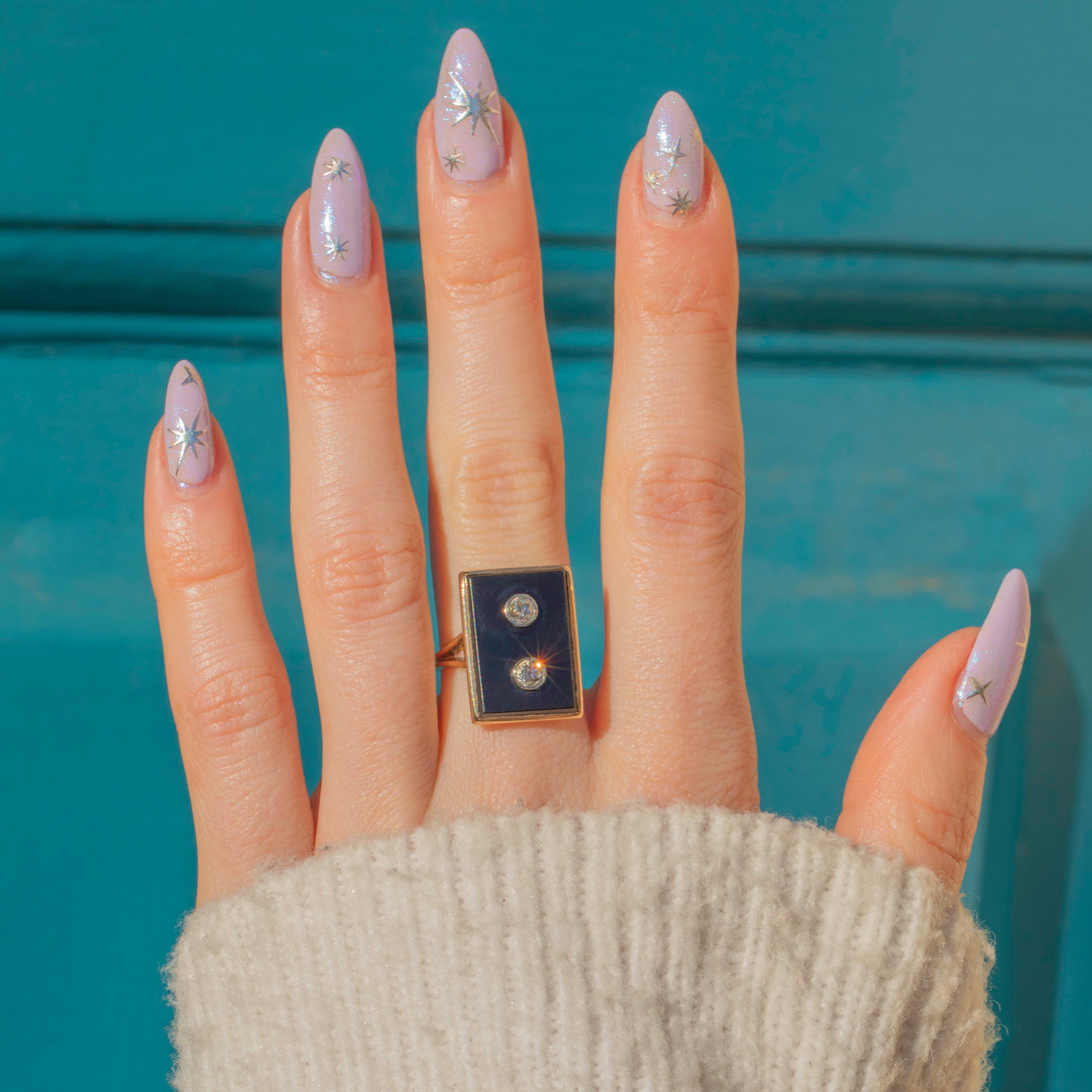 Bring some Deco decadence to your hand with this impressive Art Deco 14ct Gold Onyx Diamond panel ring! The buttery 14ct Gold displays a striking Onyx slab, inlaid with 0.30cts of old-European cut Diamonds providing the glossy ink-black surface with a bright scintillation.