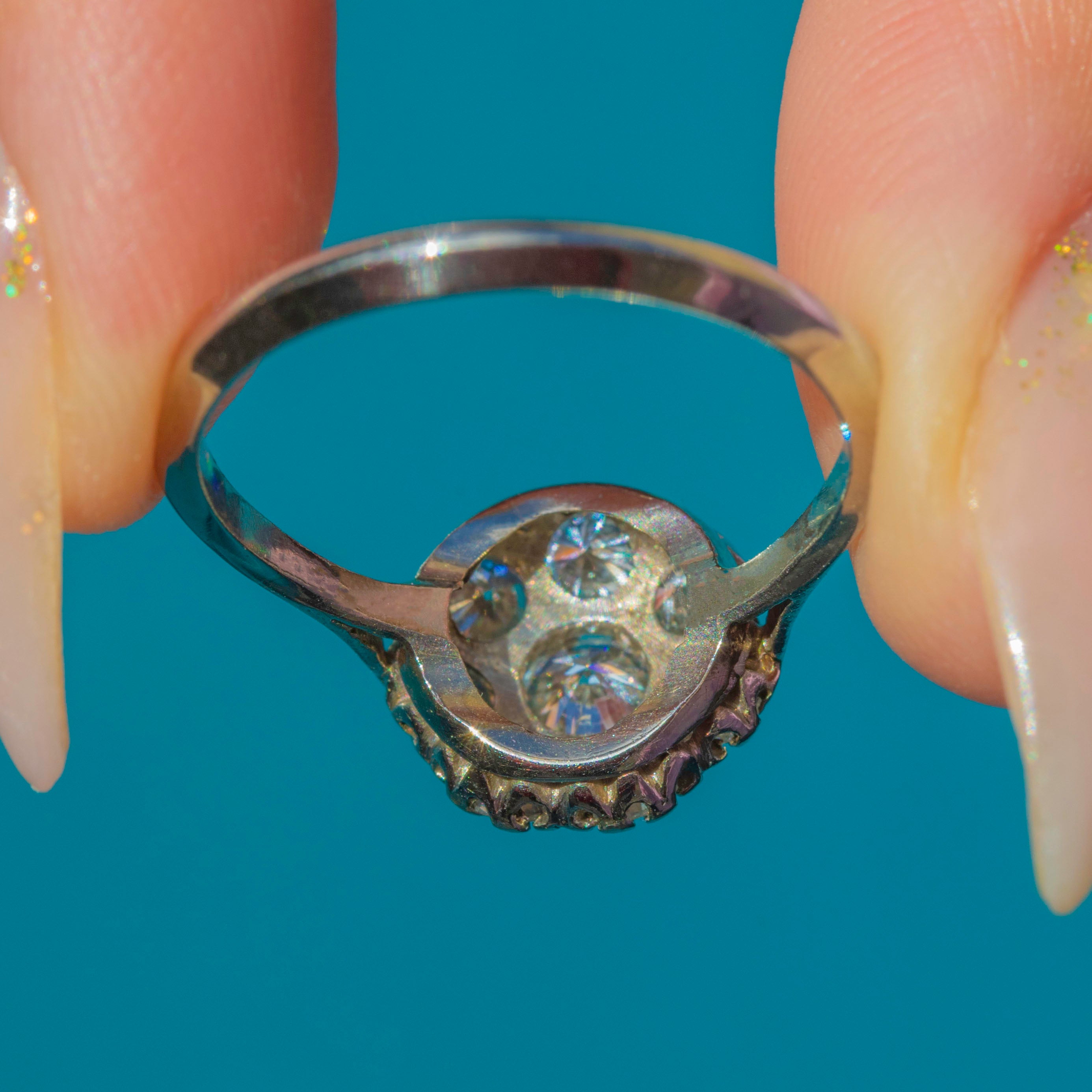 A fabulous engagement or cocktail ring from the 1940s, it captures the enduring glamour of the Art Deco style while remaining timeless and wearable today.