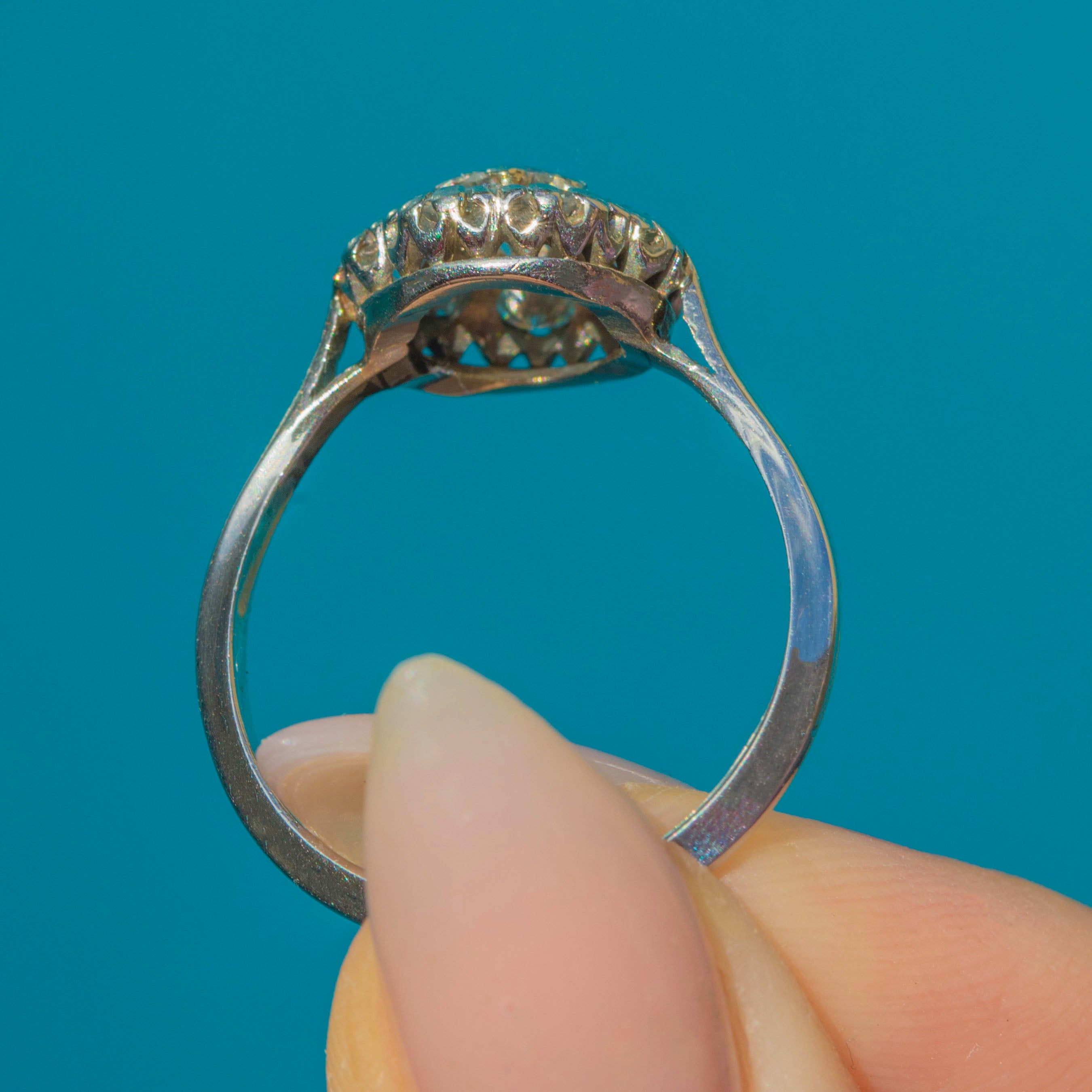 7 x halo Diamonds are approx. 3mm in diameter, weighing approx. 0.70ct combined.