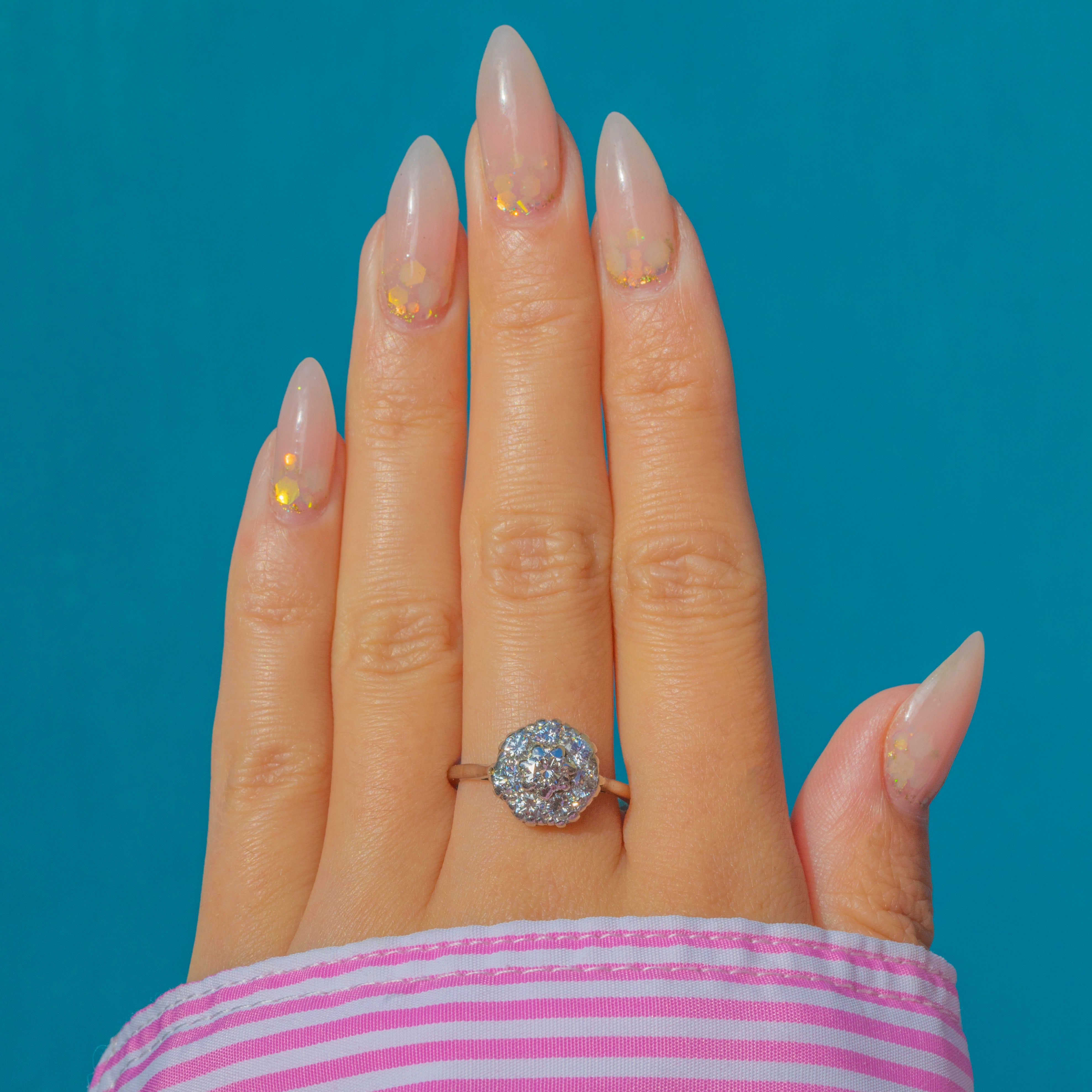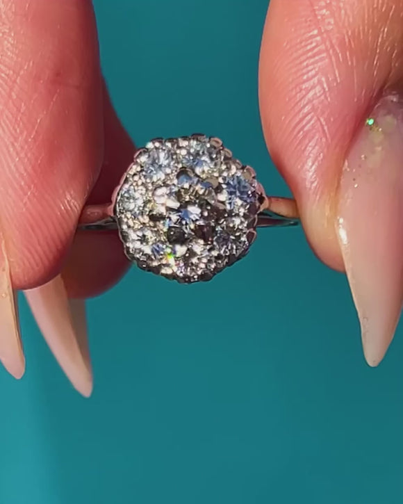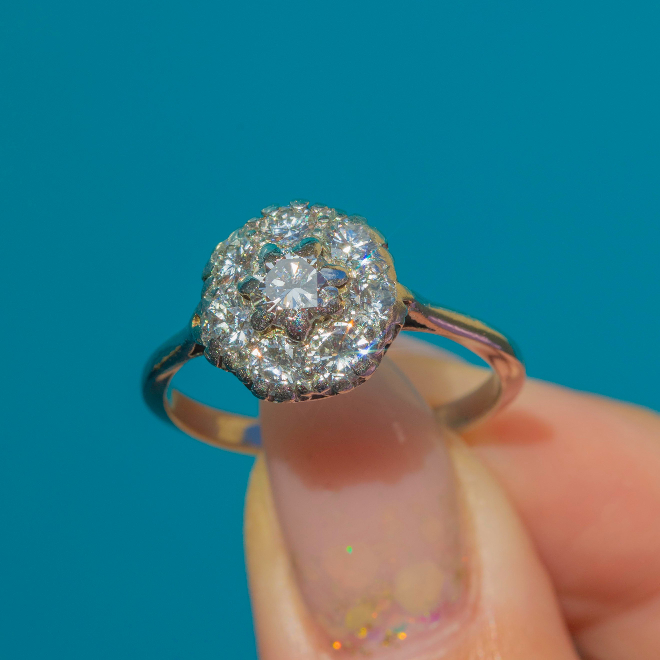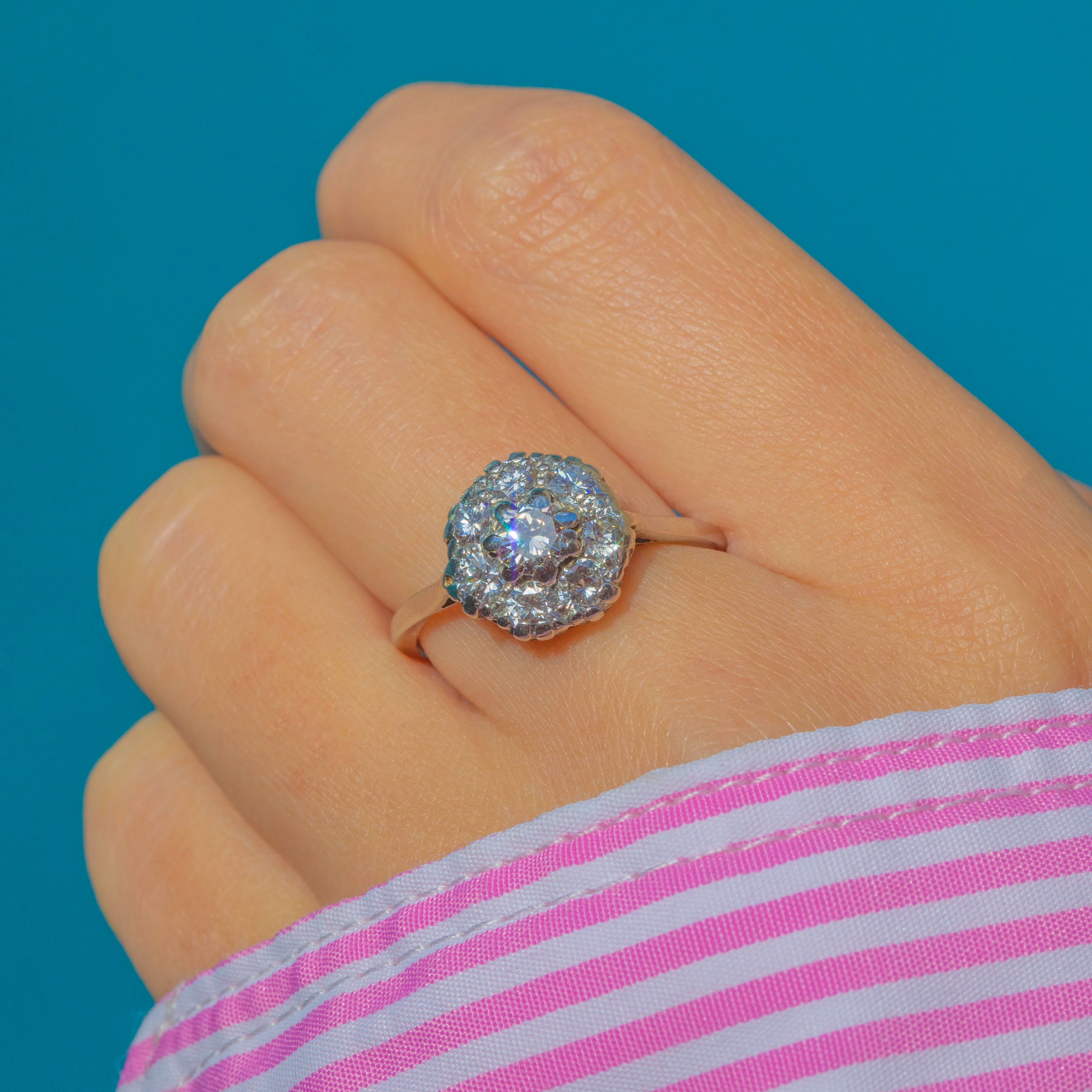This dazzling Art Deco cluster ring is crafted in 14ct White Gold with a Platinum shank, set with a lively 1.05ct of bright Diamonds. The central 4.5mm stone is encircled by a halo of seven 3mm Diamonds, forming a radiant flower-like cluster with beautiful sparkle and symmetry. The knife-edge shank enhances the ring’s bold yet refined design.