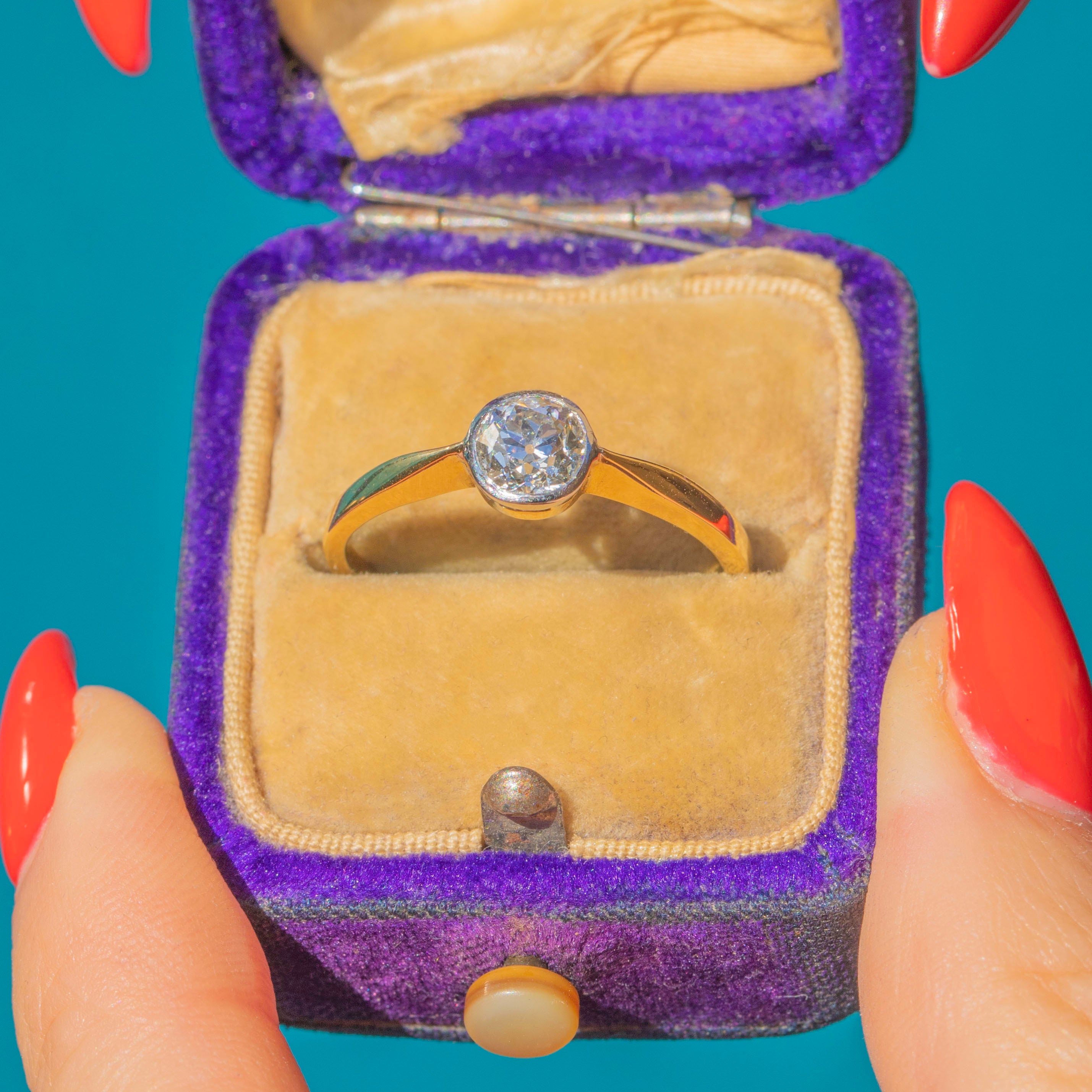 This Art Deco 18ct Gold bezel-set Diamond solitaire ring is quite remarkable. The impressive central 0.80ct Old-European Diamond is set in Platinum, and has an impressive J colour and SI1 clarity!