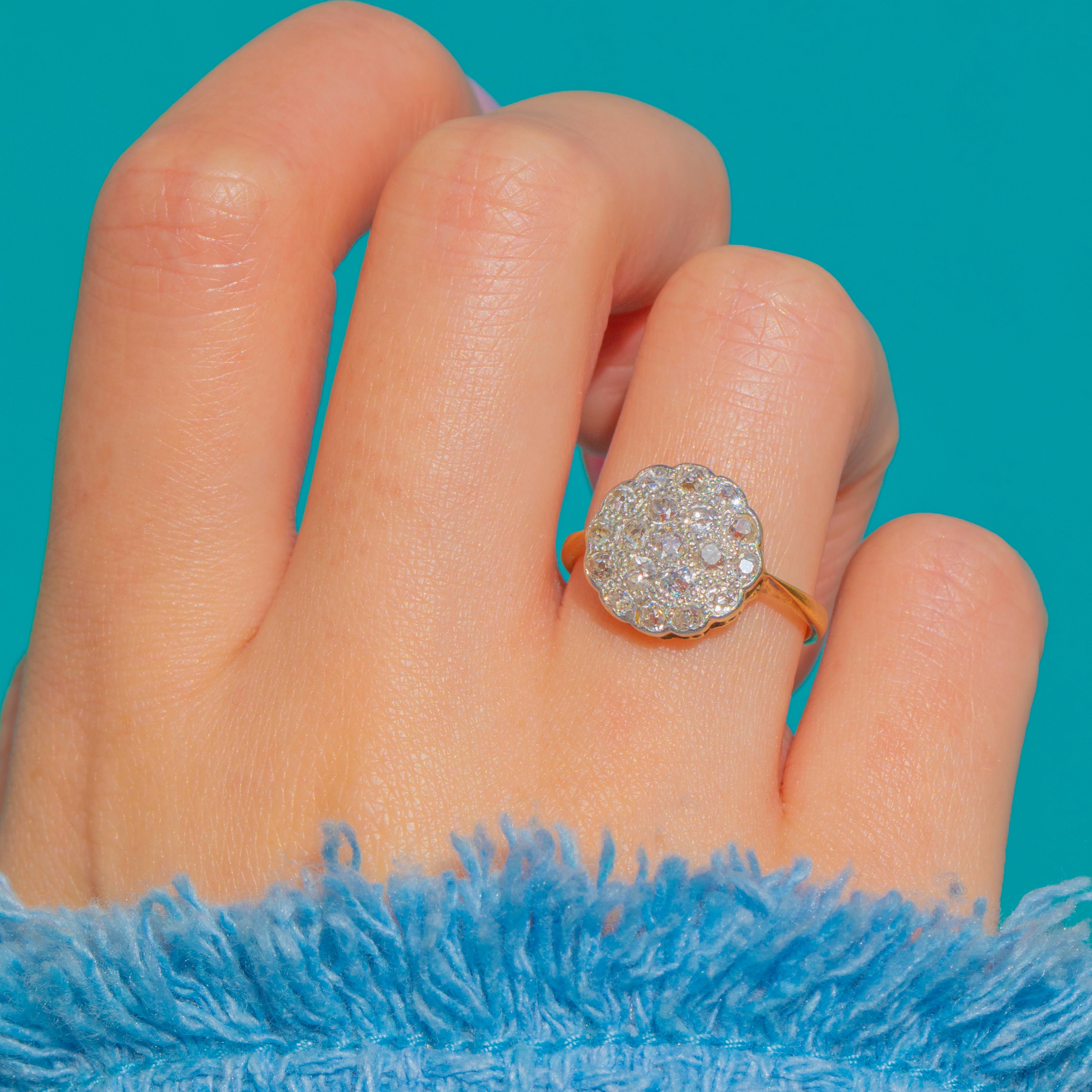 Classic Art Deco elegance with a delicate, floral twist. This radiant cluster ring blooms with sparkling Diamonds arranged in a scalloped rosette, the Platinum head enhancing their lively brilliance against the warmth of 18ct Gold.