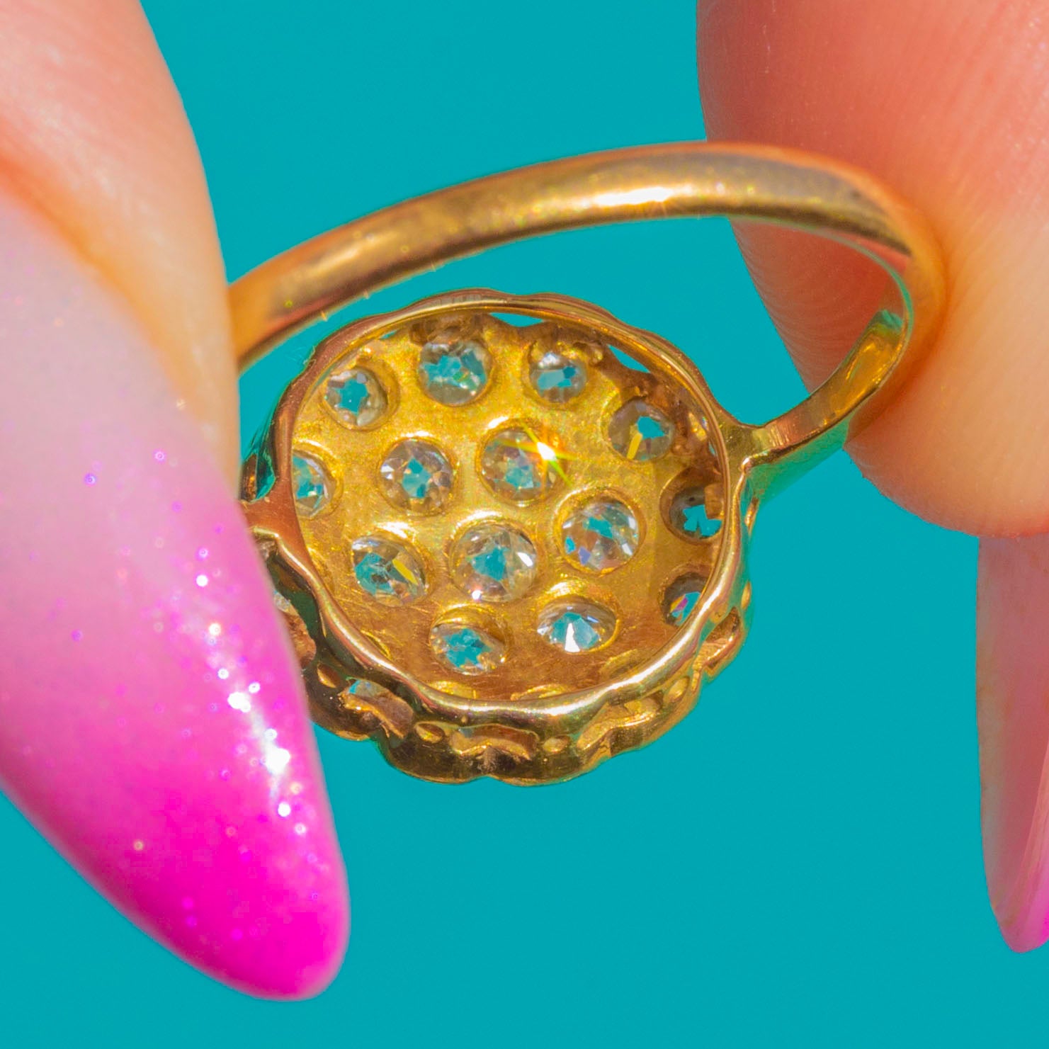 A raised, airy gallery lends lightness and poise, while the slim shank keeps the focus on that romantic glow of 0.40cts softly twinkling antique Diamonds!