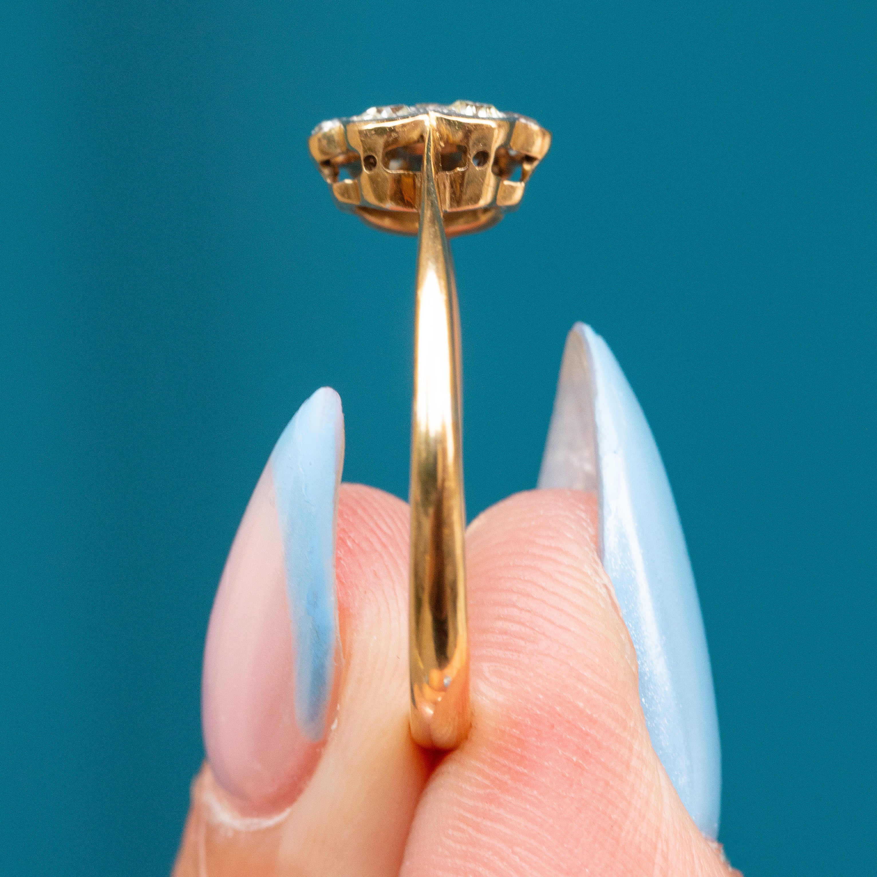 Crafted from a combination of 18ct yellow Gold with lustrous Platinum settings, this antique ring flaunts 0.20cts of bright and lively Round Brilliant Diamonds, each with a distinct sparkle.
