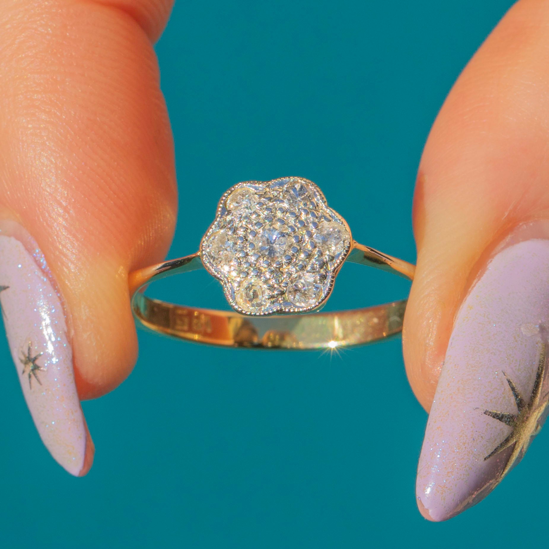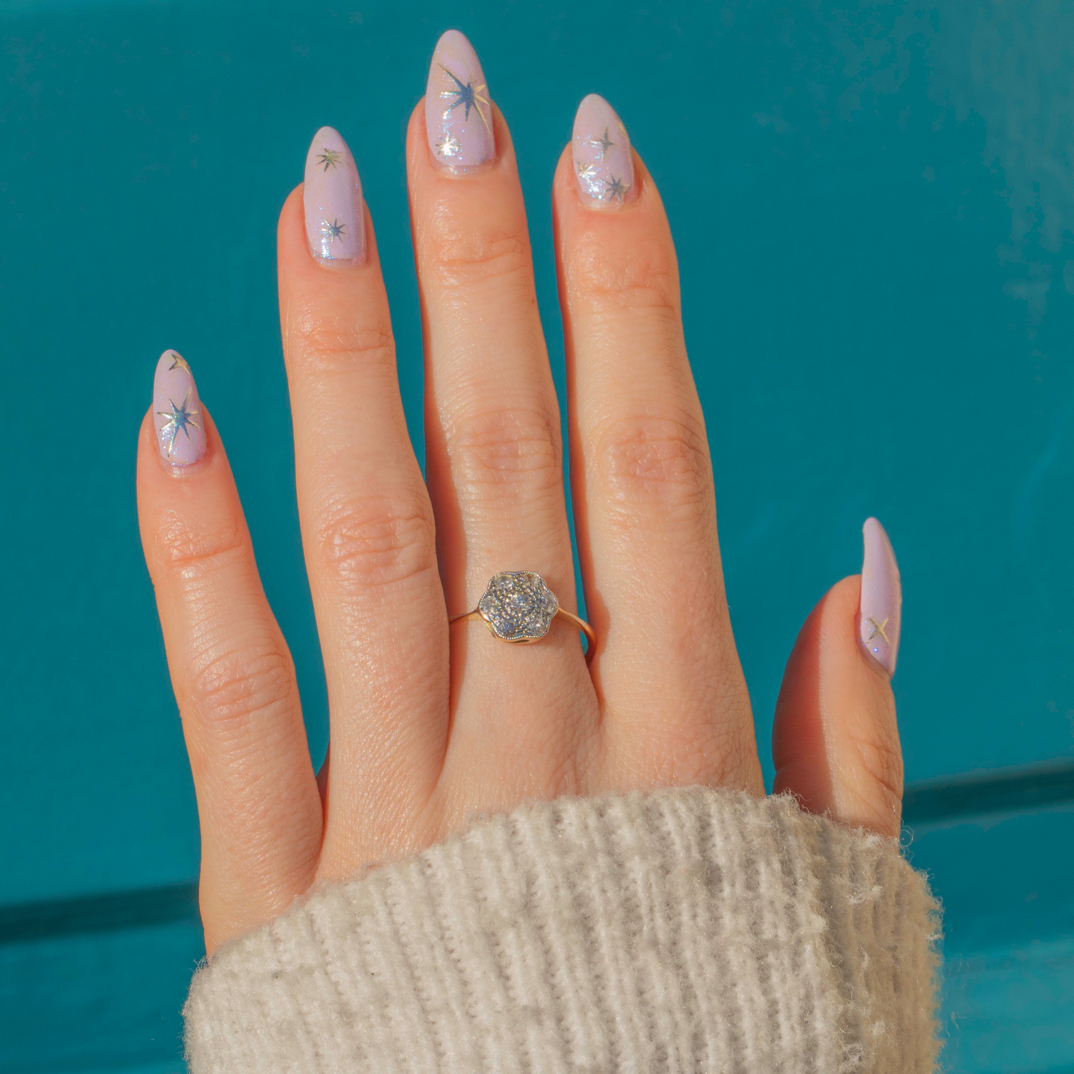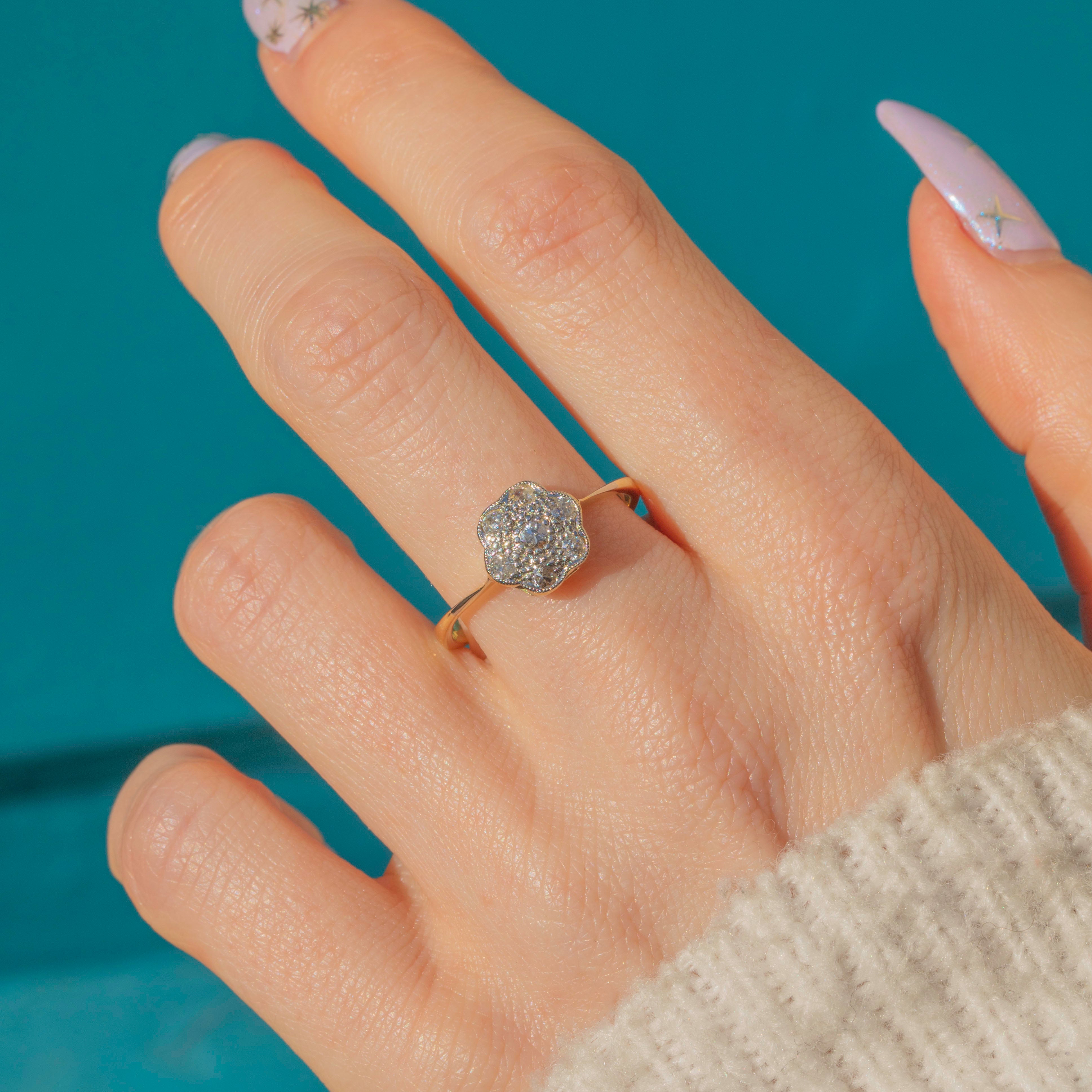 A gorgeous Art Deco 18ct Gold Diamond daisy cluster ring! This Art Deco delight has been crafted from solid 18ct yellow Gold and showcases a feminine daisy cluster of Diamonds set in Platinum.