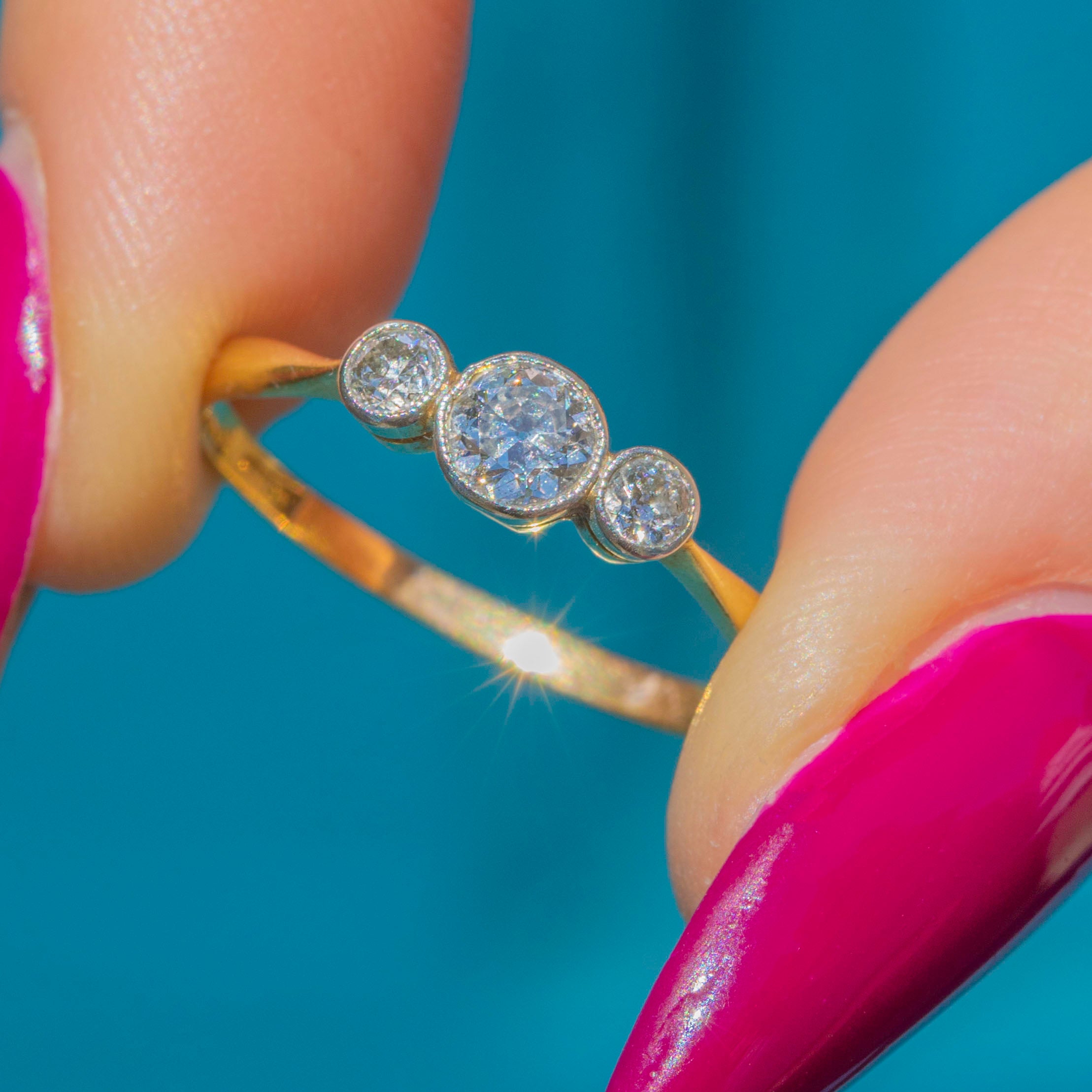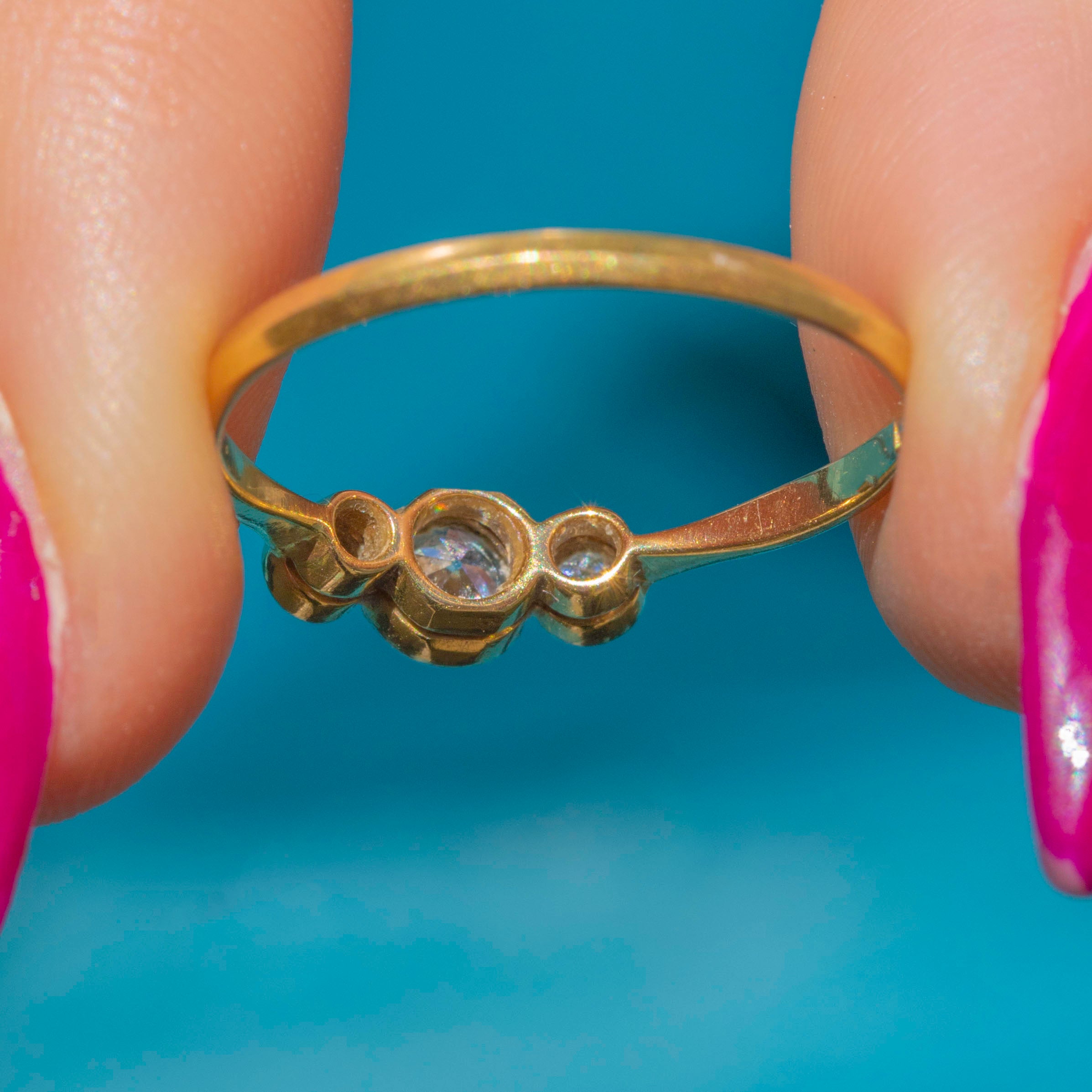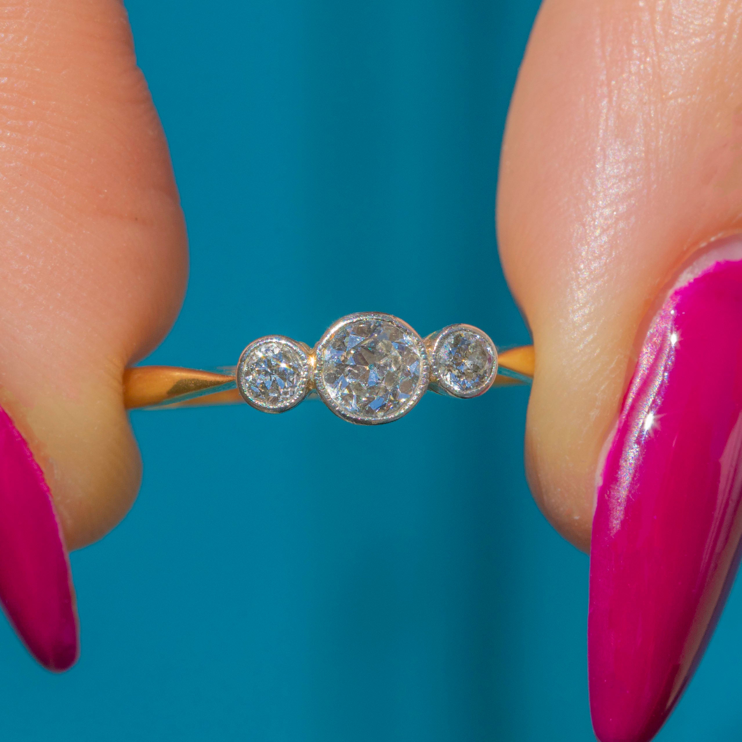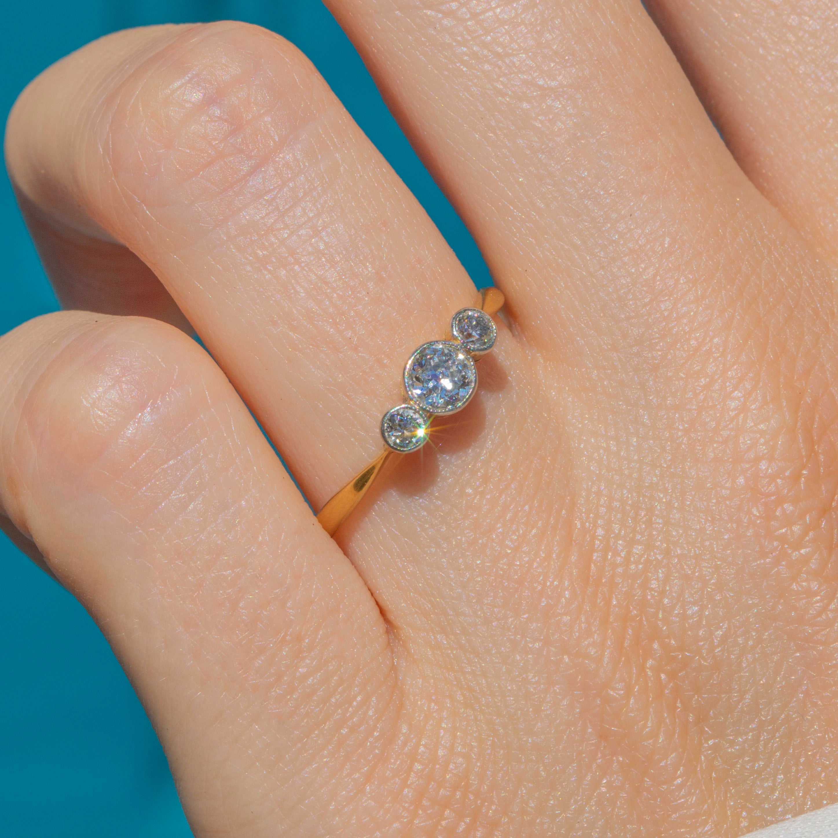 VERY GOOD: The Diamonds are a rare old European cut, all a generous size, clear and attractive colour. The Diamonds are secure within Platinum bezels, and the band, which, despite its thin stature, feels robust and strong. There is a resize mark on the band, noticeable due to a slight variation in hue to the Gold, which won't be noticeable while the ring is worn. Overall, a simply gorgeous engagement ring that your partner-to-be won't be able to resist.