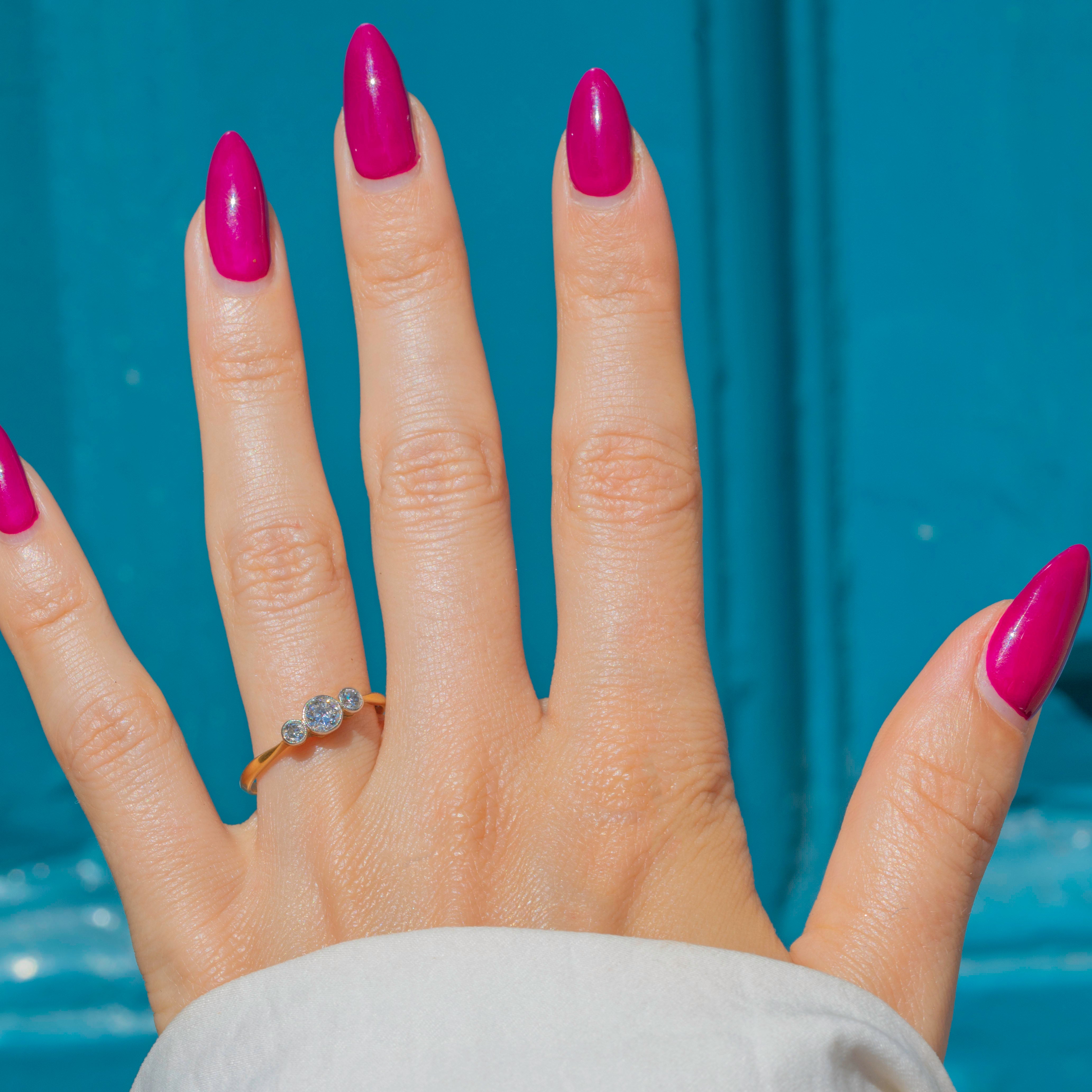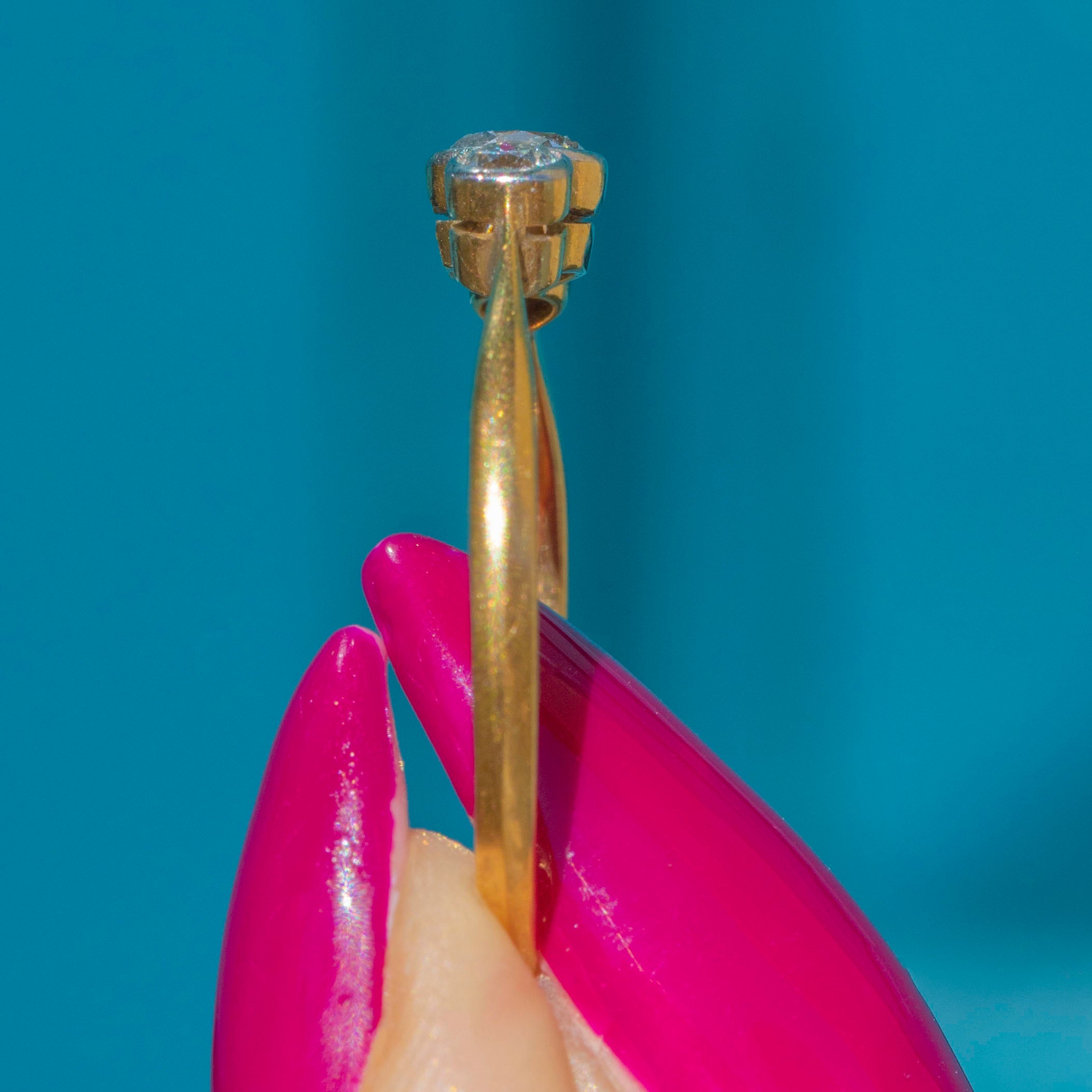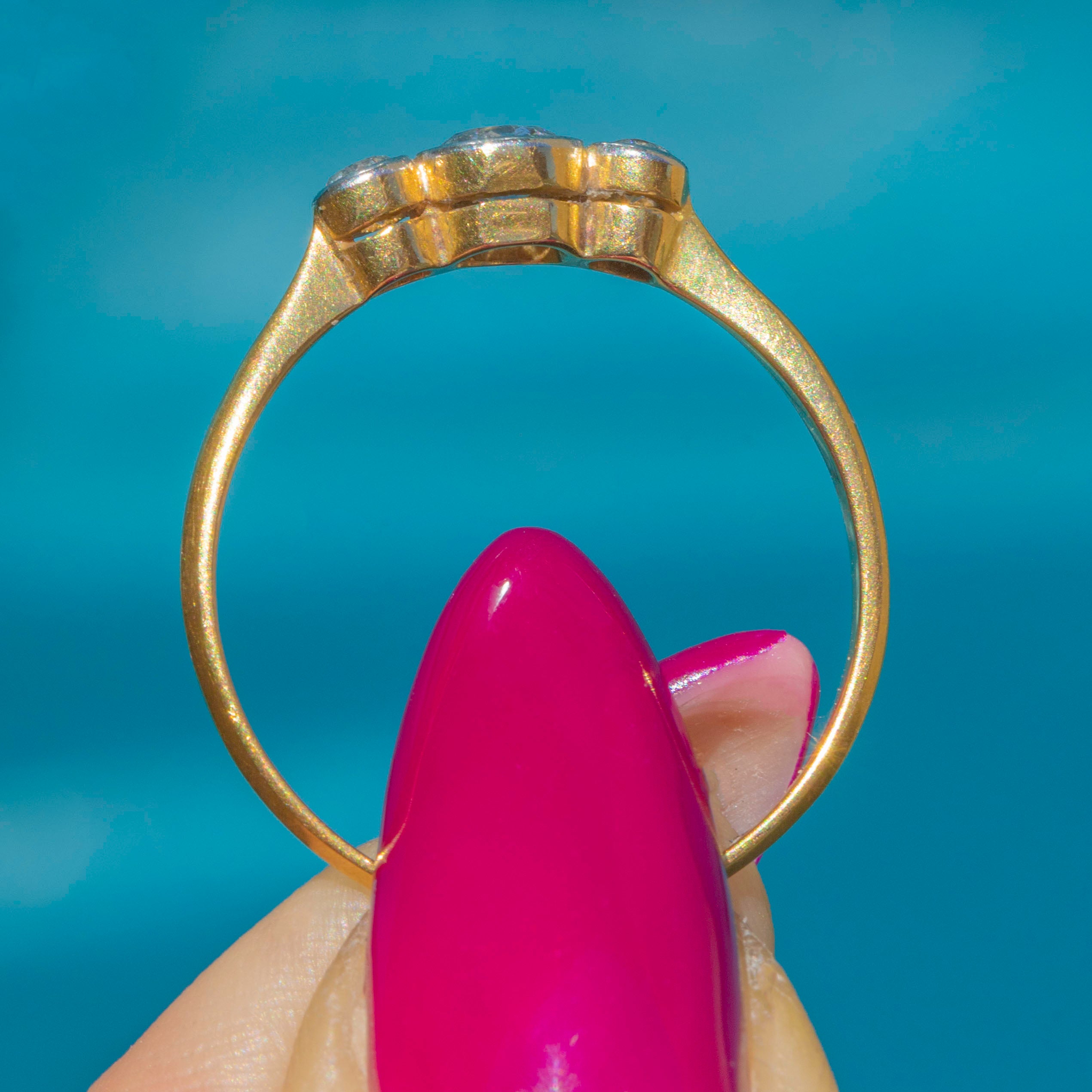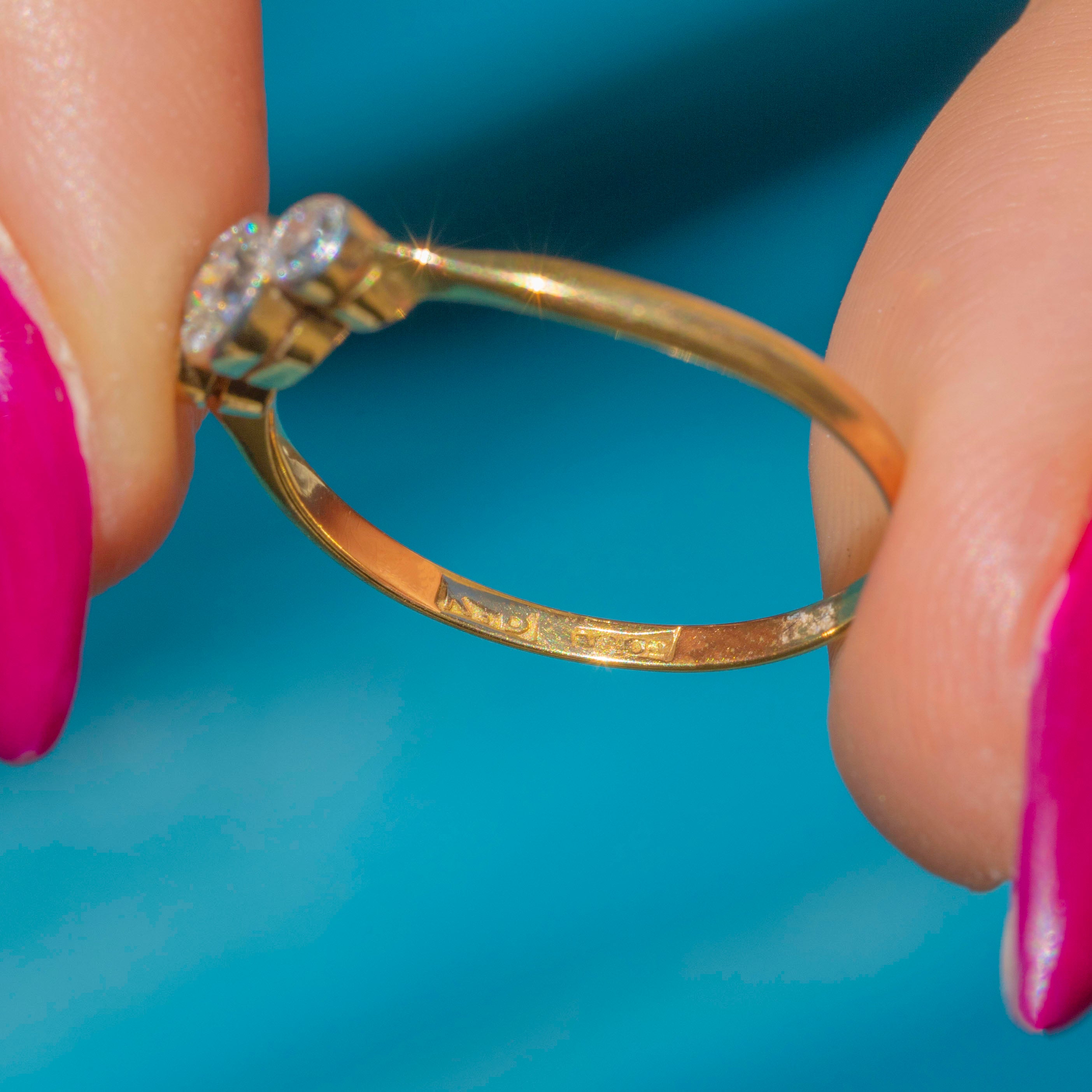 VERY GOOD: The Diamonds are a rare old European cut, all a generous size, clear and attractive colour. The Diamonds are secure within Platinum bezels, and the band, which, despite its thin stature, feels robust and strong. There is a resize mark on the band, noticeable due to a slight variation in hue to the Gold, which won't be noticeable while the ring is worn. Overall, a simply gorgeous engagement ring that your partner-to-be won't be able to resist.