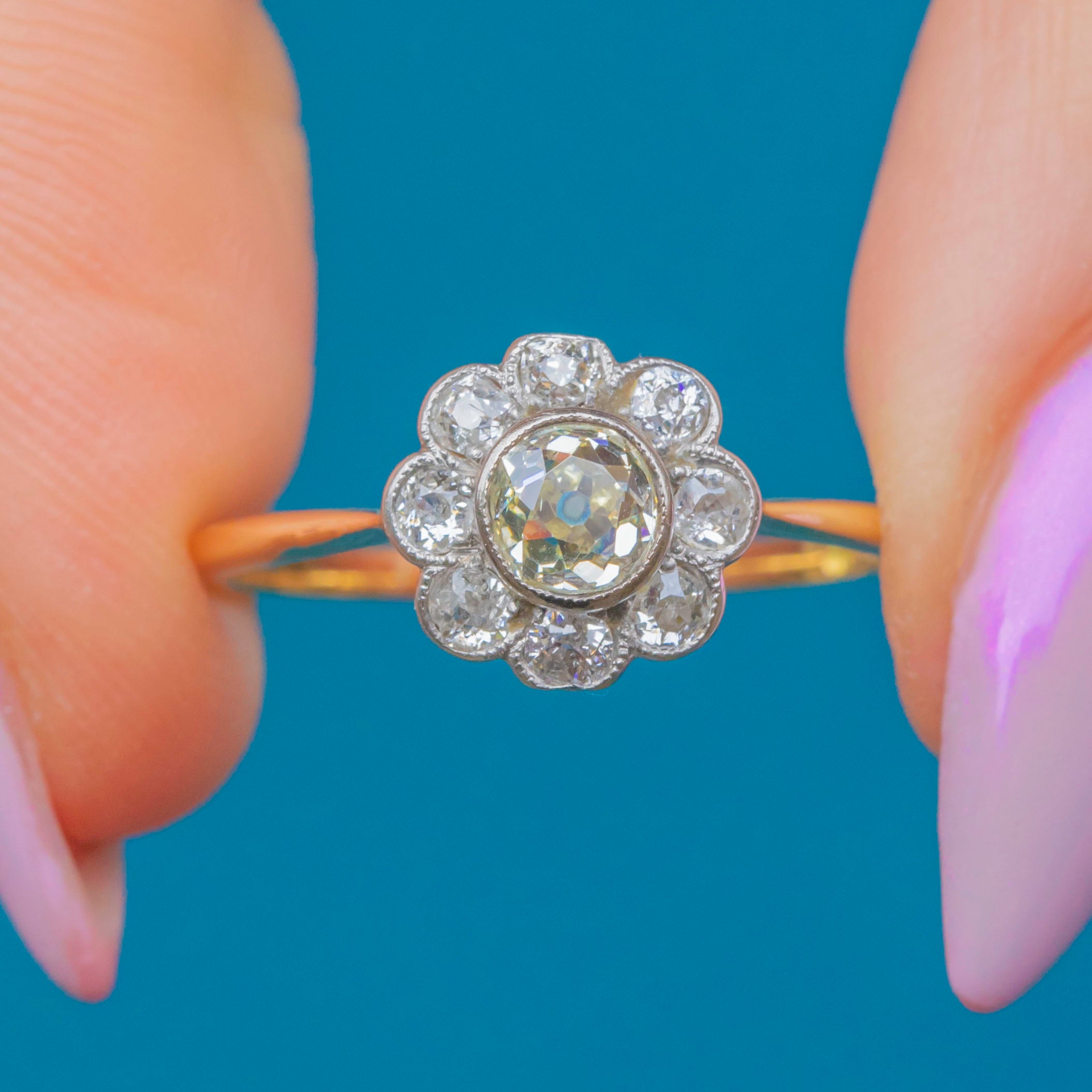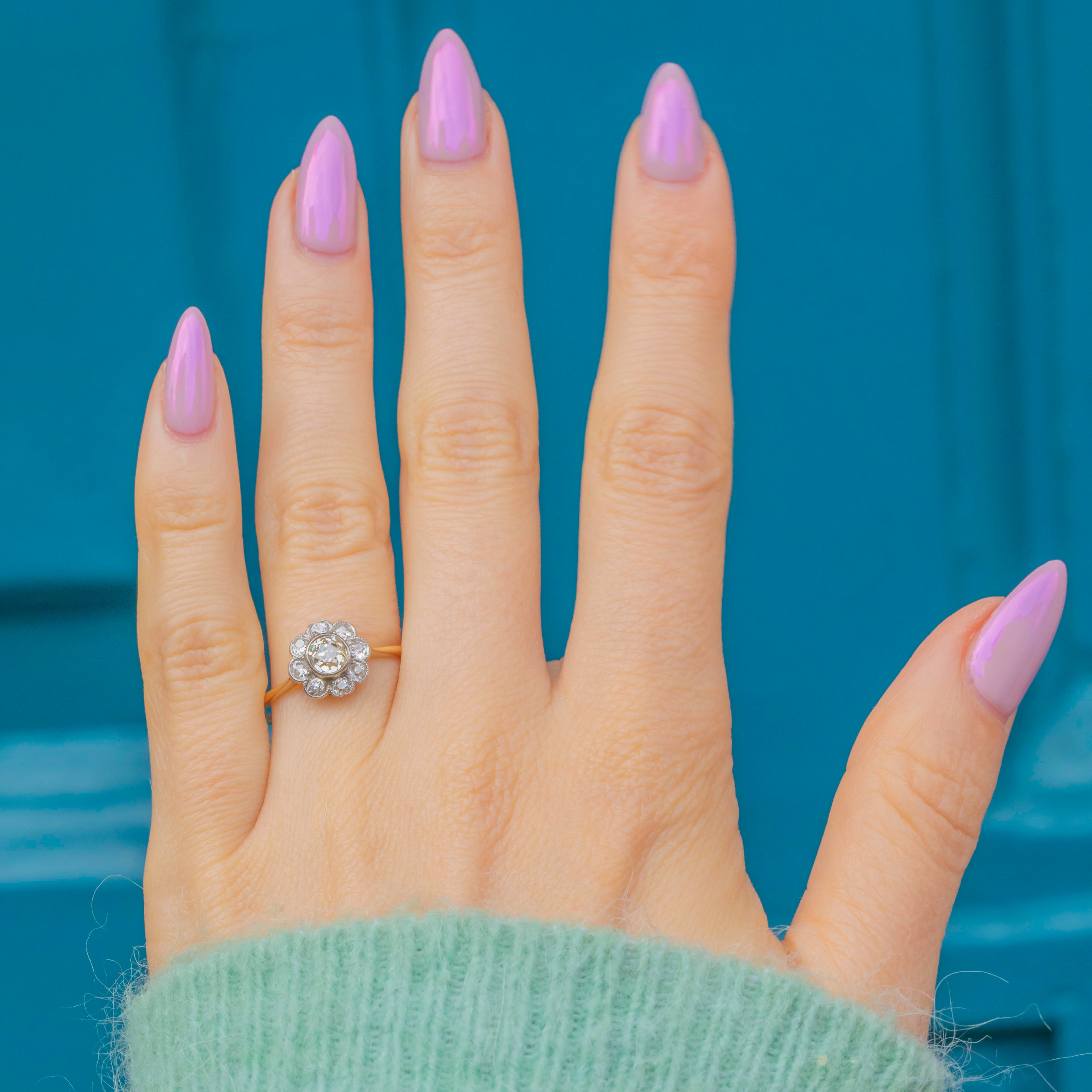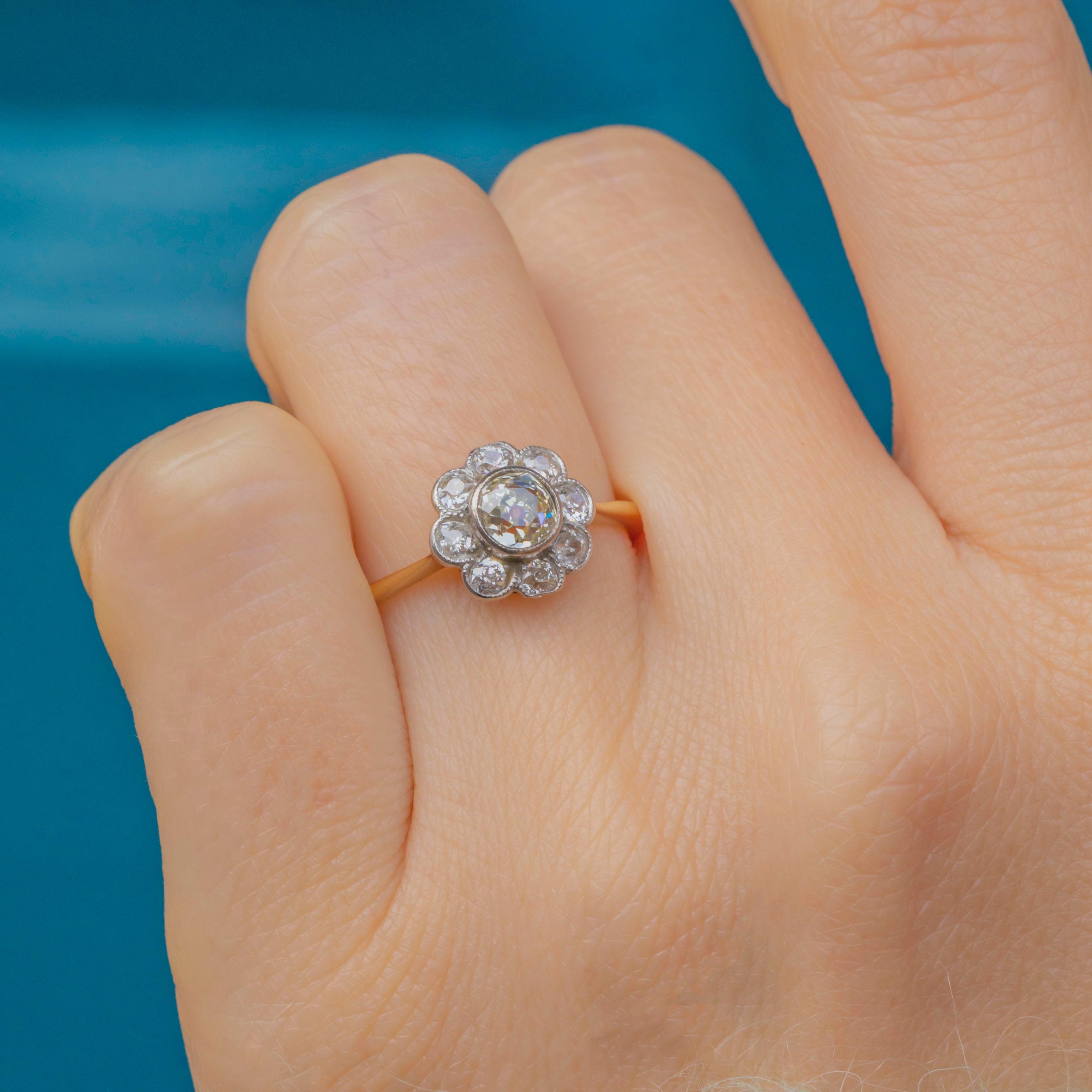 The centre Diamond weighs approximately 0.50ct and measures 5mm across, encircled by eight 3mm old-cut white Diamonds of around 0.07ct each, for a total of approximately 1.06ct combined weight. The cluster sits proudly atop an elegant knife-edge 18ct Gold band, a classic Art Deco design detail that enhances the brilliance of the Diamonds while keeping the ring light and refined on the hand.