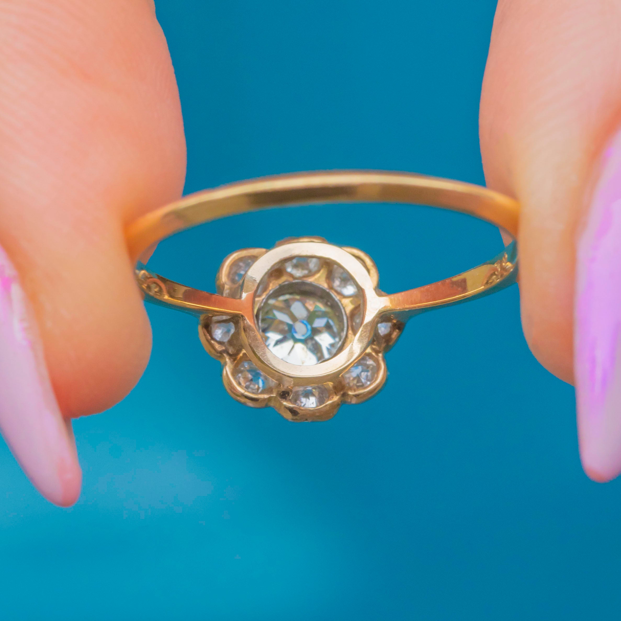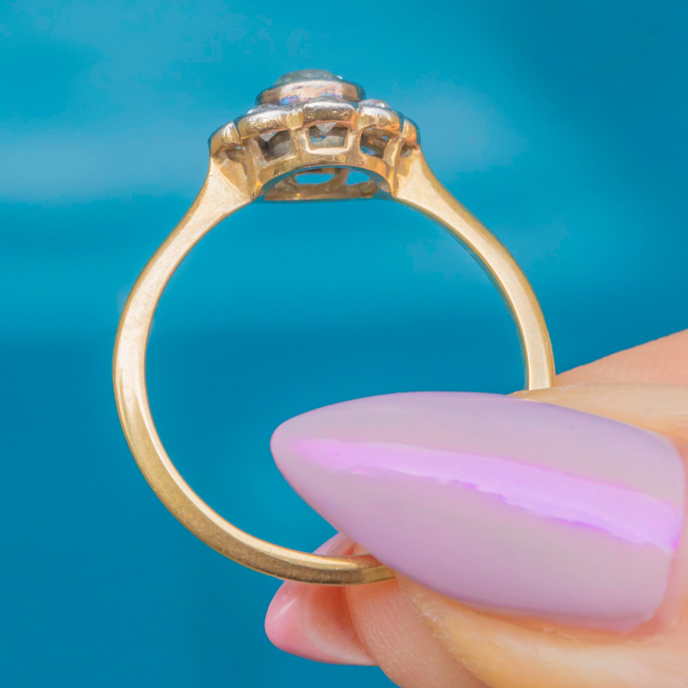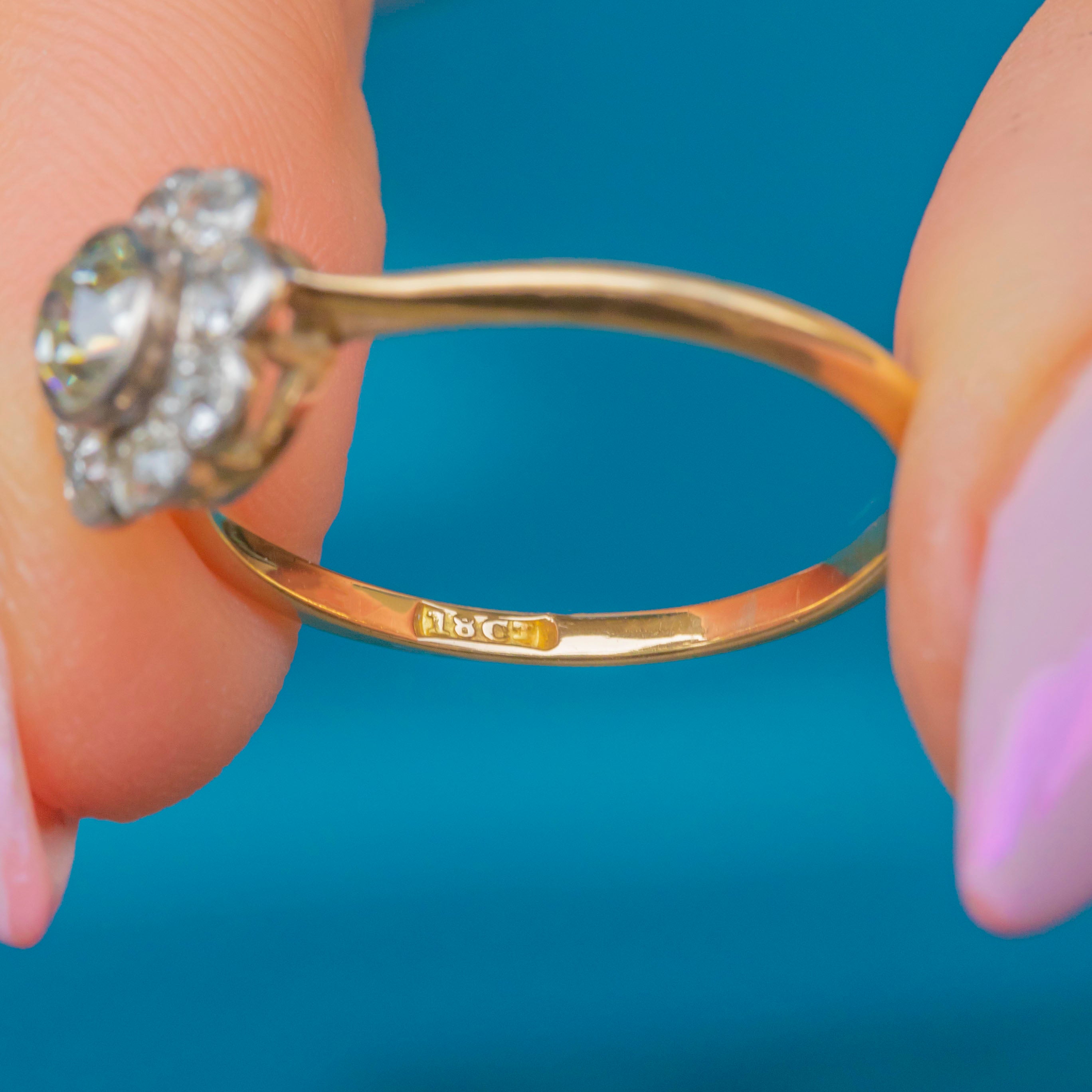 The centre Diamond weighs approximately 0.50ct and measures 5mm across, encircled by eight 3mm old-cut white Diamonds of around 0.07ct each, for a total of approximately 1.06ct combined weight. The cluster sits proudly atop an elegant knife-edge 18ct Gold band, a classic Art Deco design detail that enhances the brilliance of the Diamonds while keeping the ring light and refined on the hand.