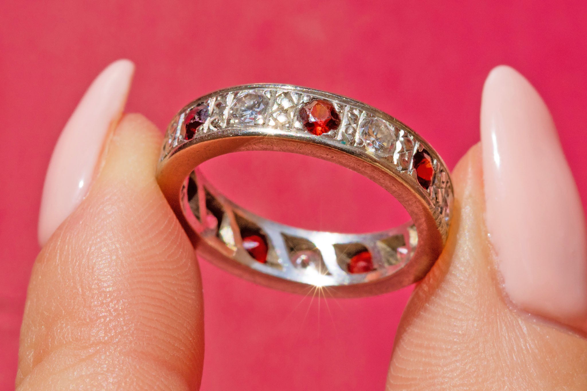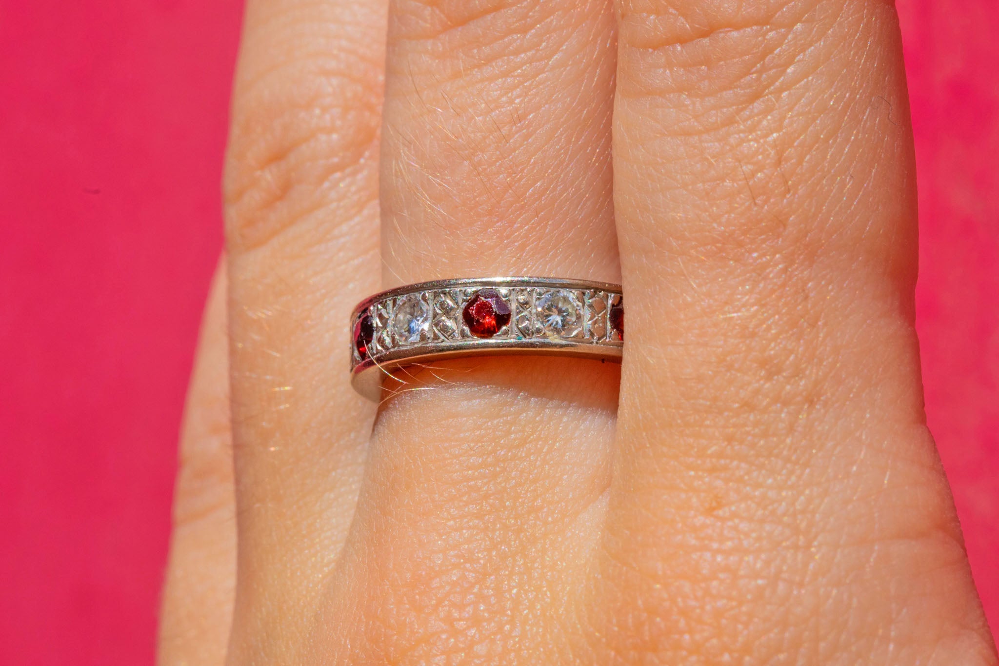 EXCELLENT. This Art Deco 18ct Gold Garnet Diamond eternity ring is in excellent condition! The 18ct white Gold band is sturdy and has kept her shape remarkably well. The Garnets and Diamonds are secure and complement each other perfectly. The engraved markings on either side of the band are crisp and include the sweet engraving of initials from two lovers. With no faults to note, this antique ring promises you many more years of wear and enjoyment.