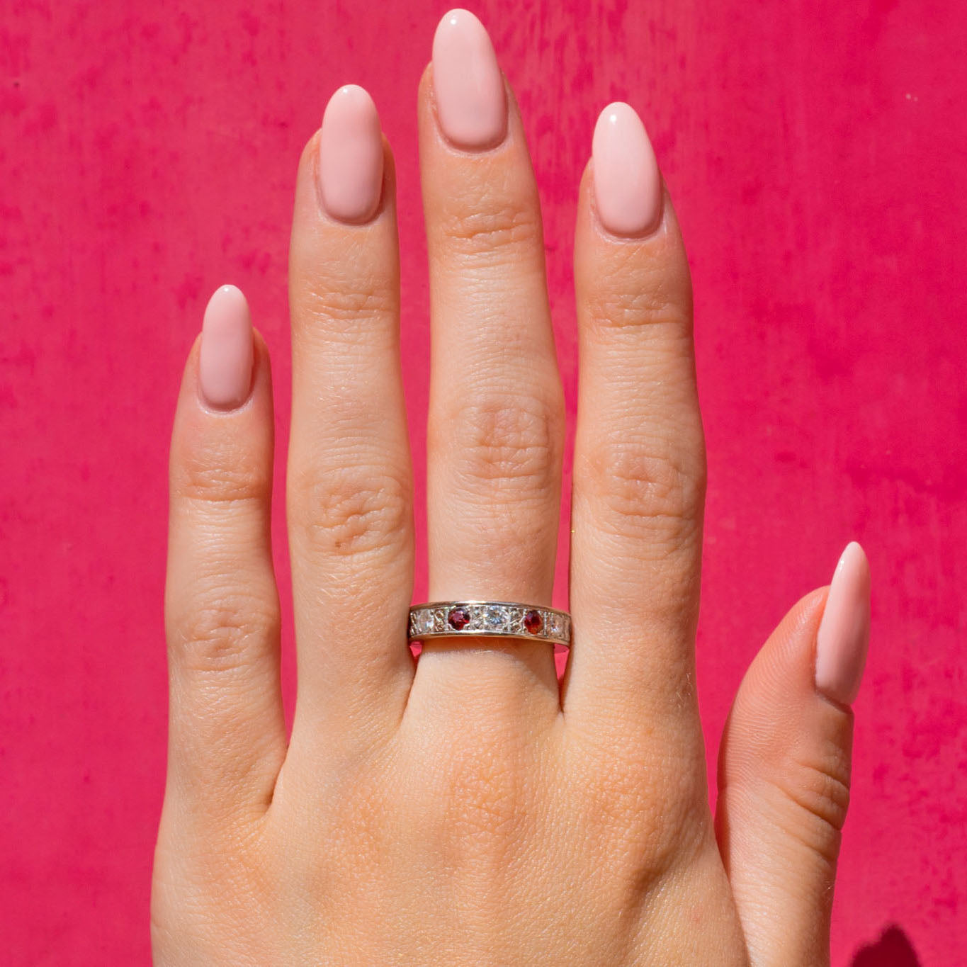 Gliding smoothly onto the finger, this Art Deco 18ct Gold Garnet Diamond eternity ring is an easy yes! Inlaid with 7 plump and juicy Garnets oozing sangria red, they alternate between 7 scintillating Diamonds, making this antique eternity ring a playful choice to symbolise your everlasting love to your partner.