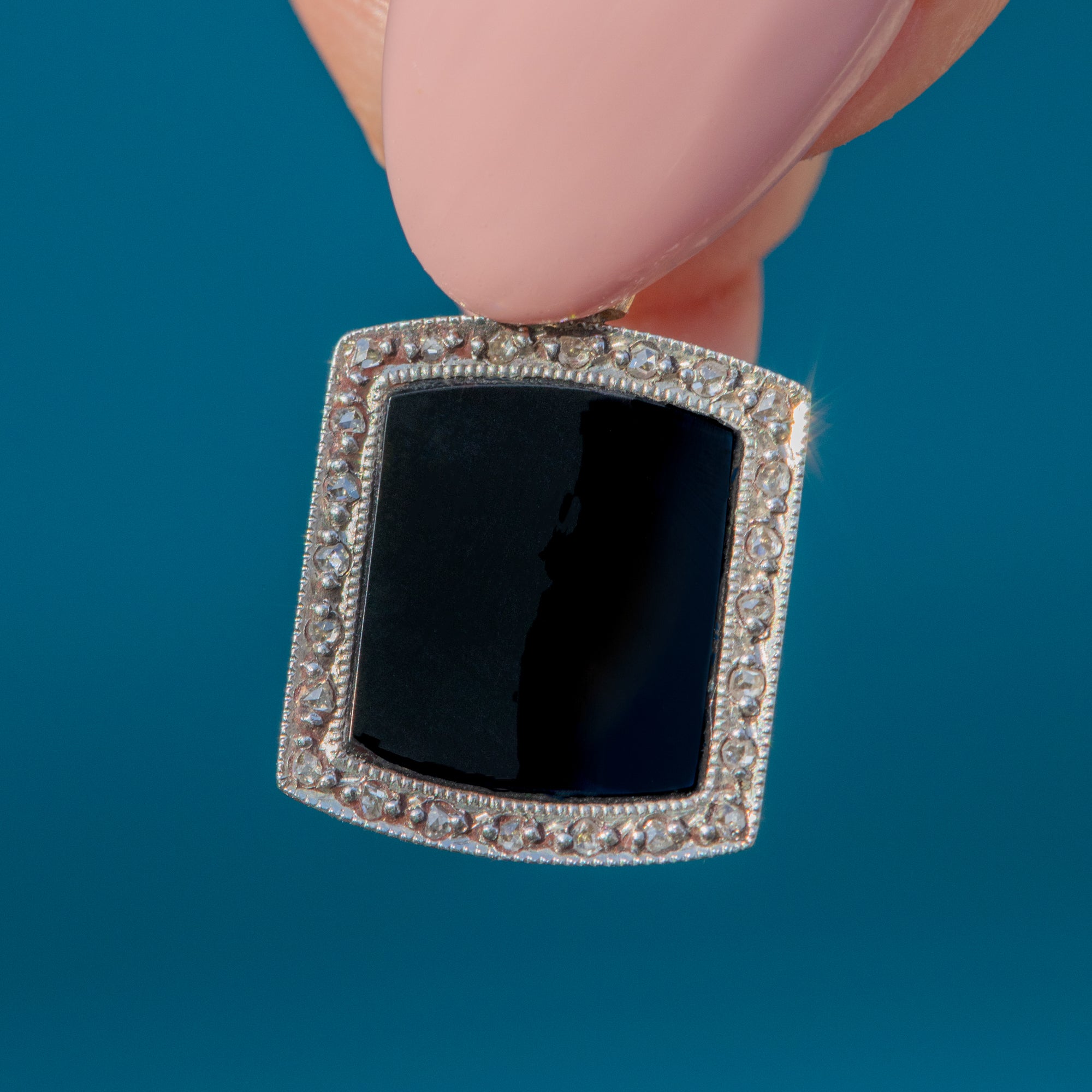 EXCELLENT. This Art Deco 18ct Gold Onyx Diamond panel charm is in excellent condition. She features a beautifully smooth cut of rich black Onyx, free from scratches or chips. Her twinkling Diamond border sparkles like a dream, with each stone securely set and showing only the tiniest signs of age-related wear. The lustrous 18ct White Gold shines brightly, enhancing her elegance. What a delight!