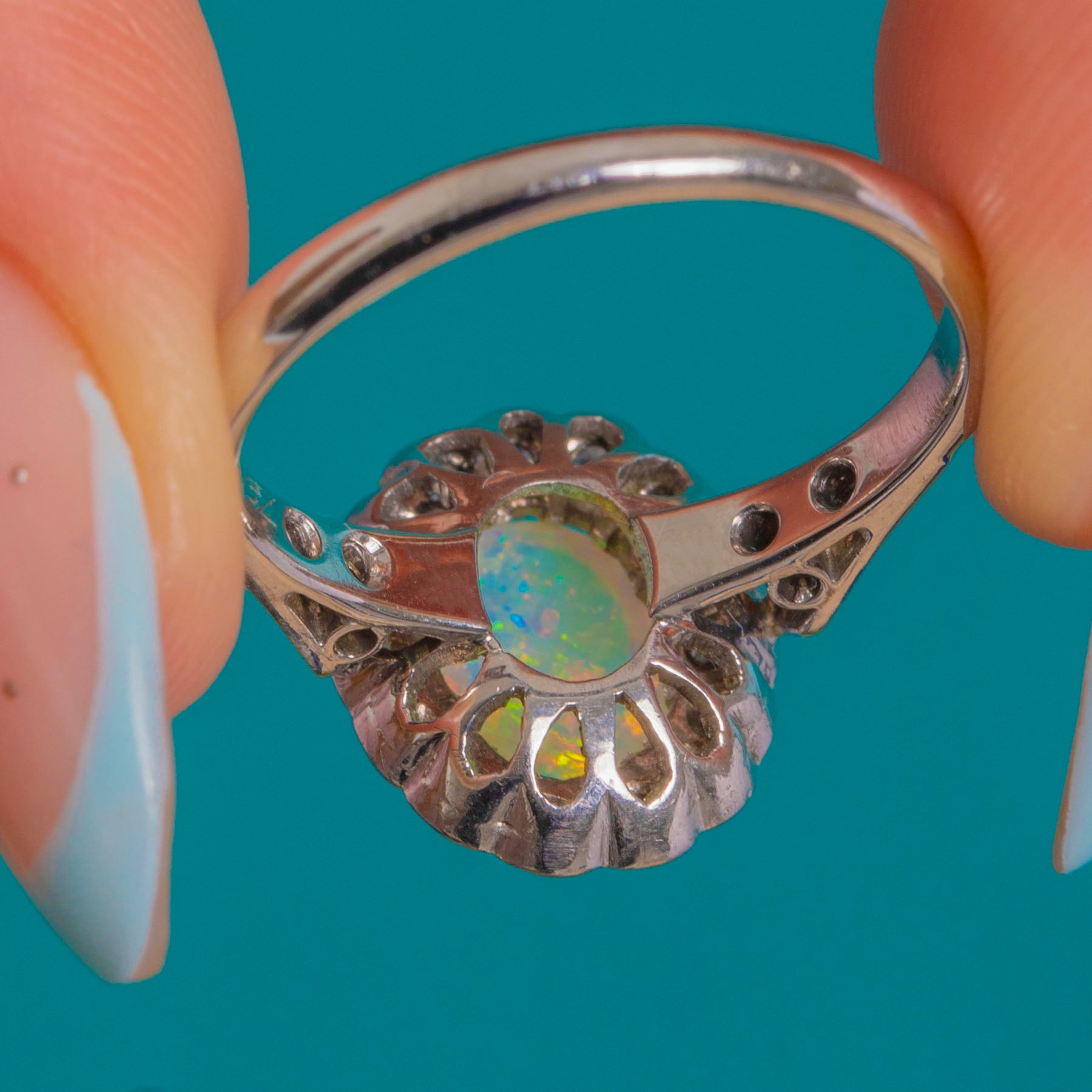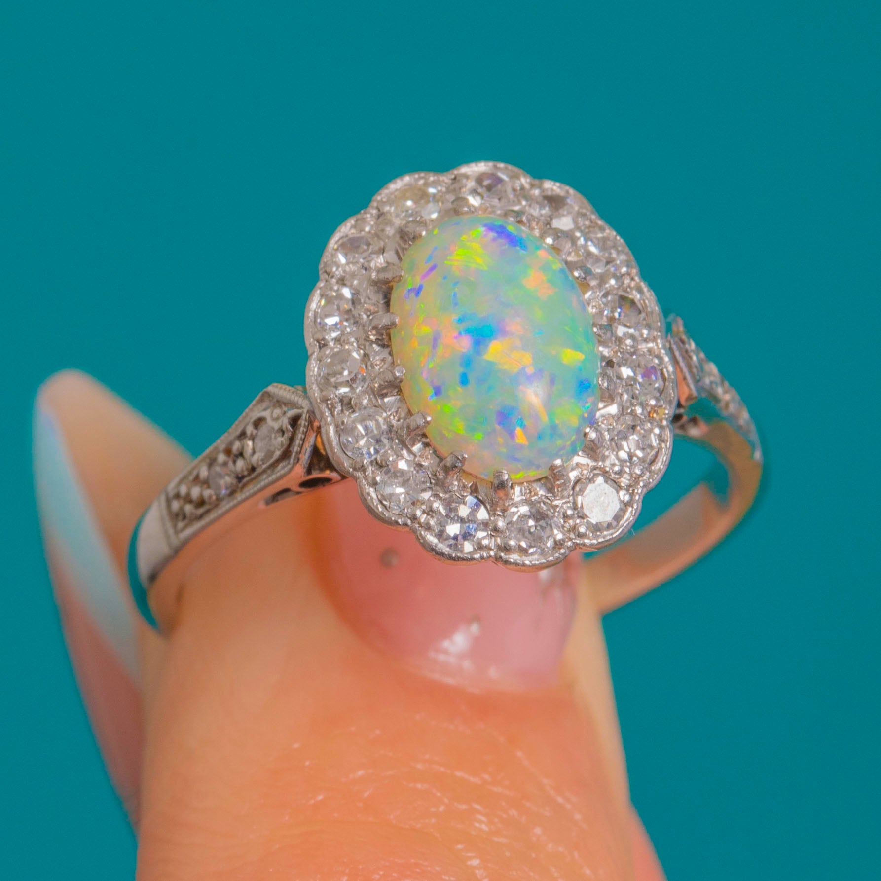 Prepare to have your breath taken away by the sheer beauty of this Art Deco 18ct White Gold Opal Diamond cluster ring! Her oval 0.70ct Opal cabochon is akin to a burst of confetti as it catches the light, flaunting a spectrum of iridescent flashes which will never fail to amaze.