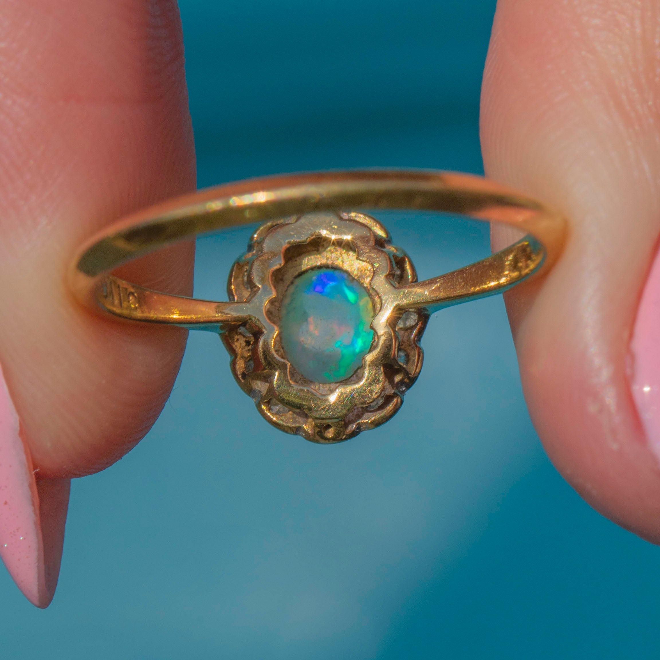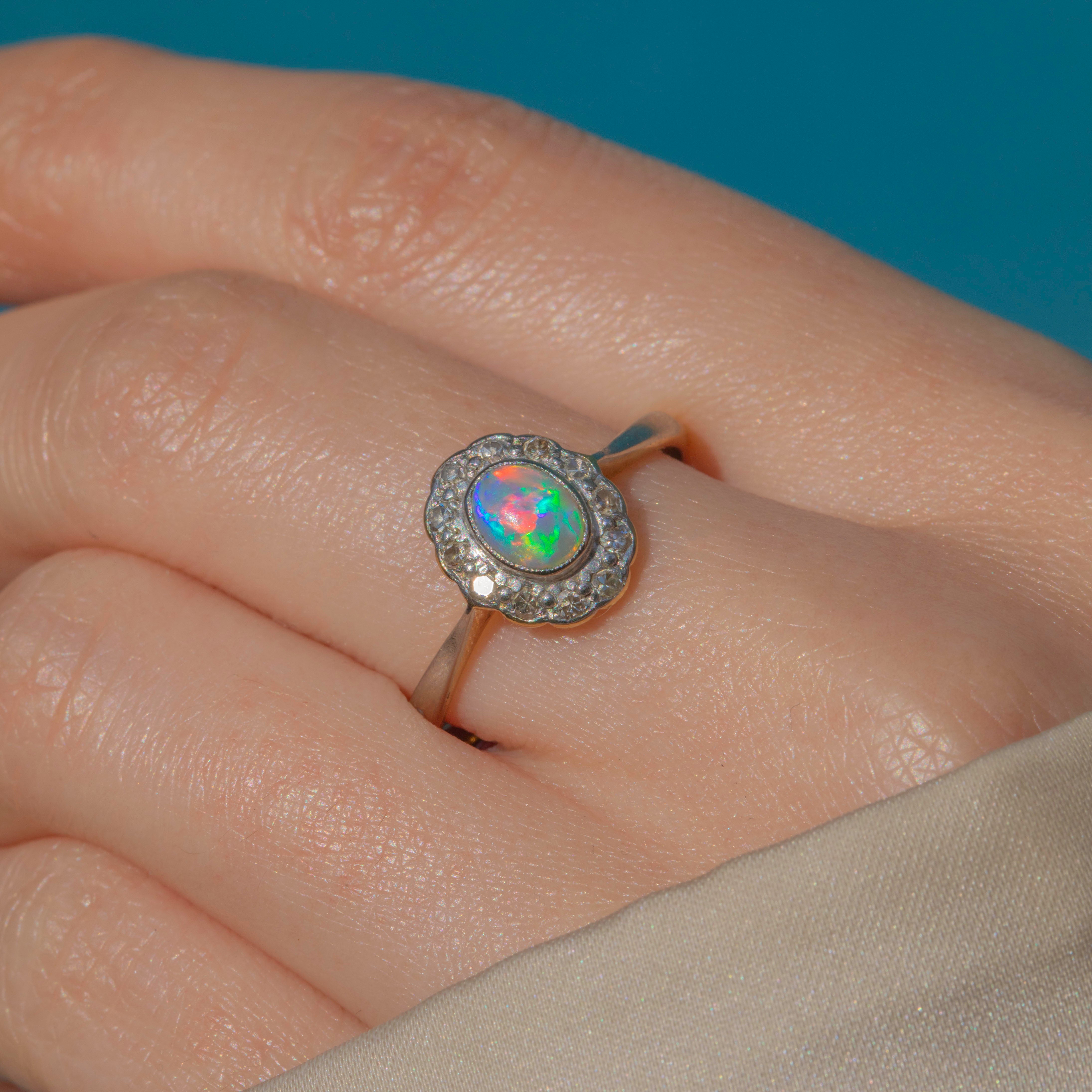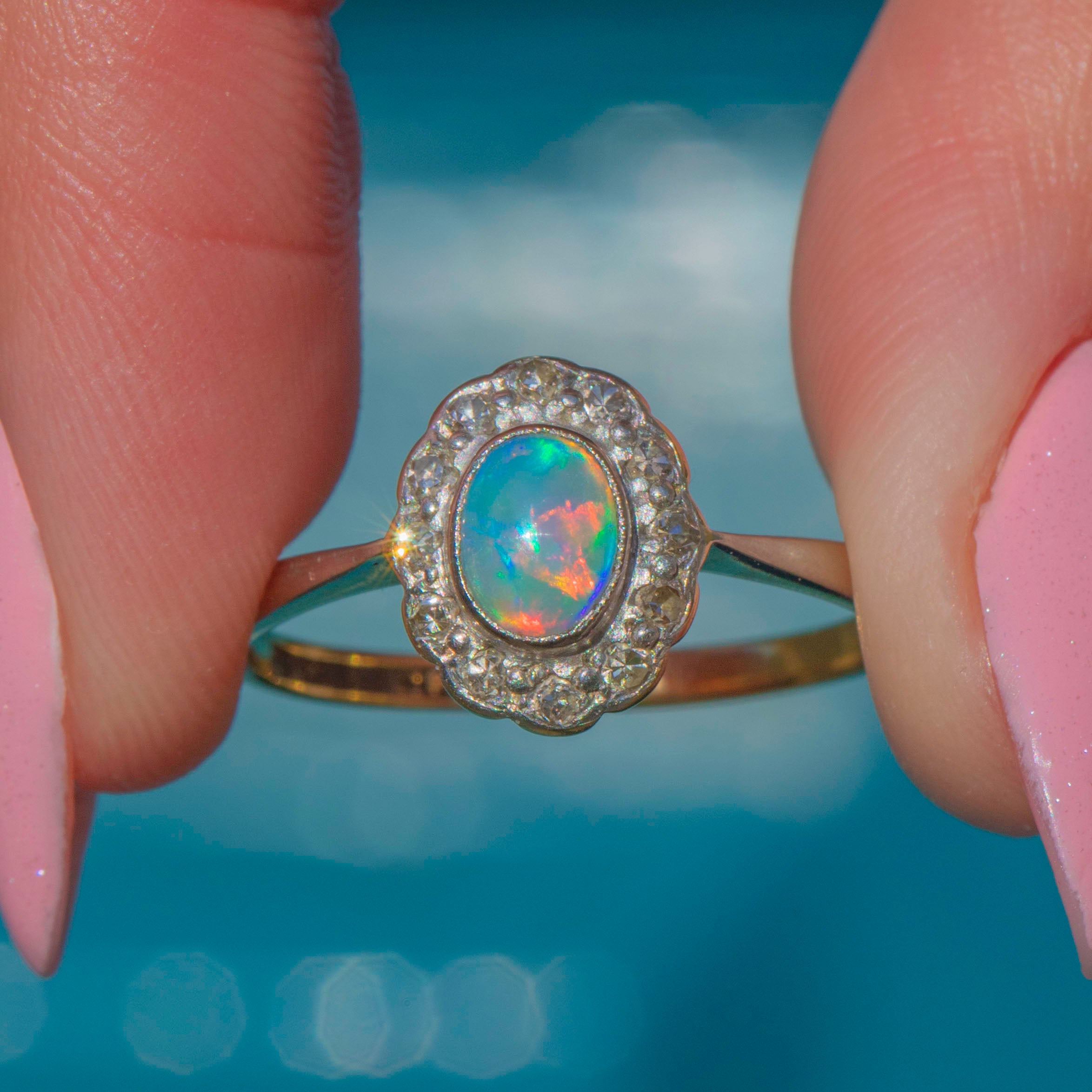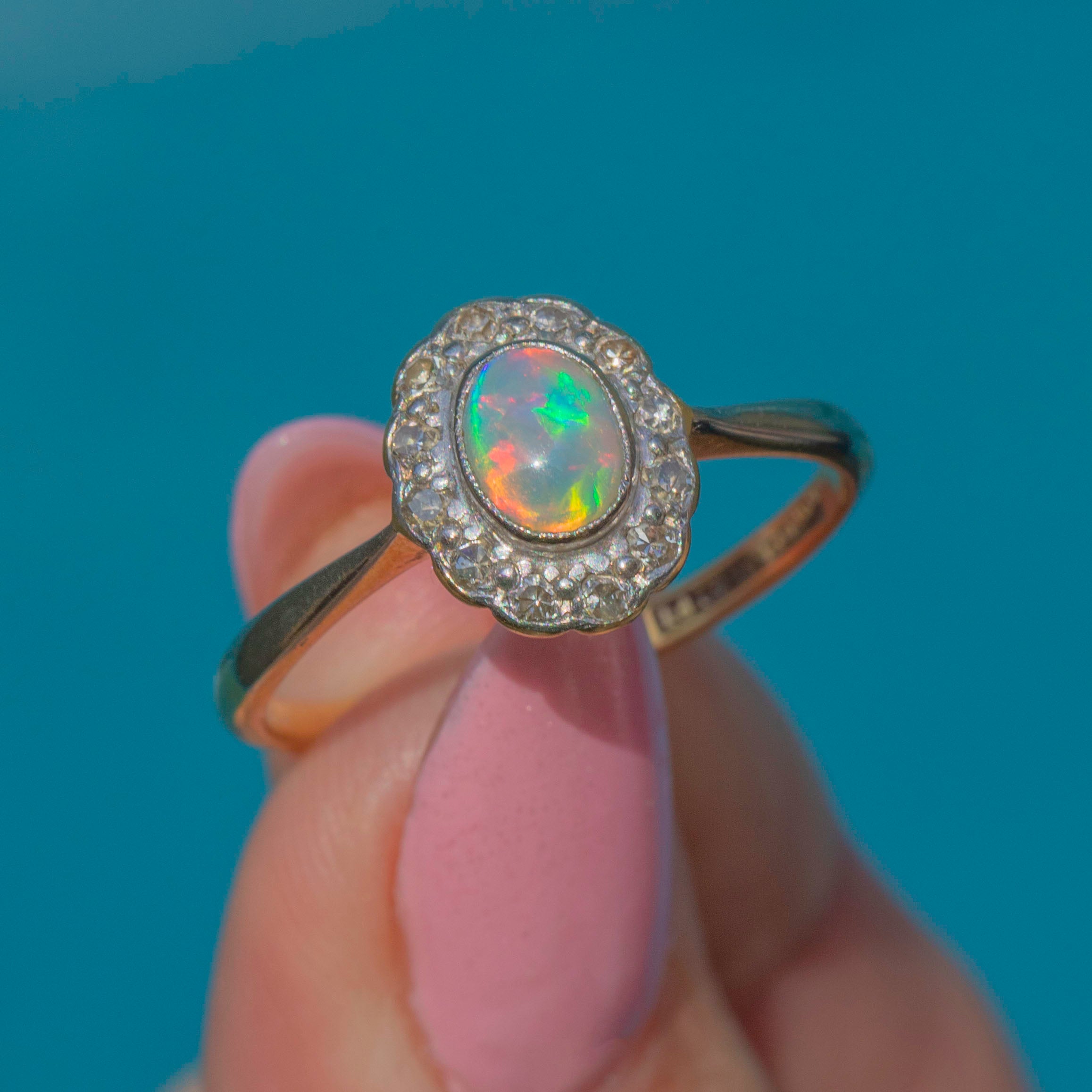 EXCELLENT: This Art Deco 18ct Gold Opal Diamond oval cluster ring is in excellent condition. The Opal has a wonderful play-of-colour and is smoothly domed, with no visible chips or fleabites. The Diamonds are all present and securely set within bright Platinum. The Gold band is buttery and smooth, providing comfortable wear!