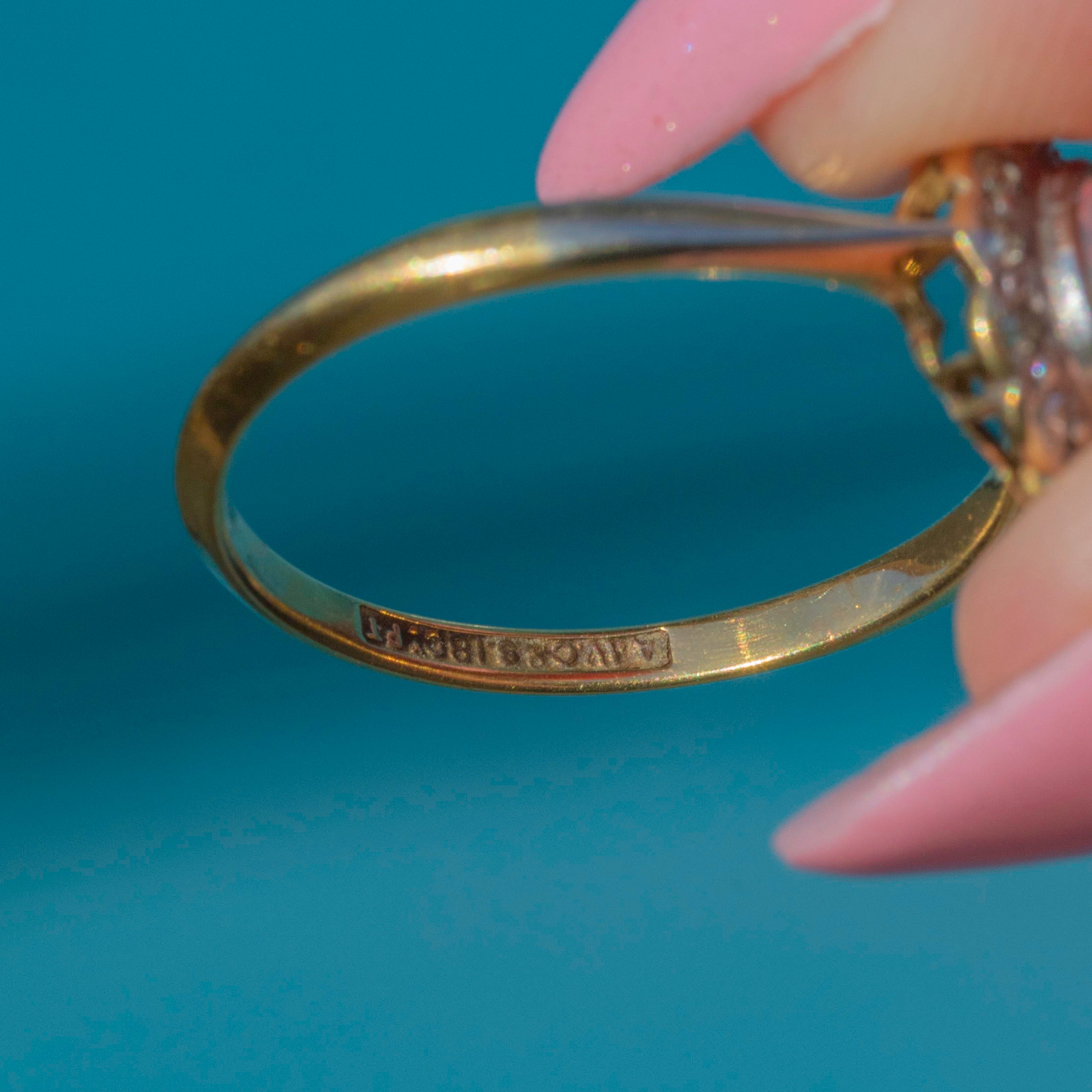 This enchanting Art Deco 18ct Gold Opal Diamond oval cluster ring will make a gorgeous addition to your collection! Exquisitely crafted from 18ct Gold, this antique ring boasts a glorious gemstone cluster displayed within lustrous Platinum settings.