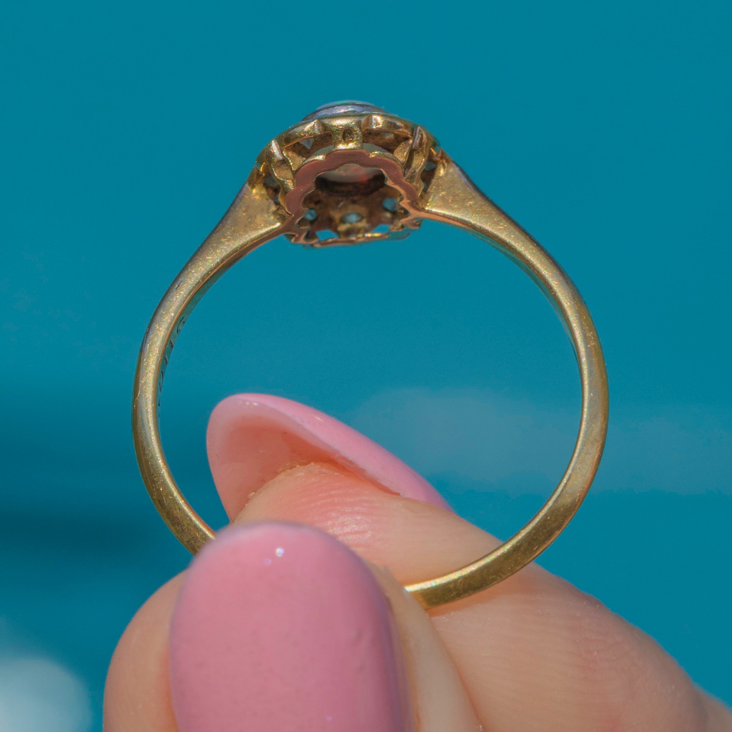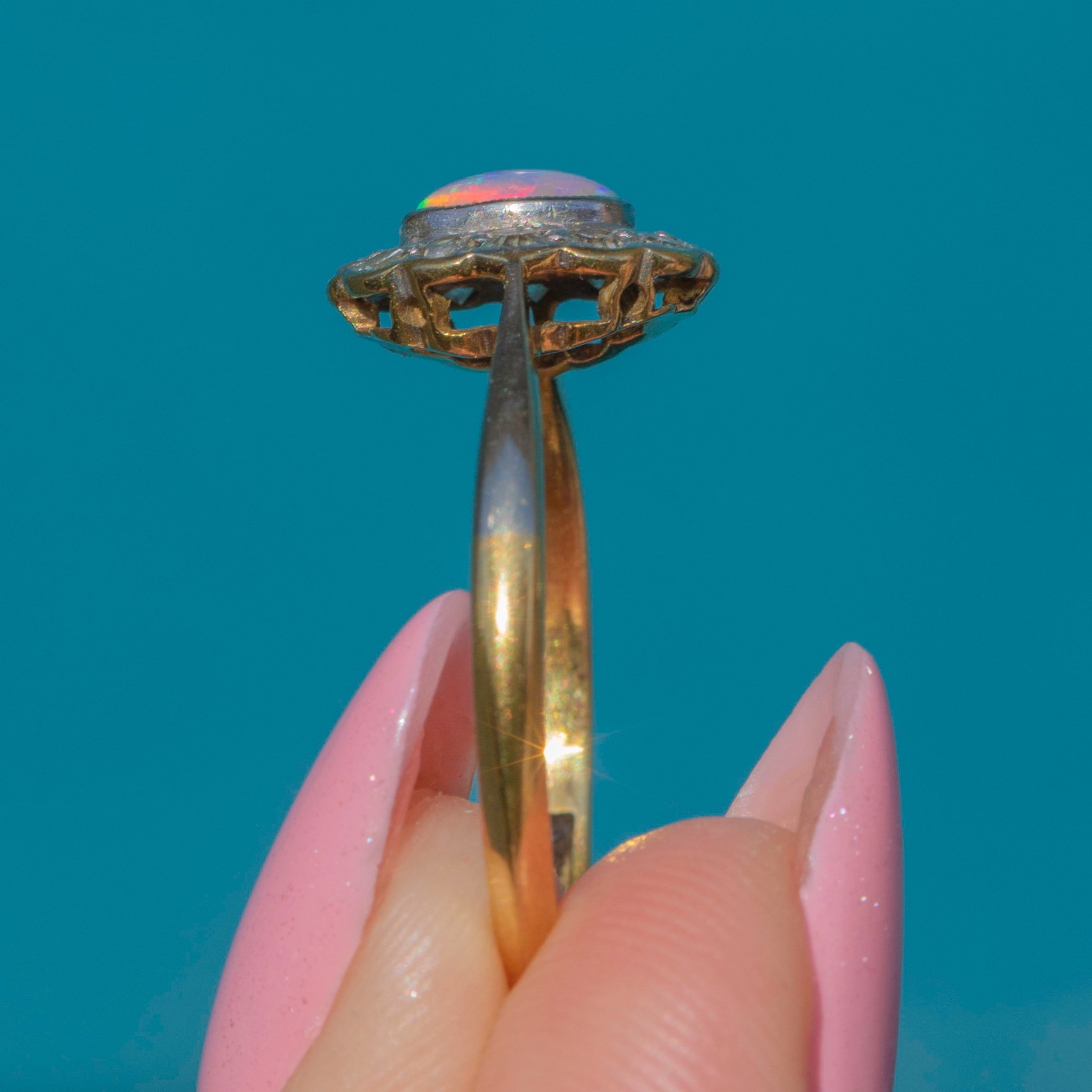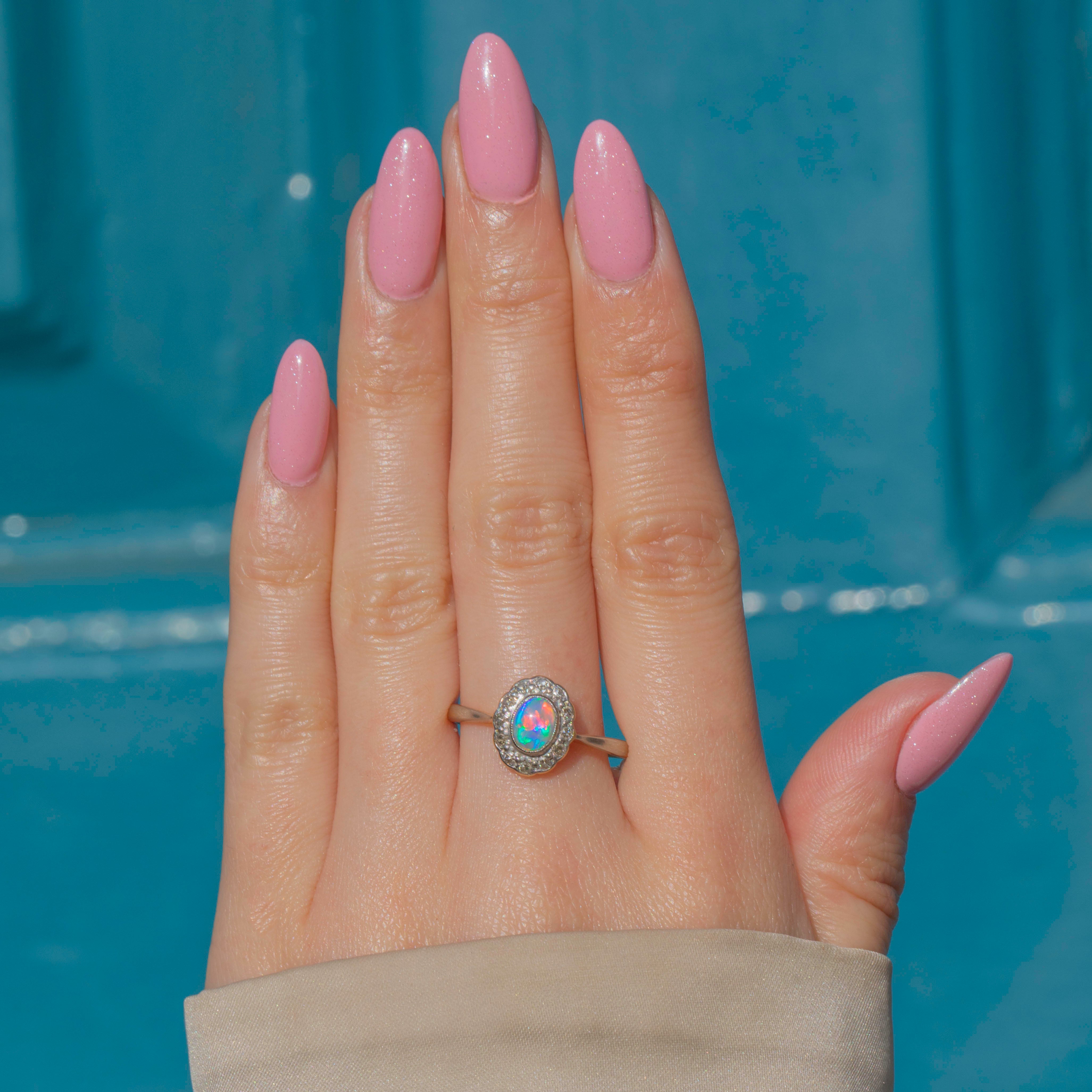 The natural and solid 0.42ct Opal cabochon bursts with vivid pastel pinks and purples, with zingy pops of neon green and yellow coming to life beneath the light. A dazzling halo of dainty Diamonds encircles the central Opal, adding a twinkling accent to this striking Art Deco ring!