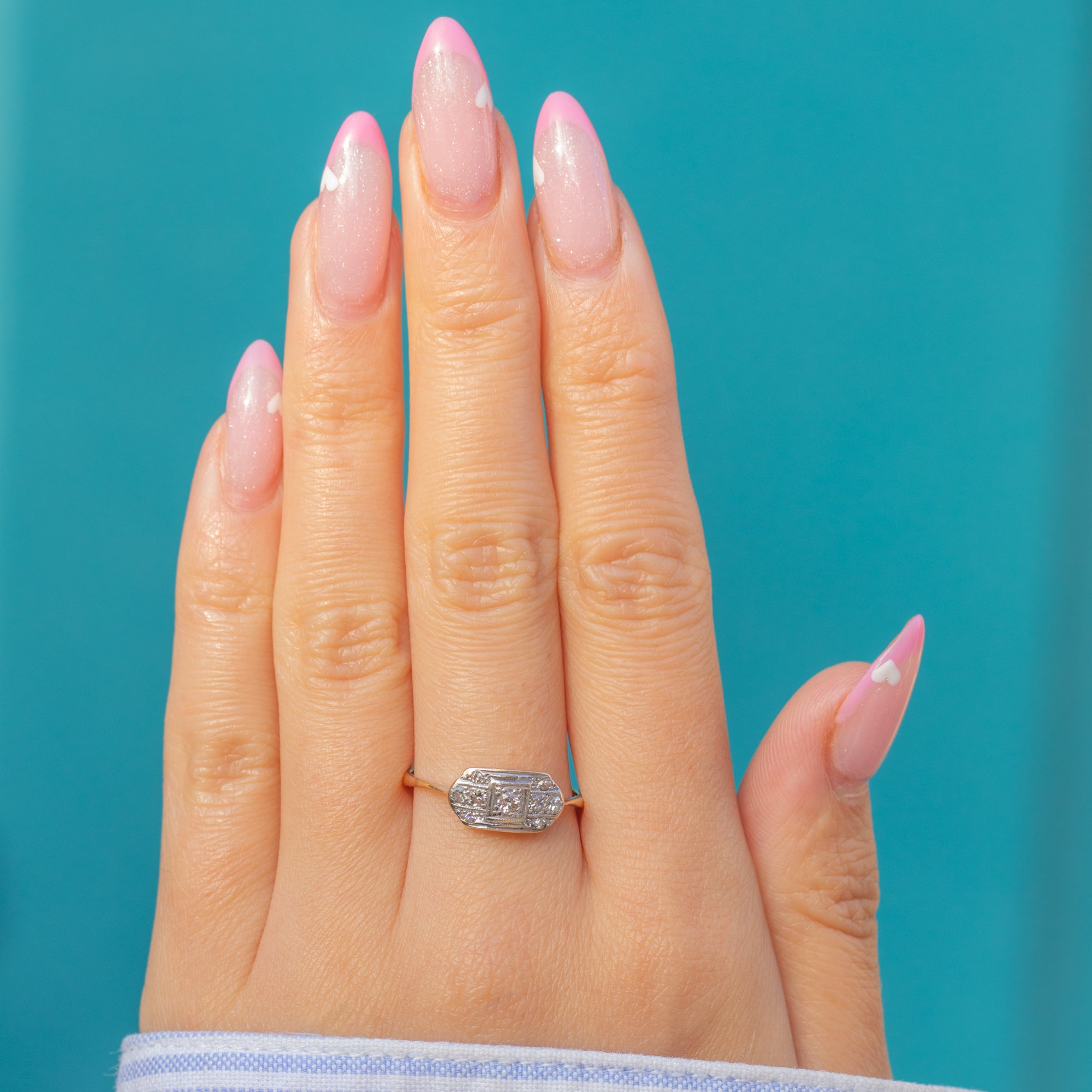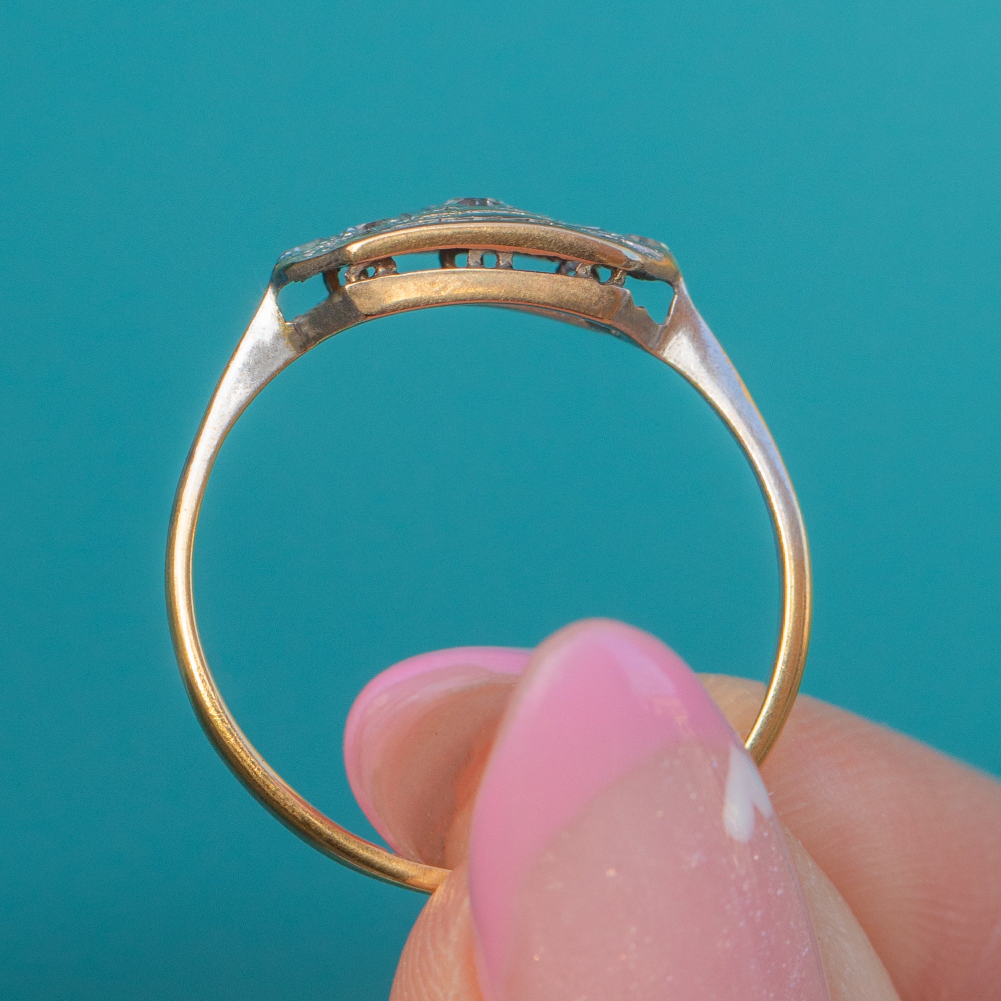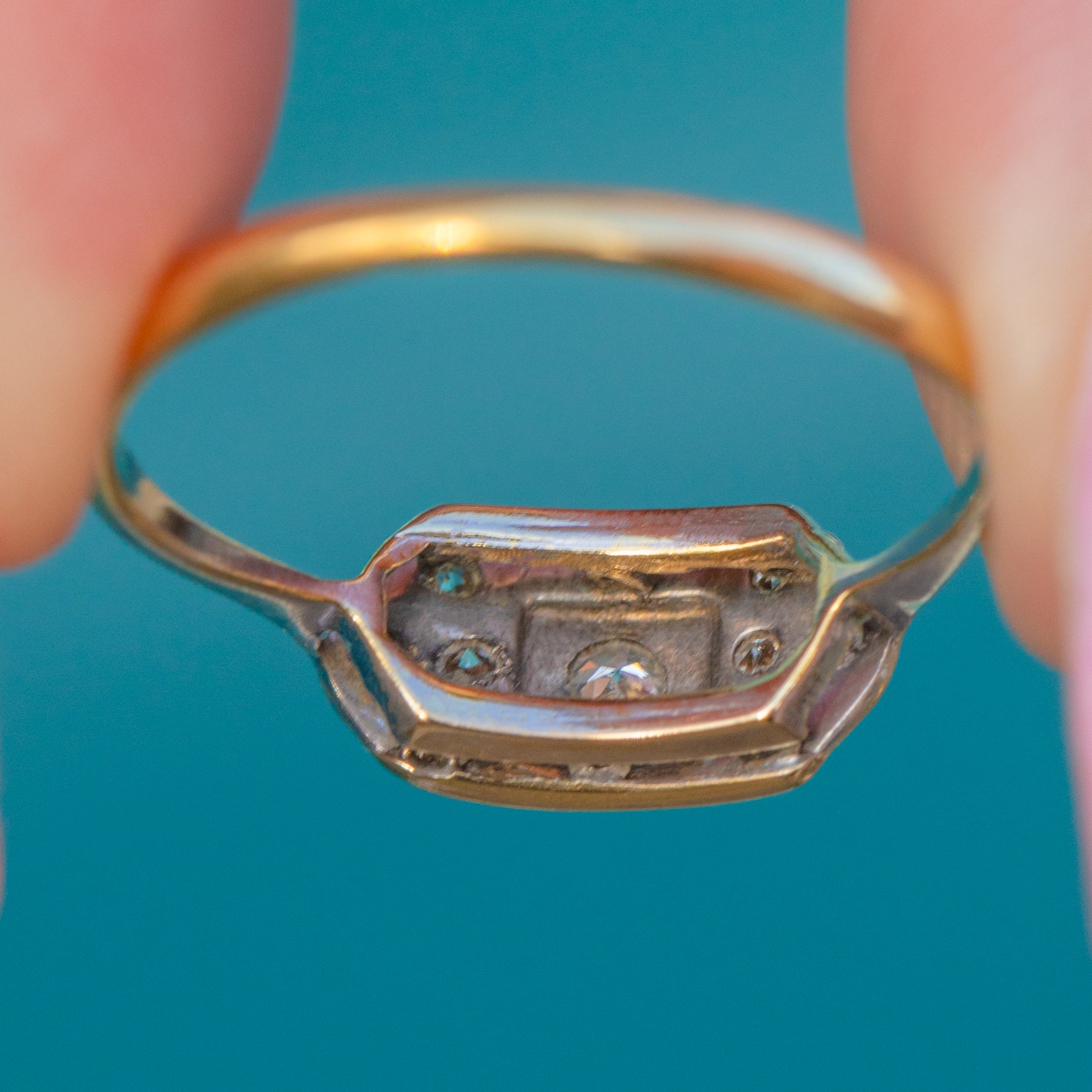 This elegant Art Deco ring showcases a refined geometric panel design, set with sparkling Diamonds in Platinum over an 18ct Gold band. The contrasting metals highlight the clean symmetry and precision craftsmanship so characteristic of the 1920s and 1930s.