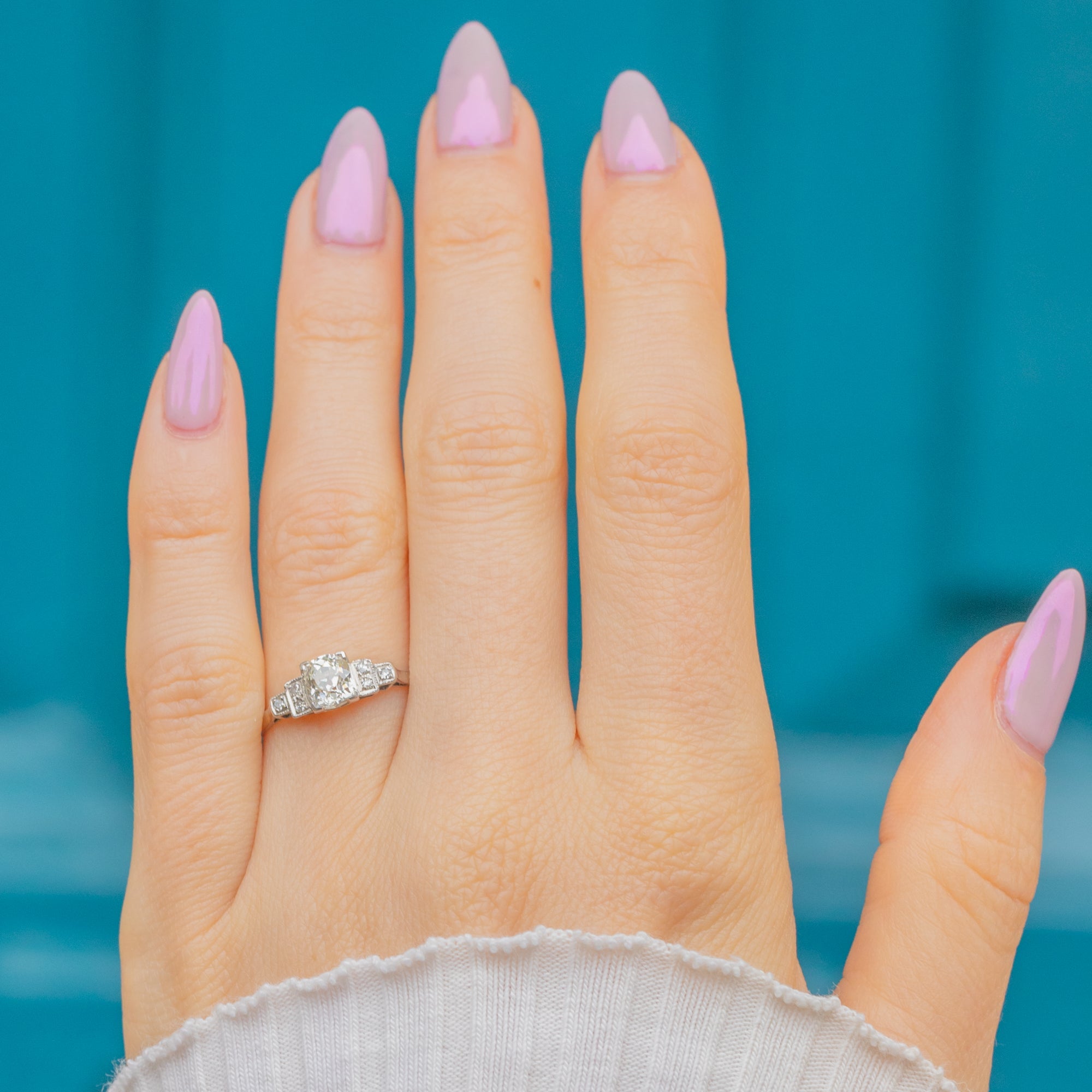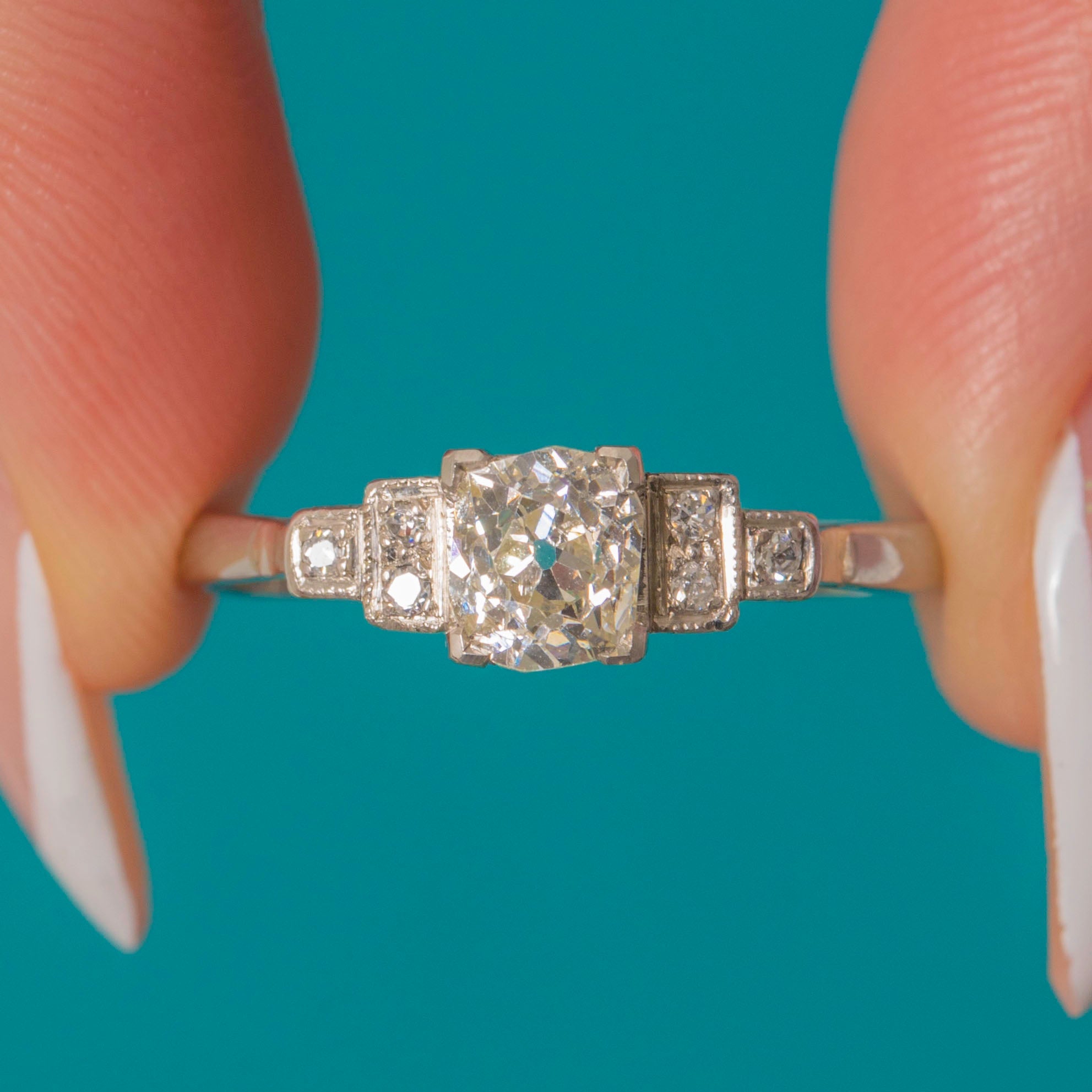 A breathtaking Art Deco engagement ring featuring a bright and fiery 0.70ct Old Mine-cut Diamond, framed by six pretty accent Diamonds in an elegant stepped Platinum design. The central stone displays the beautiful facets and crisp antique cushion shape typical of early old-mine cuts, with exceptional F/G colour and VS clarity.