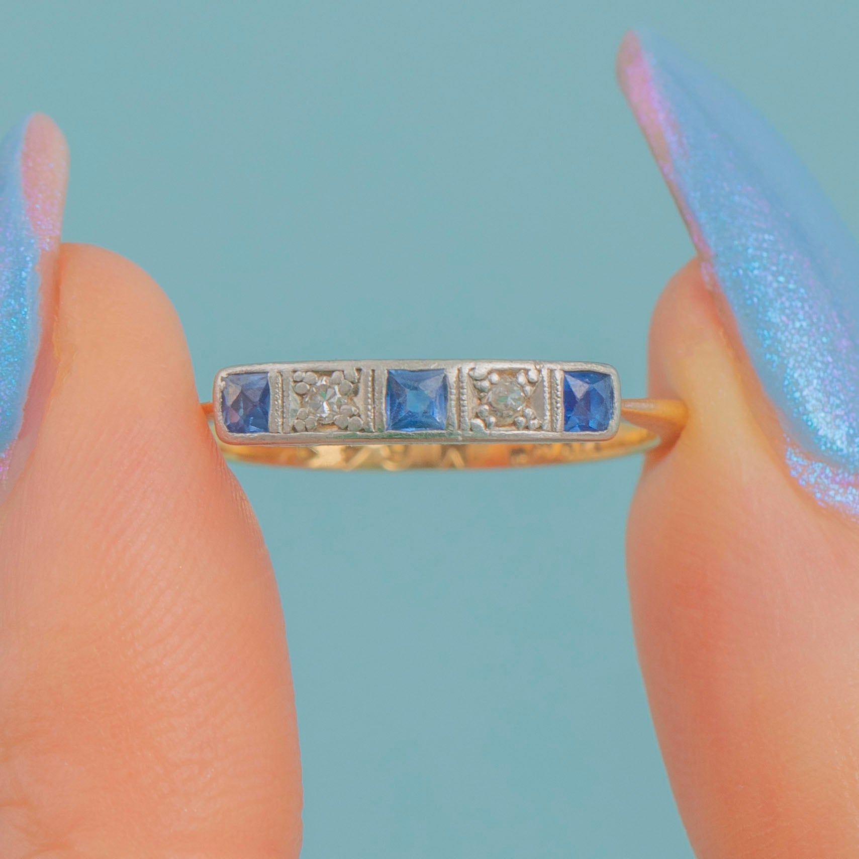 Art Deco 18ct Gold & Platinum Sapphire Diamond Five Stone Ring
