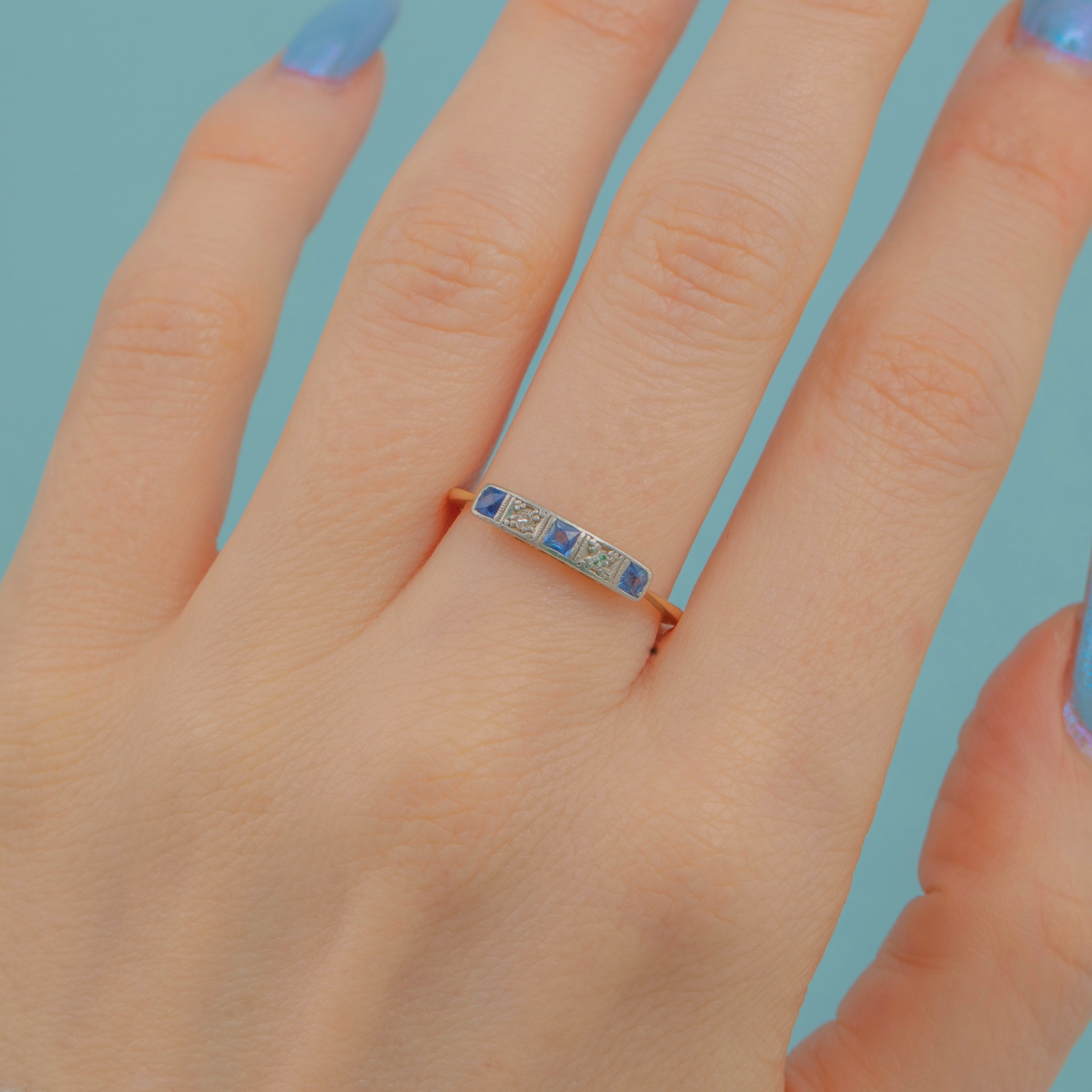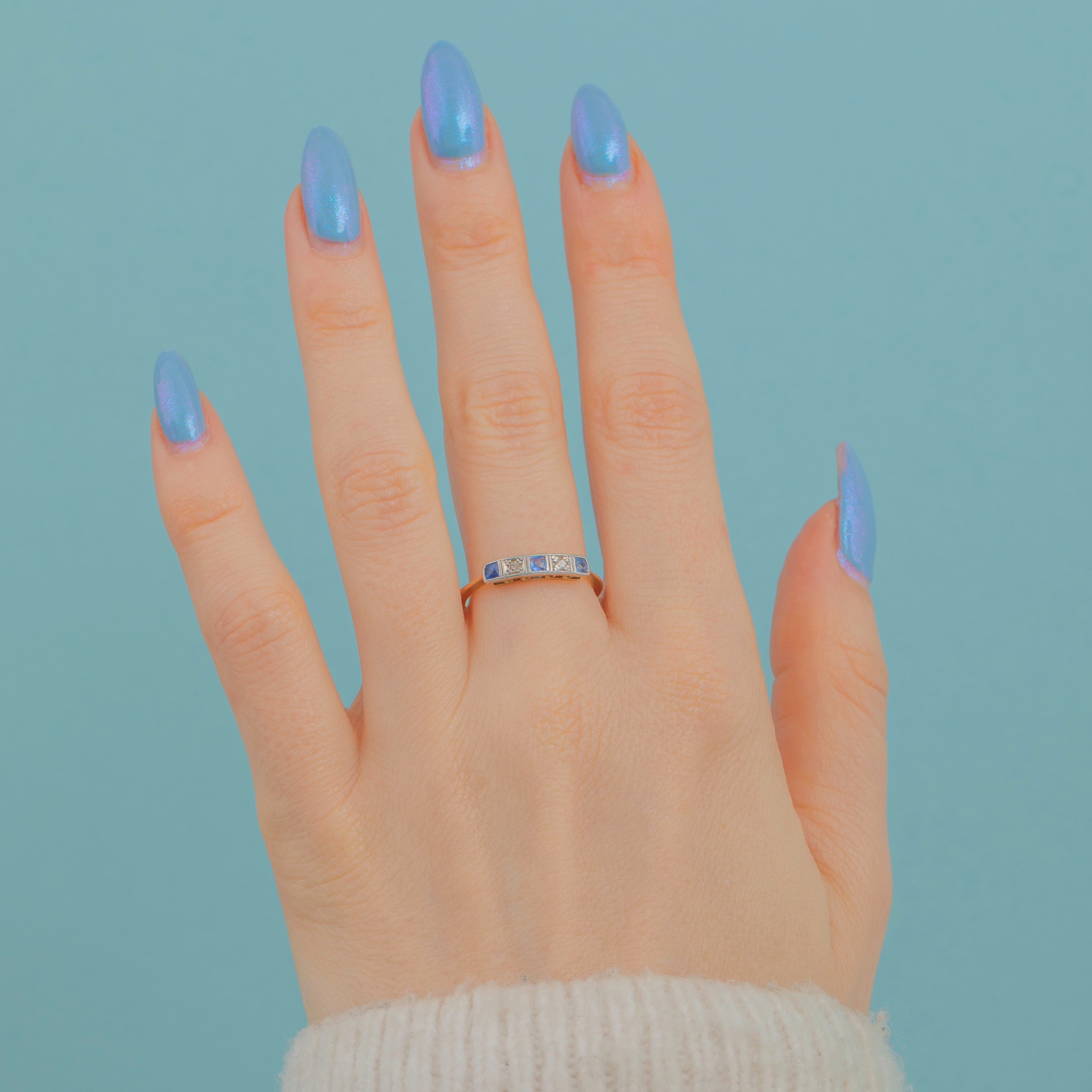 Featuring alternating French-cut Sapphires and Diamonds set in lustrous Platinum, this Art Deco ring offers a lovely twinkle as she catches the light. Her petite size and Art Deco style gives her a sophisticated and elegant appeal - she would make a perfect choice for an engagement ring!