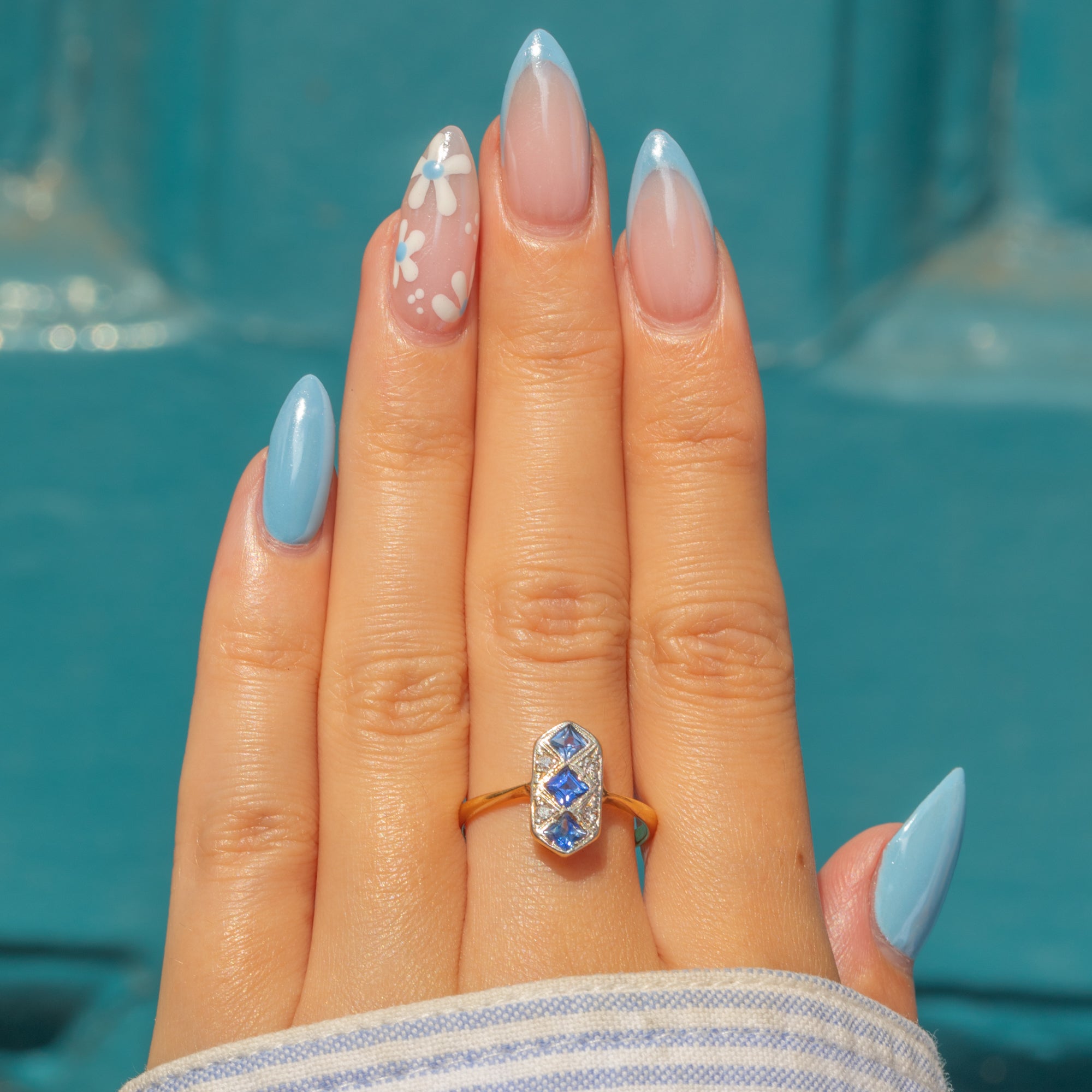 This antique ring flaunts three natural Sapphires, each radiating a bright true blue hue from their crisp facets. The Sapphires are flanked by four scintillating Diamonds, with each gemstone set in geometric Platinum settings for a refined and elegant finish.