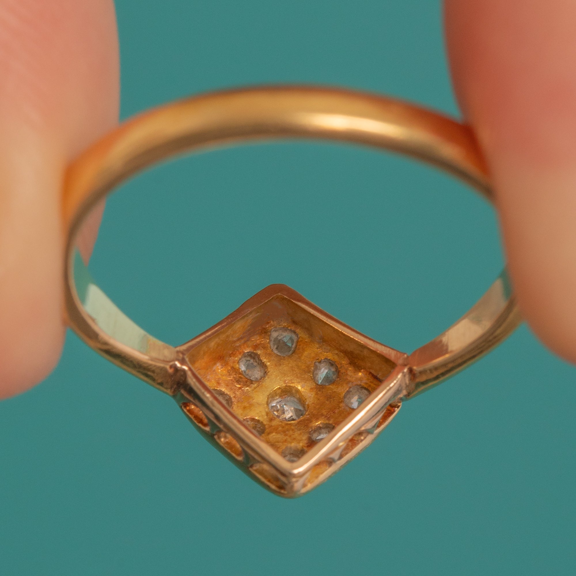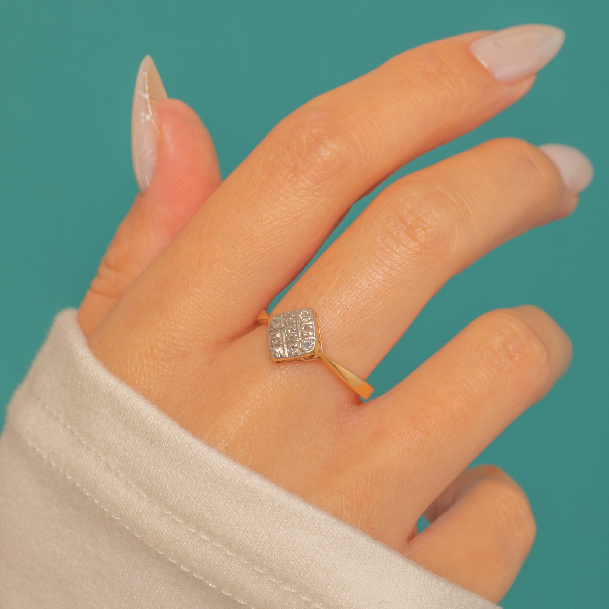 A delicate Art Deco treasure, this rhombus-shaped Diamond cluster ring pairs crisp geometry with exquisite finesse. A petite lozenge plaque is grain-set with bright, white Diamonds arranged in a tidy grid, framed by fine milgrain for a refined, velvety edge.