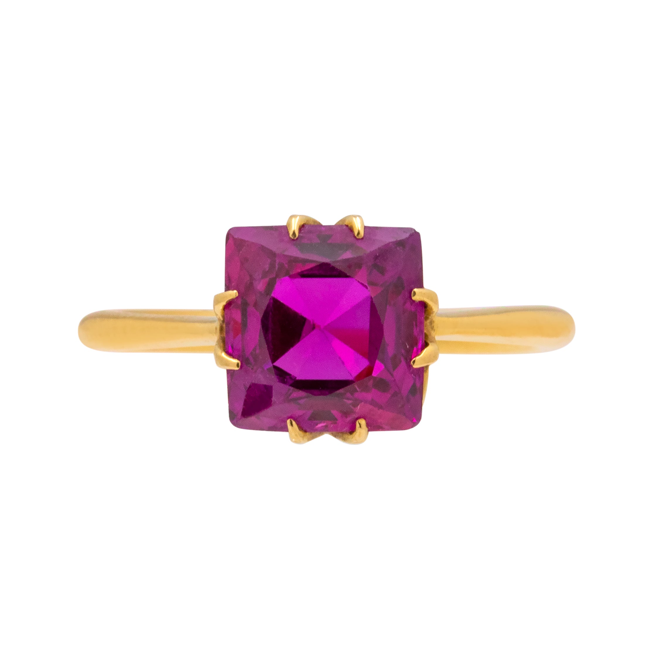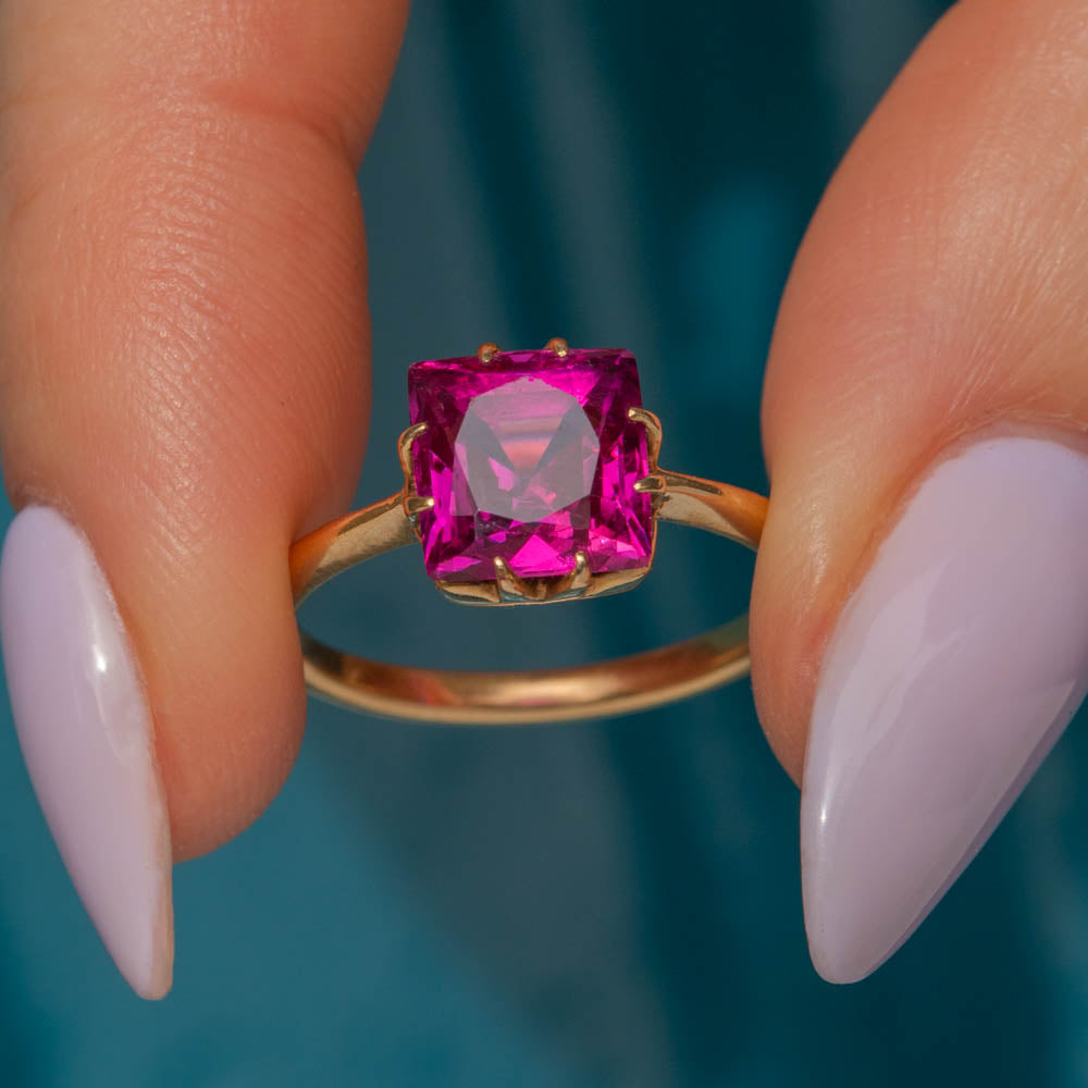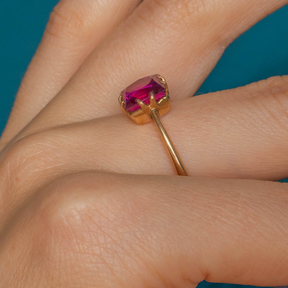 This antique 18ct Gold Ruby solitaire ring is fit for the jewellery box of Barbie! Her 3.15ct Ruby has hot fuchsia hues dancing between her facets, and with claw settings on each side, the light streams through from every direction.